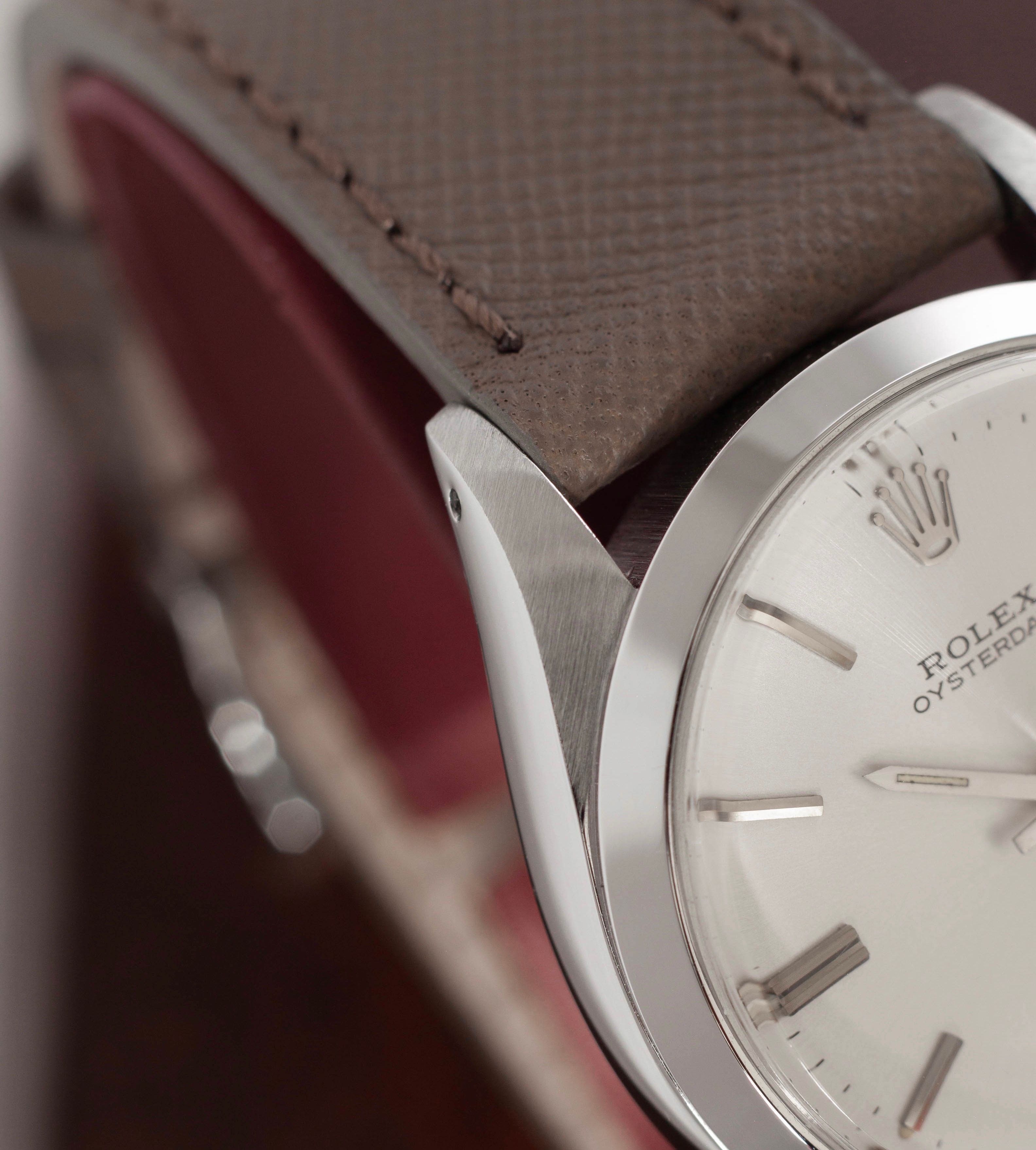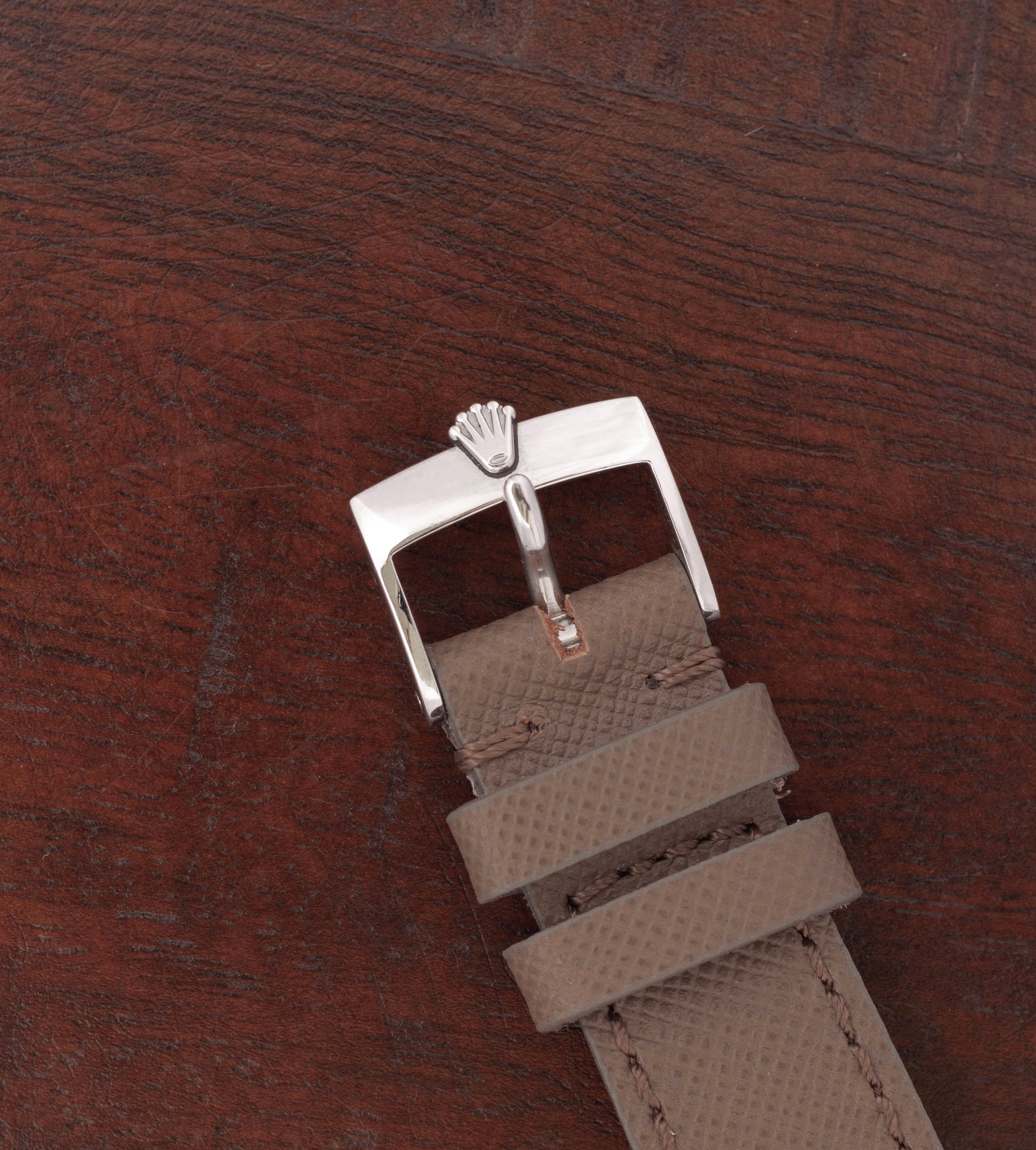 - Fitted with a new taupe-colored leather strap and Rolex buckle