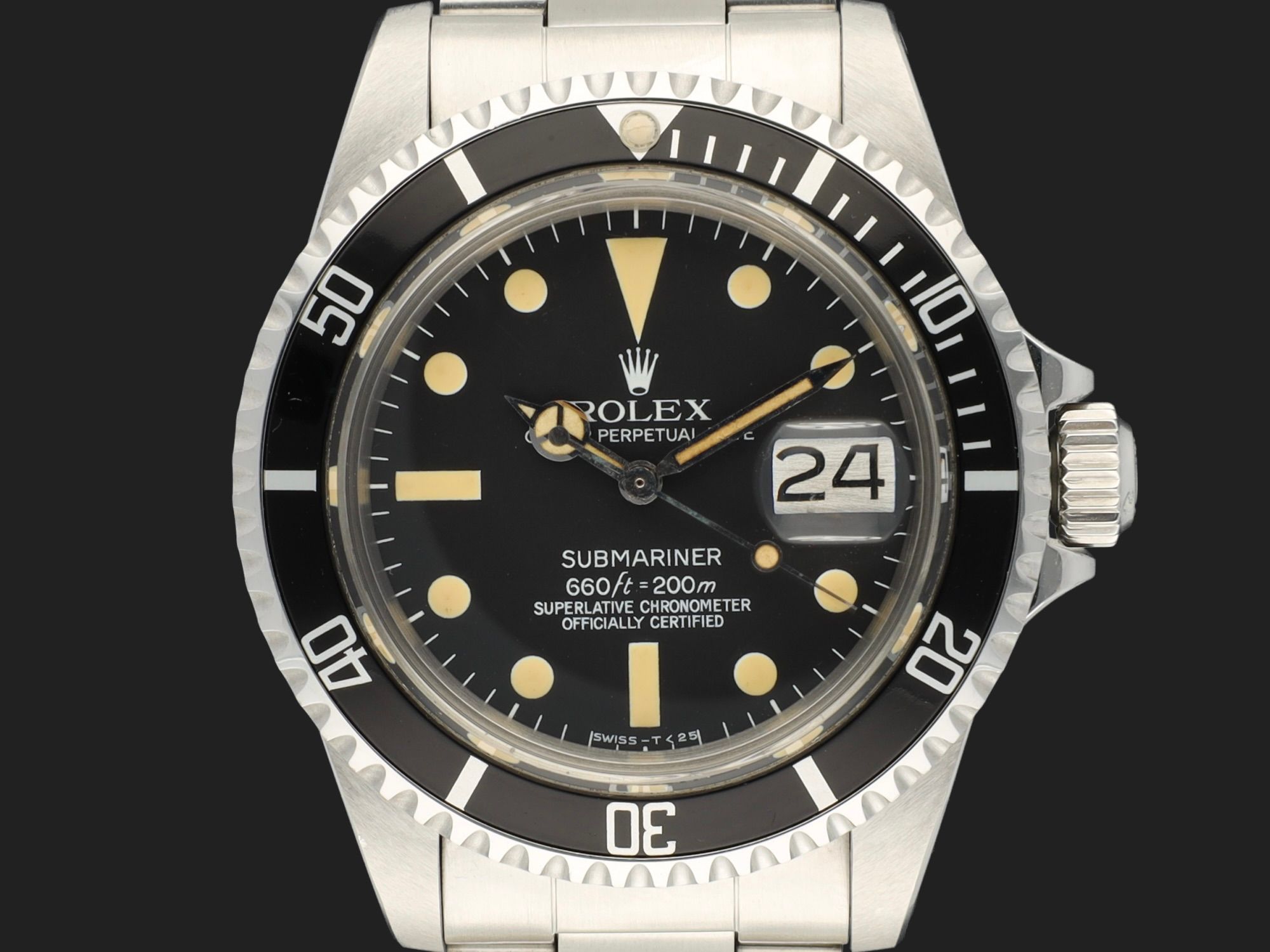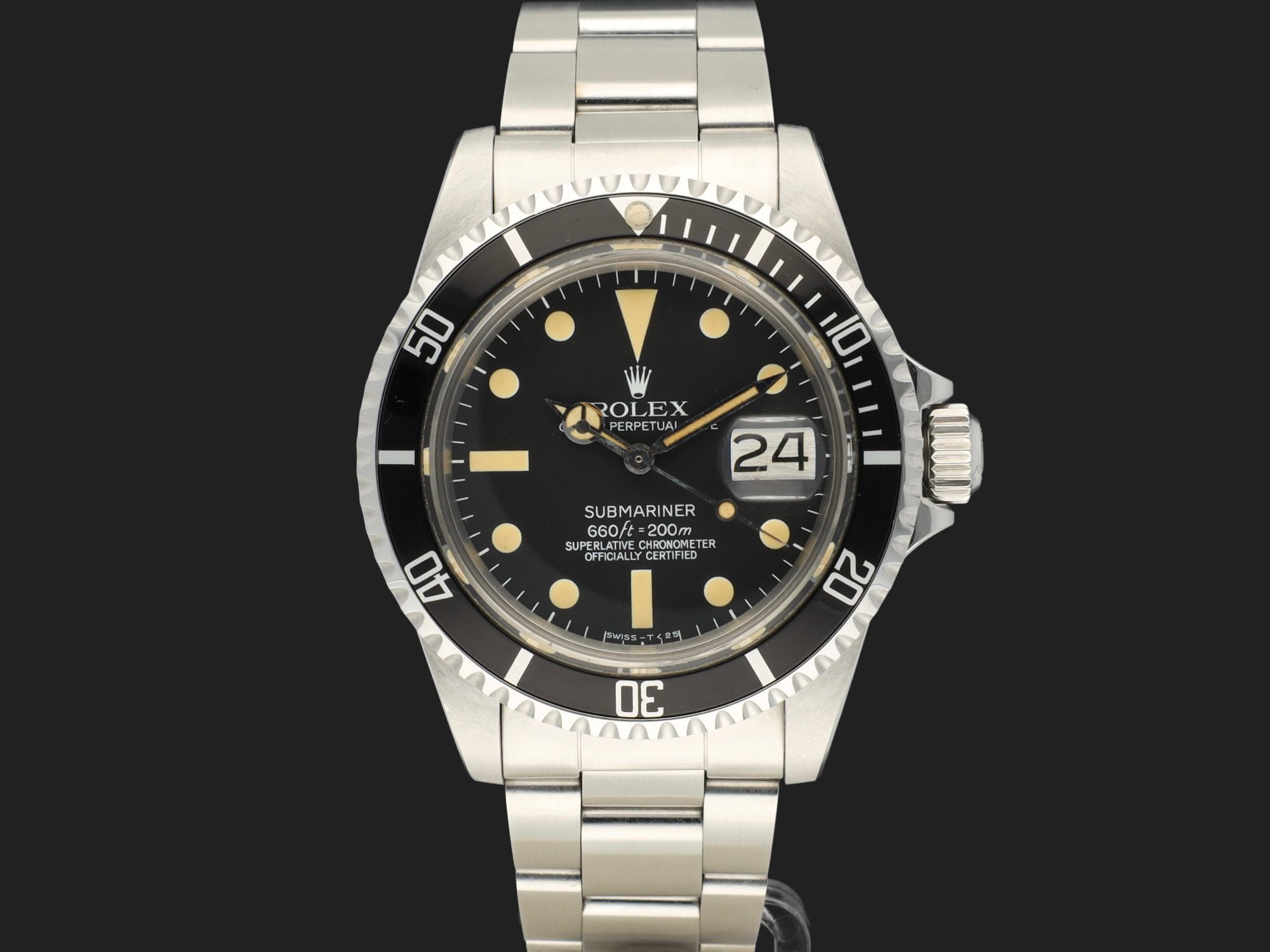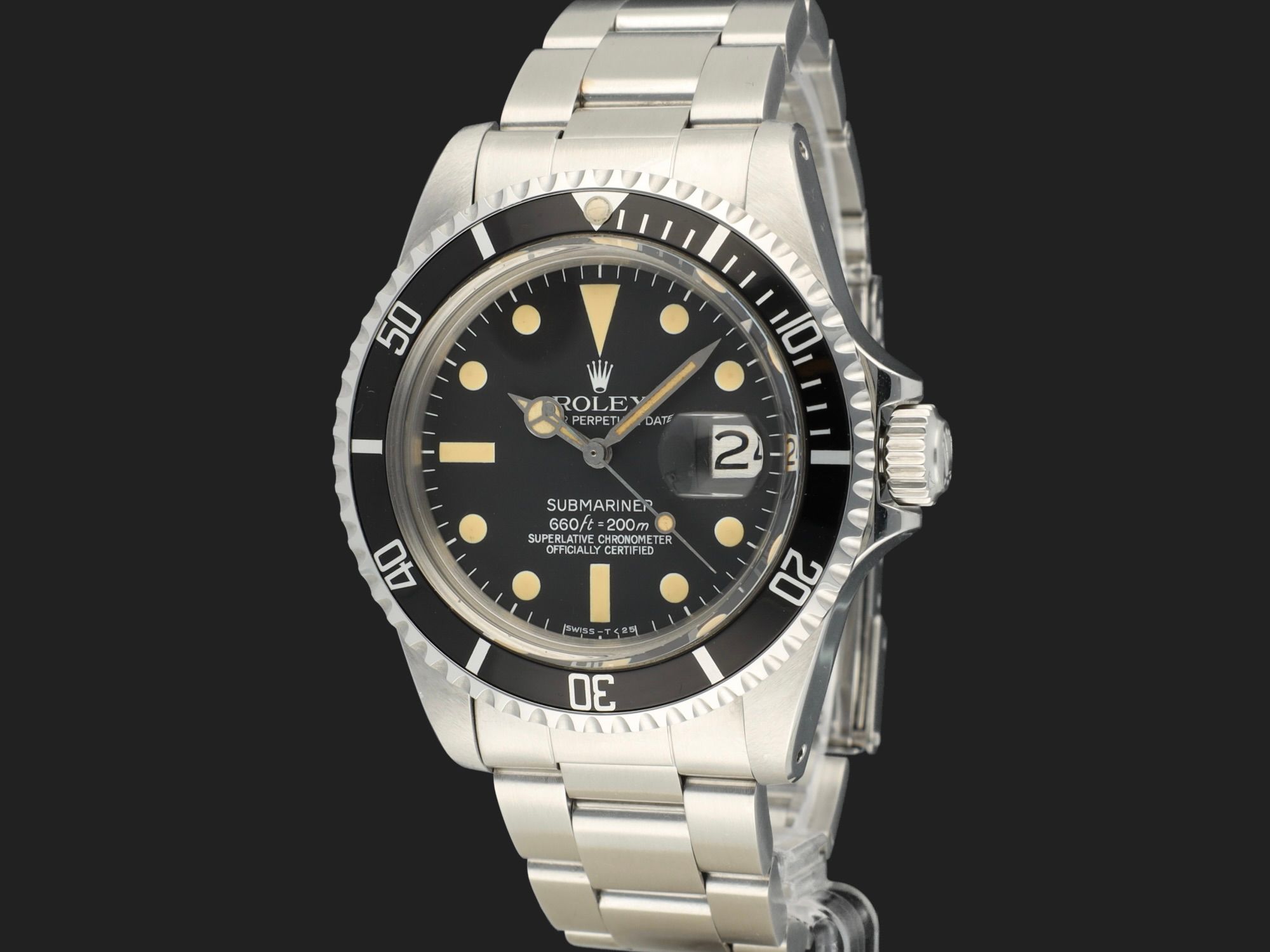 A matte Rolex Submariner 1680 Date with a beautiful MK2 dial, featuring creamy patinated hour markers and a matching set of hands.Silver date disc, fantastic unpolished case with original facet edges and brushing.