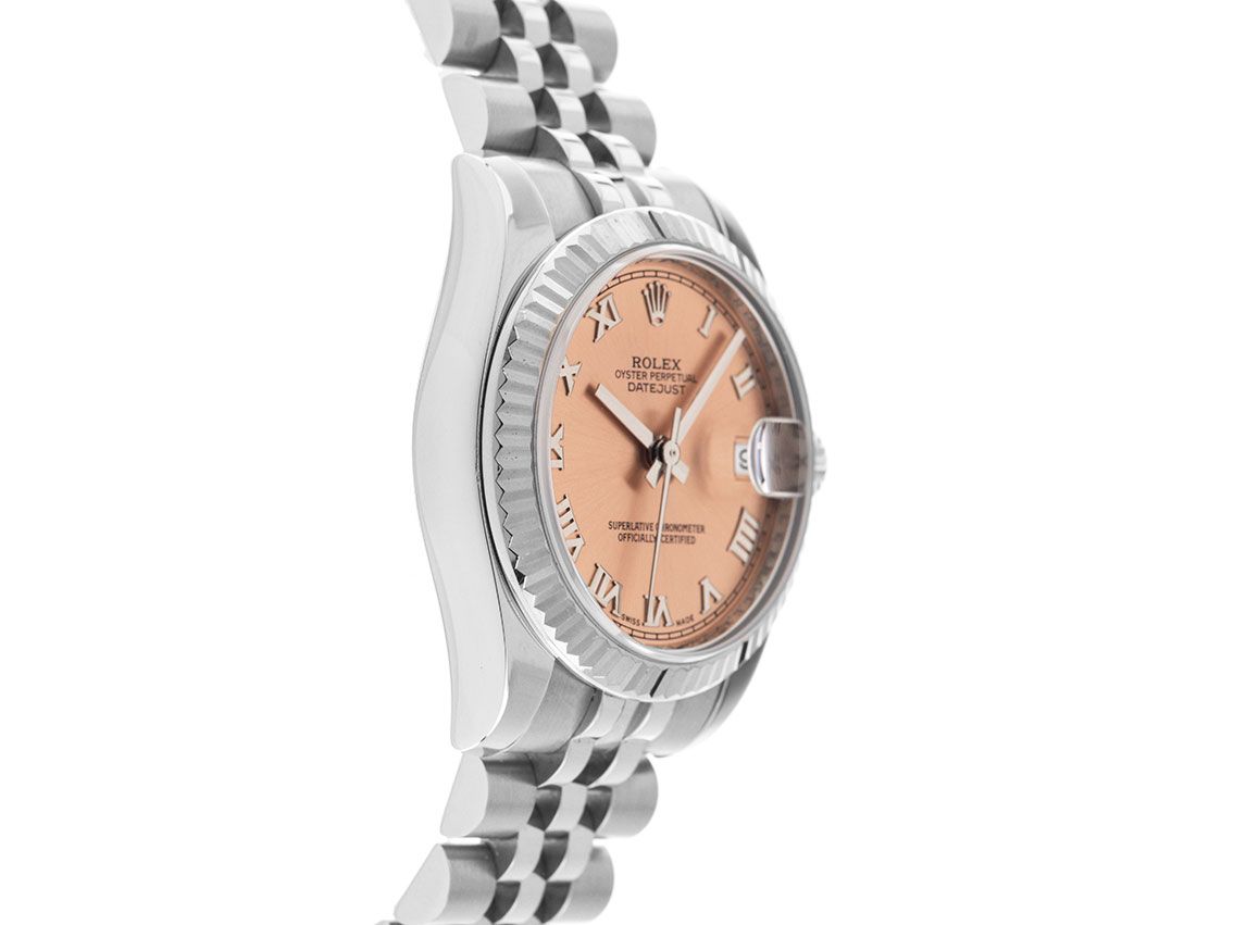 Kast van gepolijst en satijn afgewerkt staal, kastdiameter zonder kroon 31mm, kasthoogte 10,6mm. Lünette van 18kt witgoud, geribbeld en gepolijst. Jubileearmband van gepolijst en satijn afgewerkt staal, Rolex vouwsluiting met fabrikantlogo. Wijzerplaat in rosé met opgezette witgouden Romeinse cijfers en witgouden wijzers. Automatisch uurwerk, chronometer, Rolex manufactuurkaliber 2235 met 31 edelstenen. Weergave van uur, minuut en seconde via centrale wijzers met seconde-stop voor nauwkeurige tijdinstelling, datumweergave met snelle instelling onder vergrootglas bij 3 uur. Saffierglas, krasbestendig. Schroefkroon met fabrikantlogo. Achterkant van staal, geschroefd. Gewicht van het horloge inclusief armband 85g, lengte van de armband inclusief kast 165mm. Referentienummer: 178274, kastnummer: 70C82XXX, bouwjaar kan vanwege het nieuwe Rolex ID-nummer vanaf 2015 niet precies worden genoemd, ID: P1399104000825H-9800, artikelnummer: 10000081992. Met gangcontrole en volledige uiterlijke opfrissing van augustus 2025. Originele Rolex doos met omdoos en beschrijving, leren mapje met Rolex Chronometer-zegel en uittreksel van het Watchregister van augustus 2025, The Watch Register certificaat / zonder vermelding (Internationale database voor verloren of gestolen horloges). Superscherpe aanbieding, investering met waardevermeerderingspotentieel, bijna niet gedragen. Als nieuw. Leveringstijd direct.