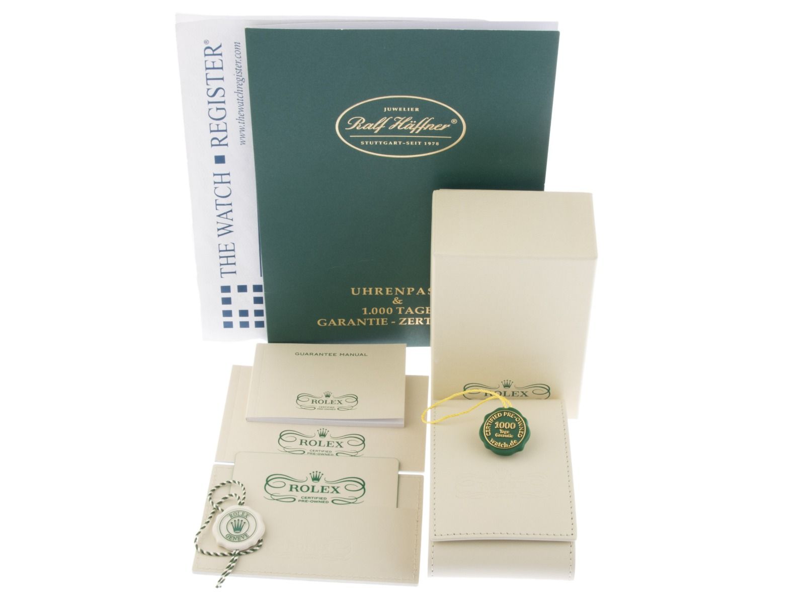 Inklusive certified pre owned Siegel / Uhrenpass mit einem Farbbild, der genauen Beschreibung sowie dem Wiederbeschaffungswert der Uhr über 8900,-€ und 1000 Tage Garantie ab Kaufdatum.