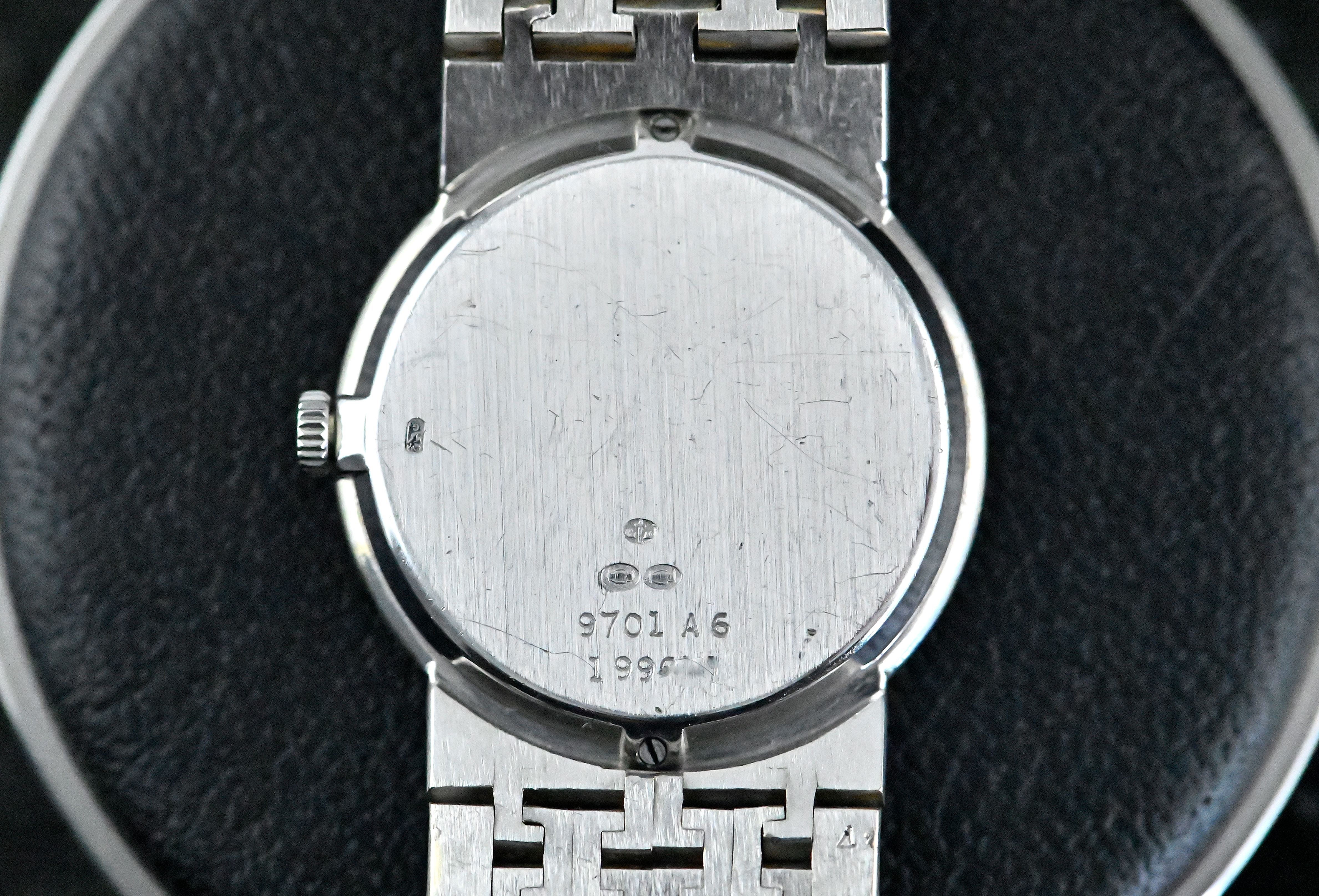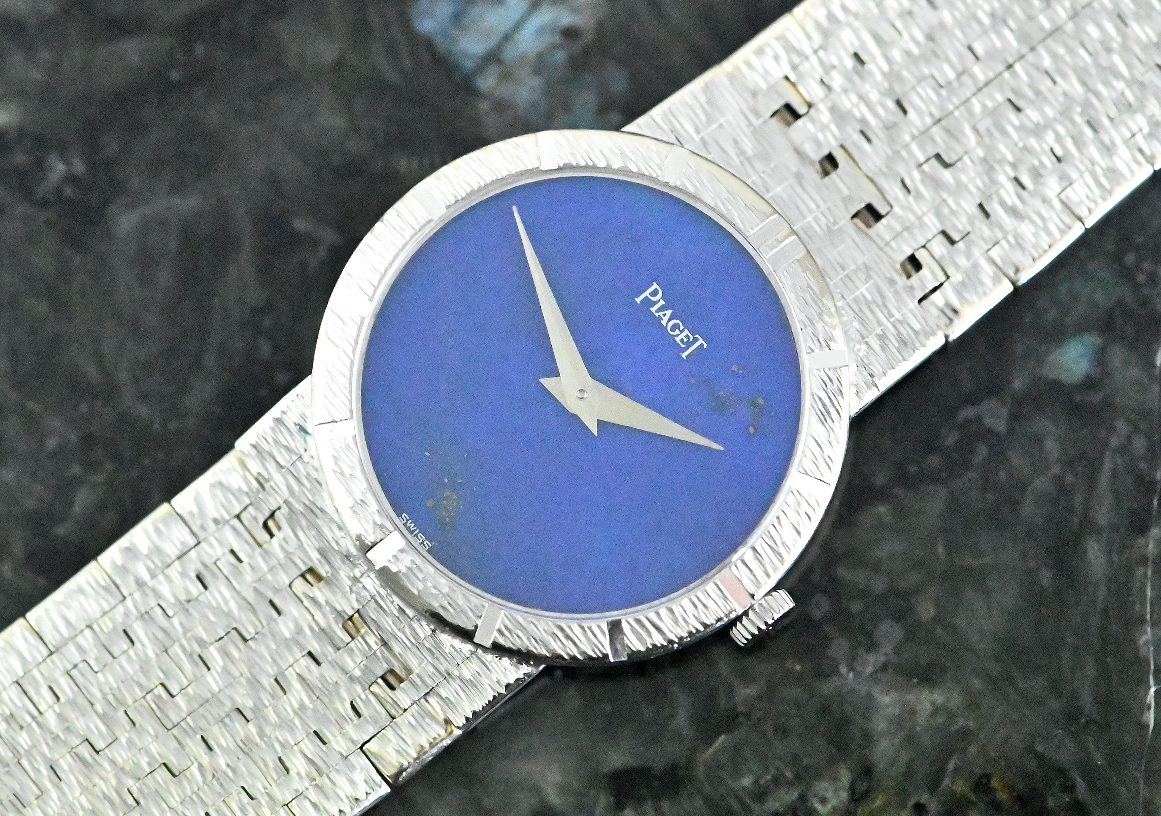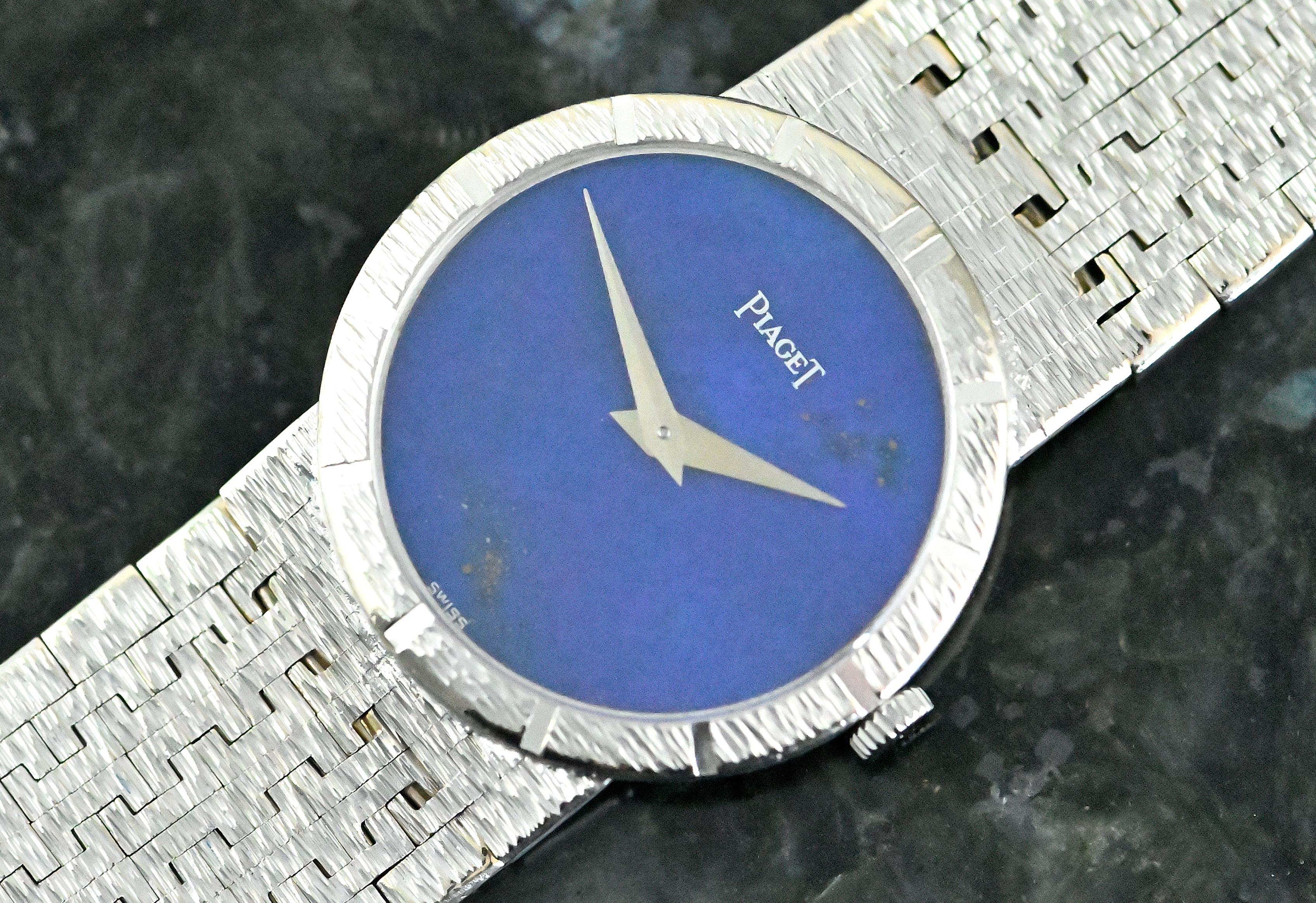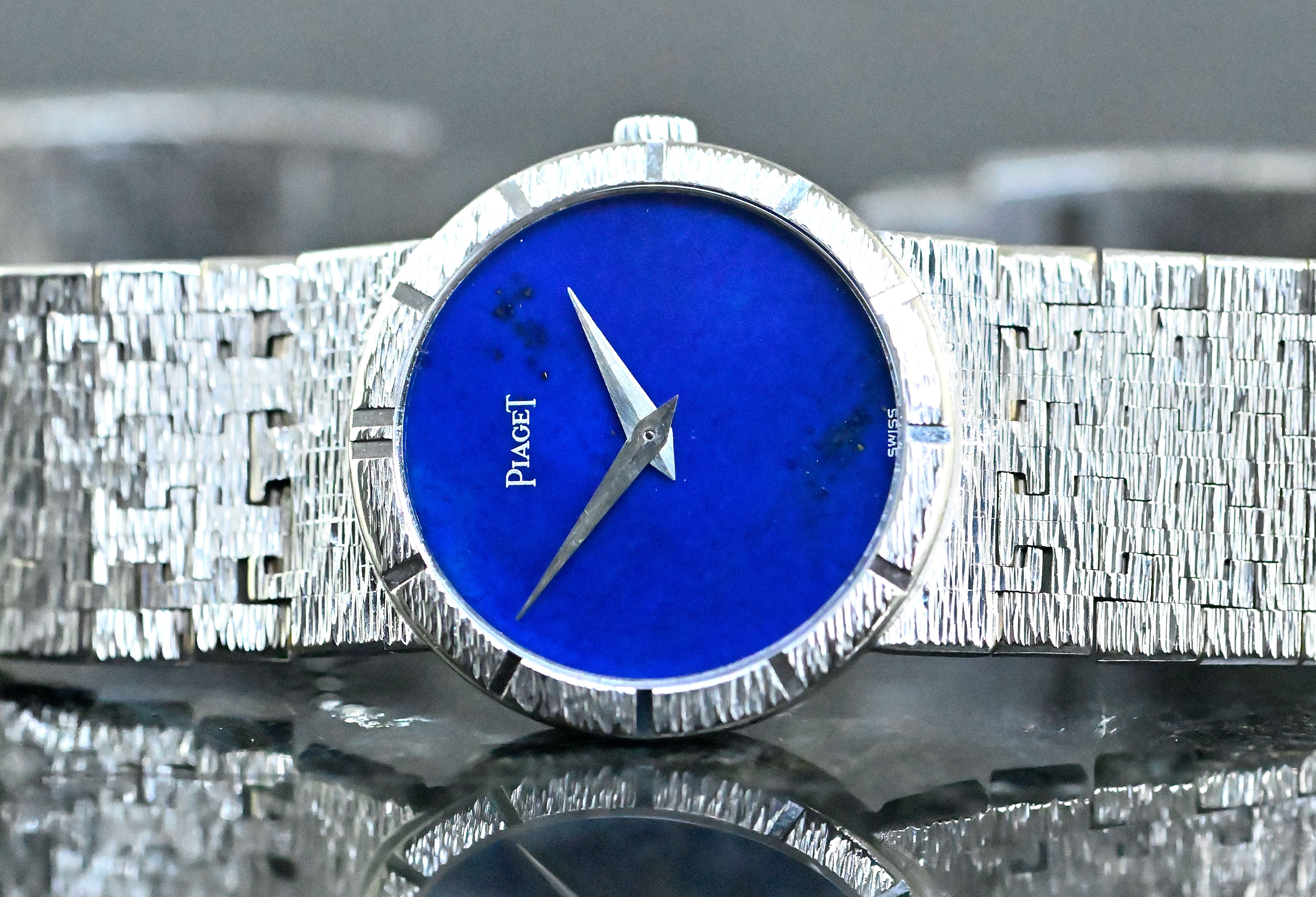 Rare Piaget vintage dress watch | reference 9701 A 6 | in 18k white gold | Piaget hand-wound calibre 9P | beautiful lapis lazuli dial with no cracks, chips or other visible damage | original Piaget gold bracelet with a jewellery clasp in 18k white gold | good condition with no major flaws or scratches | In November 2025, our master watchmaker performed a service, without refurbishing the case or bracelet | diameter of the case is 24 mm (without the crown) | total weight of the watch is approximately 54 grams | bracelet including the watch has a total length of approximately 16.5 cm can be shortened or lengthened by a good goldsmith if necessary.