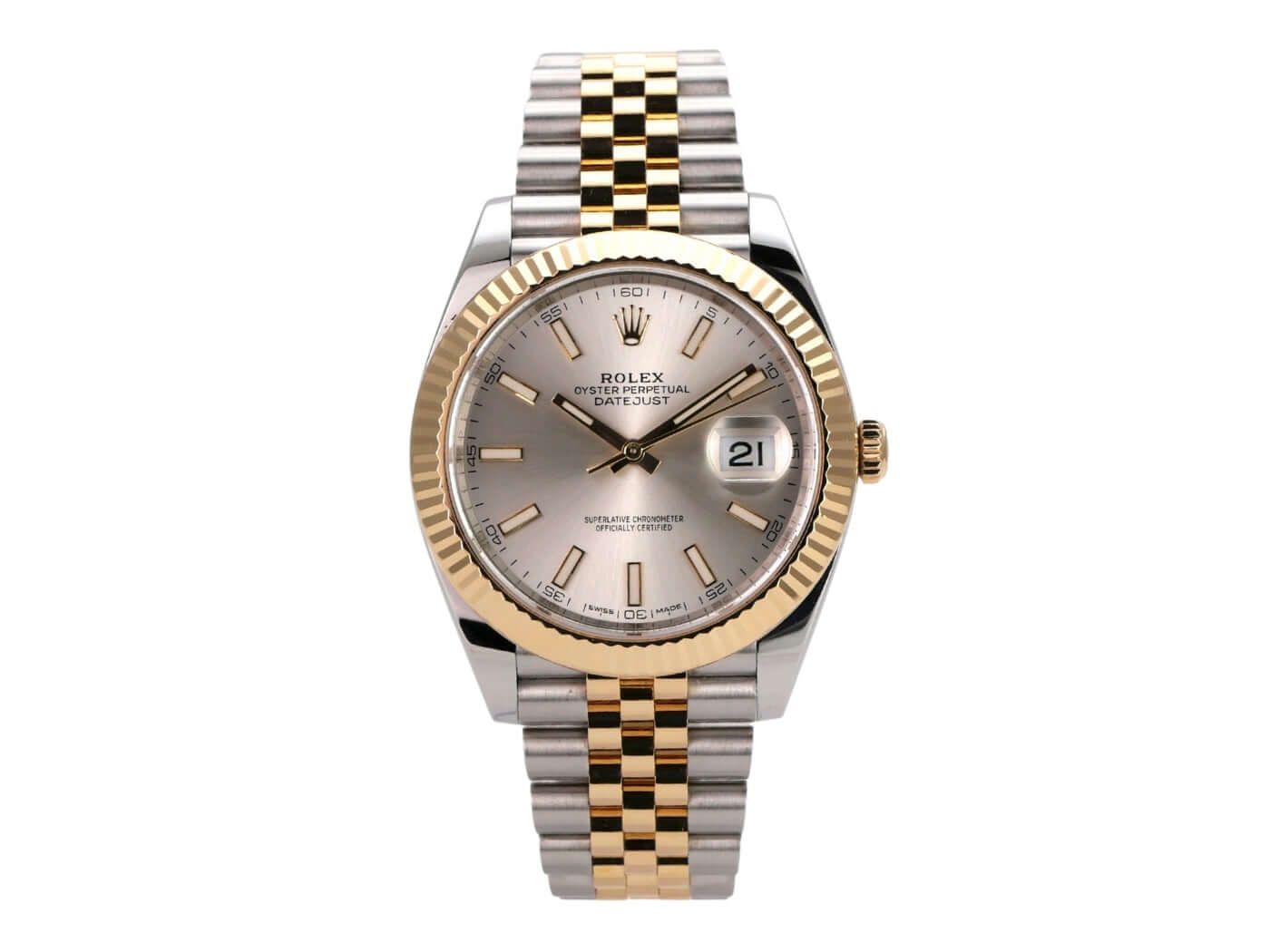 Rolex Datejust 41 Stainless Steel Yellow Gold Ref. 126333 Silver Jubilee BraceletCase made of stainless steel / yellow gold polished and satin-finished, case diameter 41 mm, fluted 18 kt yellow gold bezel, Jubilee bracelet made of stainless steel / 18 kt yellow gold polished and satin-finished with folding clasp, silver-colored dial with 18 kt yellow gold luminous indices, automatic movement, Rolex manufacture caliber 3235, 70 hours power reserve, date display, chronometer, scratch-resistant sapphire crystal, screwed 18 kt yellow gold crown, screwed stainless steel case back, water-resistant up to 10 bar.