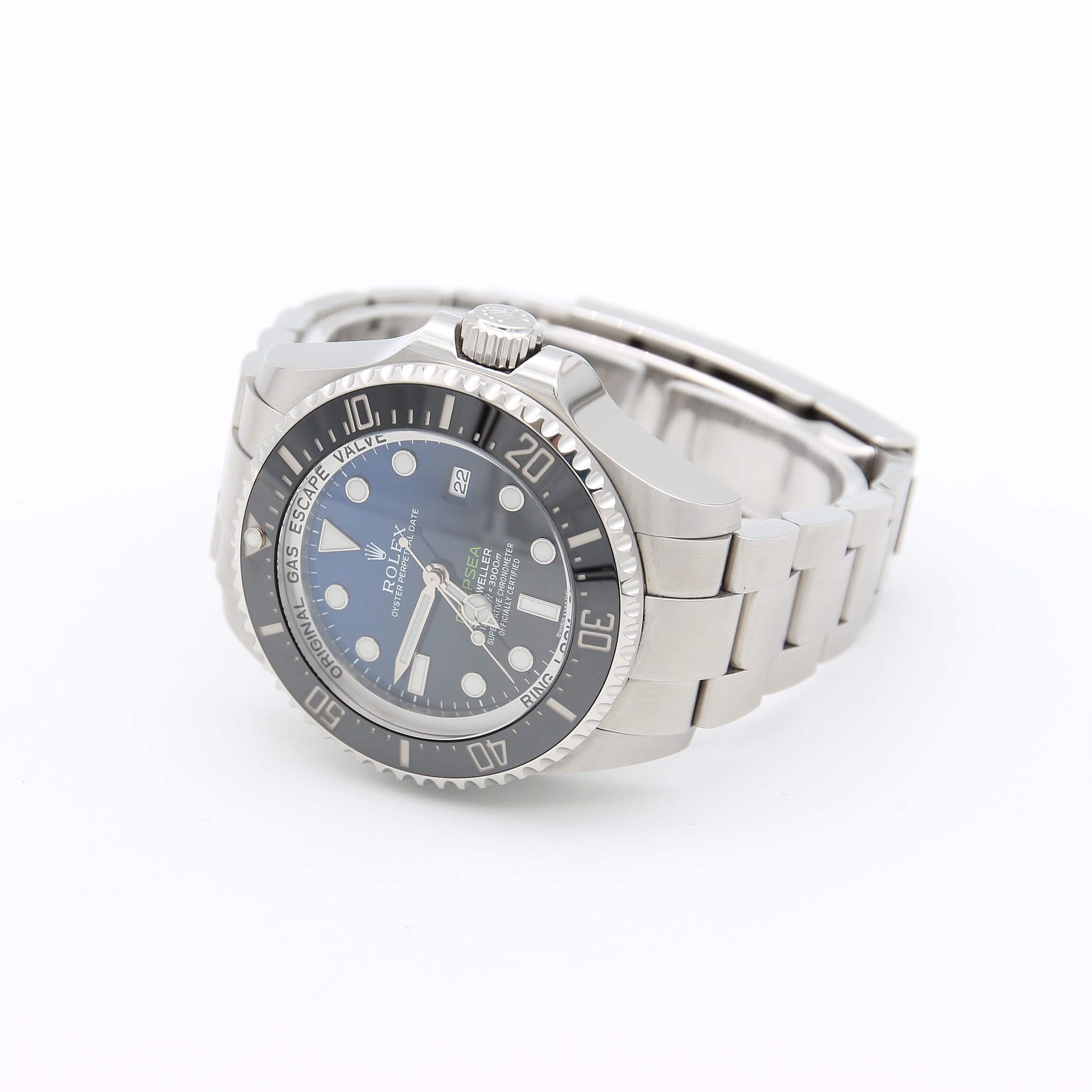 For sale: pre-owned Rolex Deepsea Sea-Dweller D-Blue Dial ref. 116660 a.k.a James Cameron, with full set. With a diameter of 44mm, 48mm when you include the oversize crown, it stands some 17.7mm high. In 2008, Rolex introduced the Deepsea, the culmination of the brand’s long relationship with the planet’s underwater pioneers and a dive watch that rewrote the rulebook on what could be achieved.Sealed tight to a depth of 12,800ft (3,900 meters), it could accompany on a trip to visit the Titanic’s final resting place and come up smiling. The Rolex Deepsea Sea-Dweller ref. 116660 D-Blue dial was the perfect release to commemorate James Cameron’s historic solo dive documented on National Geographic’s 'DeepSea Challenge 3D' film. For this particular solo dive, James Cameron was wearing a Rolex Deepsea during his expedition into the Mariana Trench. This two-color gradient dial celebrates one man’s journey to the deepest place on earth at the bottom of the Mariana Trench. The dial with an semi-glossy finish captures light like no other Rolex dial out there. The Mariana Trench, stretches in an arc around the Mariana Islands in the Pacific Ocean and is the deepest part of the world’s oceans.The modern Rolex sports watches, in particular, are renowned for their solidity—their ability to weather the harsh beatings that often come with everyday wear and the Sea-Dweller is part of this group.They use the toughest steel on cases and bracelets, their bezels are forged from practically unbreakable ceramic and they have movements with an inherent strength, not only from their physical size, but also from components made from revolutionary materials that resist shocks and laugh off magnetism. BRAND ROLEX MODEL SEA-DWELLER DEEPSEA REFERENCE 116660 CASE MATERIAL STEEL MOVEMENT AUTOMATIC DIMENSION 44 MM DIAL BLUE BEZEL STEEL CRYSTAL SAPPHIRE BRACELET TYPE OYSTER BRACELET MATERIAL STEEL BRACELET LENGHT 19 CM ORIGINAL BOX YES ORIGINAL PAPERS YES YEAR APPROX. 2012-16 CONDITION EXCELLENT