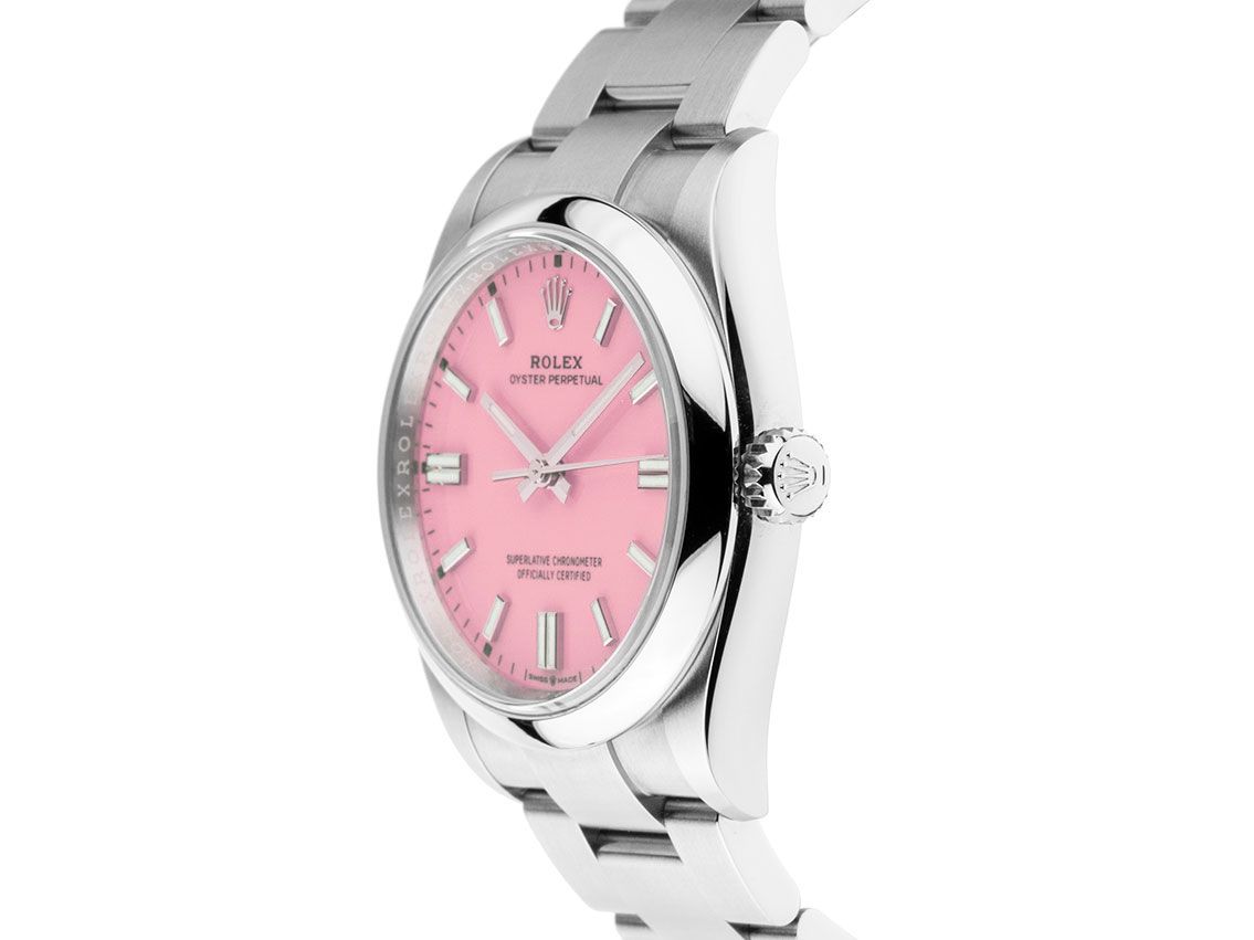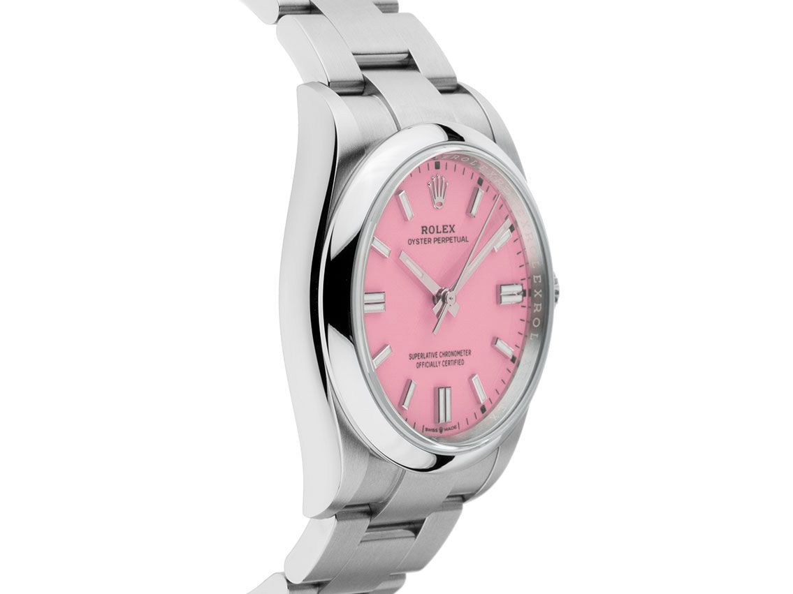 Gehäuse van gepolijst en satijn afgewerkt staal, Gehäusedurchmesser zonder kroon 36mm, Gehäusehöhe 12,0mm. Lünette van glad en gepolijst staal. Armband Oyster van gepolijst en satijn afgewerkt staal, vouwsluiting van staal met fabrikantlogo. Wijzerplaat in pink met opgezette witgouden luminescerende indexen en witgouden luminescerende wijzers. Uurwerk Automatisch, Chronometer met certificaat, Rolex Manufakturkaliber 3230 met 31 edelstenen, gangreserve van ongeveer 70 uur. Weergave van uur, minuut en seconde via centrale wijzers met seconde-stop voor nauwkeurige tijdinstelling. Saffierglas krasbestendig. Kroon met schroefdraad en fabrikantlogo. Achterkant van staal met schroefdraad. Gewicht van het horloge inclusief armband 120g, lengte van de armband inclusief kast 165mm. Waterdicht tot 10 ATM. Referentienummer: 126000, ID: P1328183000825H-12800/6300, artikelnummer: 10000081784. Originele Rolex doos met omdoos en garantiepapieren van februari 2025, nieuwe Rolex garantiekaart zonder landcode, evenals beschrijving, leren etui, Rolex Chronometer-zegel en uittreksel van het Watch Register van augustus 2025, The Watch Register certificaat / zonder vermelding (Internationale database voor verloren of gestolen horloges), Full Set. Ongedragen. Leveringstijd direct.