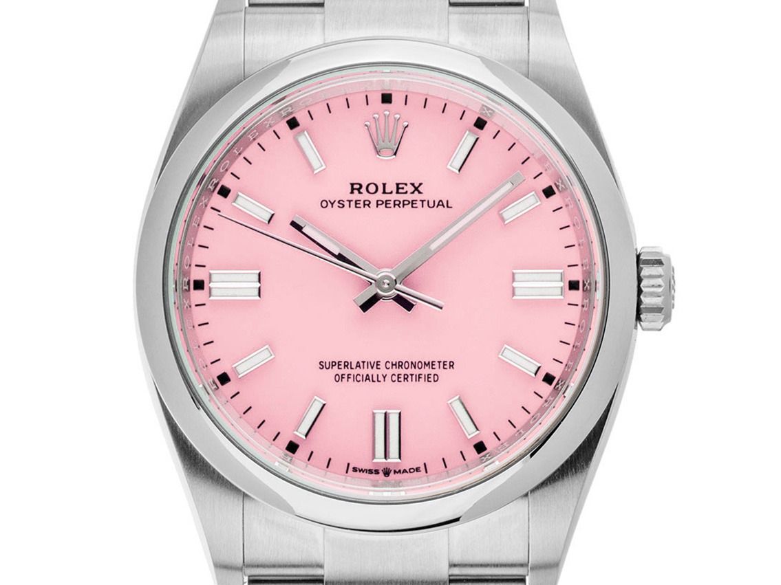 Rolex Oyster Perpetual Candy Pink Stahl Automatik Armband OysterGehäuse Edelstahl poliert und satiniert, Gehäusedurchmesser ohne Krone 36mm, Gehäusehöhe 12,0mm. Lünette Edelstahl glatt und poliert. Armband Oyster Edelstahl poliert und satiniert, Faltschließe Edelstahl mit Hersteller-Logo. Zifferblatt pink mit aufgesetzten weißgoldenen Leuchtindexen und weißgoldenen Leuchtzeigern. Uhrwerk Automatik, Chronometer mit Zeugnis, Rolex Manufakturkaliber 3230 mit 31 Edelsteinen, Gangreserve ca. 70 Stunden. Anzeige von Stunde, Minute und Sekunde über Zeiger aus der Mitte mit Sekundenstopp zur sekundengenauen Einstellung der Uhrzeit. Saphirglas kratzfest. Krone verschraubbar mit Hersteller-Logo. Boden Edelstahl verschraubt. Gewicht der Uhr inklusive Armband 120g, Länge des Armbandes inklusive Gehäuse 165mm. Wasserdicht bis 10 ATM. Referenznummer: 126000, ID: P1328183000825H-12800/6300, Artikelnummer: 10000081784. Original Rolex Box mit Umkarton und Garantie Papiere von Februar 2025, neue Rolex Garantie Karte ohne Ländercode sowie Beschreibung, Ledermäppchen, Rolex Chronometer-Siegel und Watchregister Auszug von August 2025, The Watch Register Zertifikat / ohne Eintrag (Internationale Datenbank für verlorene oder gestohlene Uhren), Full Set. Ungetragen. Lieferzeit sofort.