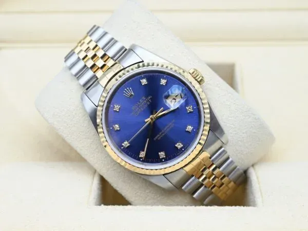 Rolex Datejust Ref. 16233 uit 1990 met de blauwe diamanten wijzerplaat in uitstekende staat, inclusief de originele doos en papieren. Al onze horloges zijn grondig gecontroleerd door onze eigen horlogemaker en waar nodig onderhouden.