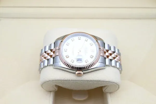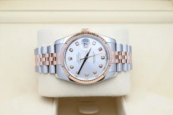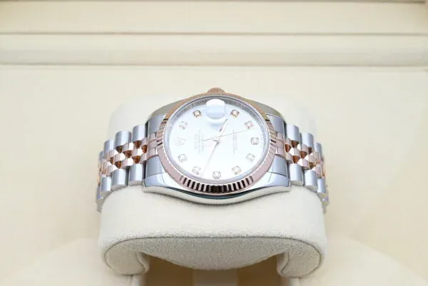 Rolex Datejust 116231 met de zilveren diamanten wijzerplaat in uitstekende staat, inclusief de originele doos en papieren. Al onze horloges zijn grondig gecontroleerd door onze eigen horlogemaker en waar nodig onderhouden.