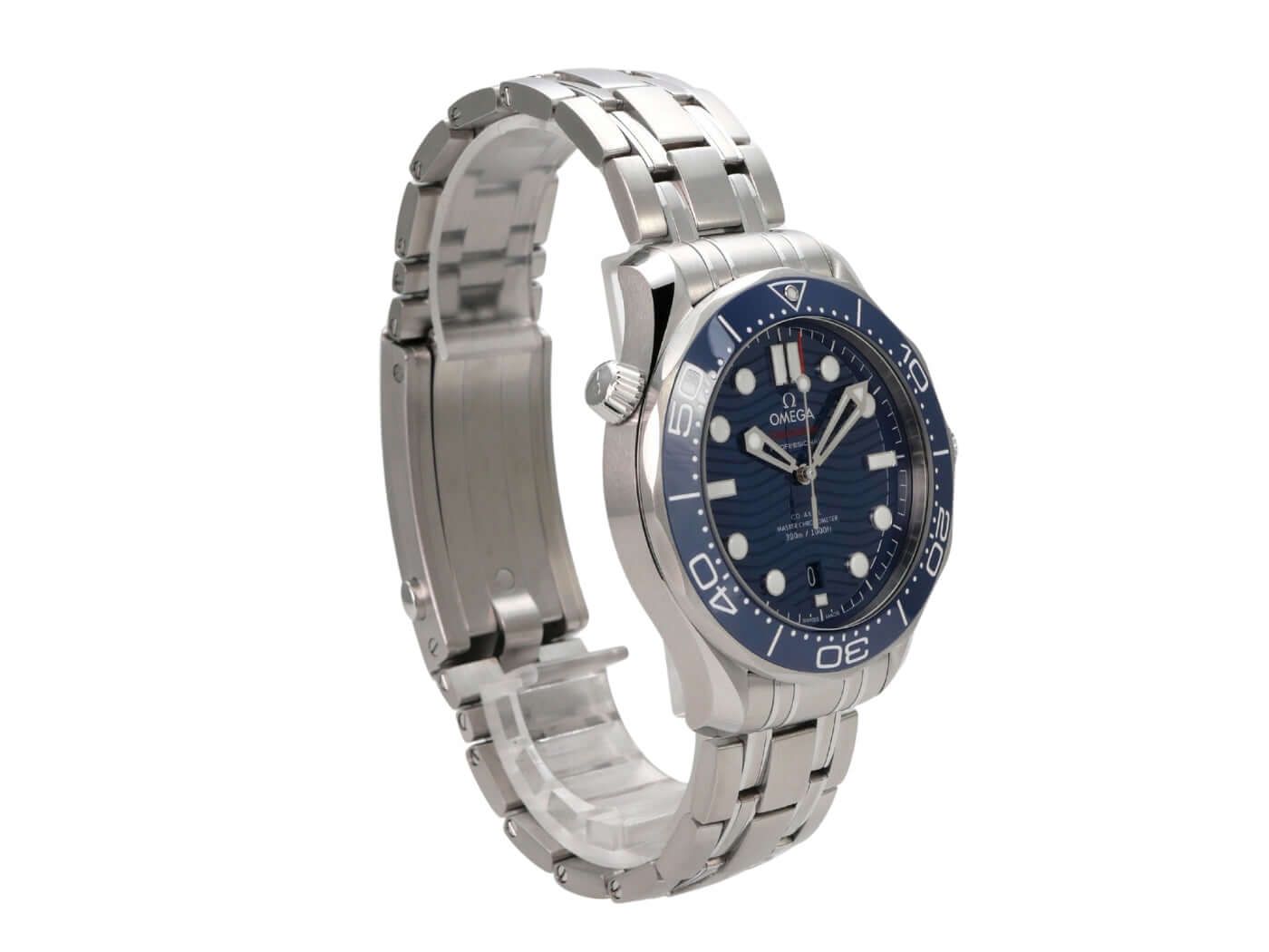 OMEGA Seamaster Diver 300M Master Chronometer Ref. 210.32.42.20.03.001Case made of polished and satin-finished stainless steel, case diameter 42 mm, stainless steel bezel with blue ceramic insert, 60-minute scale and luminous dot, unidirectional rotating, stainless steel bracelet with folding clasp, additional blue rubber strap with pin buckle, blue dial with applied luminous indices and luminous dots, skeletonized luminous hands, automatic, Omega caliber 8800 with Co-Axial escapement, 35 jewels, 25,200 A/h, power reserve approx. 55 hours, date, chronometer, helium valve, domed and scratch-resistant sapphire crystal, double-sided anti-reflective coating, screw-down crown with flank protection, screwed stainless steel case back with display window, water-resistant up to 30 bar.