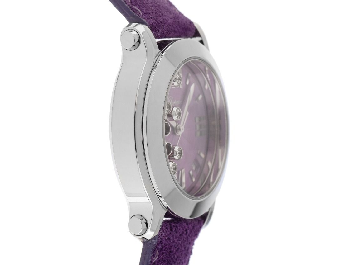 Chopard Happy Sport Stahl Diamanten Quarz Armband LederGehäuse Edelstahl poliert, Gehäusedurchmesser ohne Krone 36mm, Gehäusehöhe 10,7mm. Lünette Edelstahl glatt und poliert. Armband Velours Leder lila, Anstoßbreite 18mm, Stiftschließe Edelstahl mit Hersteller-Logo. Zifferblatt lila mit 5 beweglichen Brillanten und 2 beweglichen Amethysten, aufgesetzten römischen Edelstahl Ziffern, Edelstahl Indexen und Edelstahl Zeigern. Uhrwerk quarzgesteuert, Kaliber Chopard 955.112 mit 7 Edelsteinen. Anzeige von Stunde, Minute und Sekunde über Zeiger aus der Mitte mit Sekundenstopp zur sekundengenauen Einstellung der Uhrzeit, Datumsanzeige mit Schnellverstellung zwischen 4 und 5 Uhr. Saphirglas kratzfest. Krone mit Amethyst Cabochon. Boden Edelstahl 8-fach verschraubt und graviert. Gewicht der Uhr inklusive Armband 55g. Referenznummer: 8475, Gehäusenummer: 1607XXX, Baujahr: 2012, ID: P199952001125H-6900, Artikelnummer: 10000083423. Mit Gangkontrolle und kompletter äußerlicher Aufarbeitung von November 2025. Original Chopard Box mit Umkarton und Watchregister Auszug von November 2025, The Watch Register Zertifikat / ohne Eintrag (Internationale Datenbank für verlorene oder gestohlene Uhren). Superschnäppchen, sehr seltenes Sammlerstück. Wie Neu. Lieferzeit sofort.