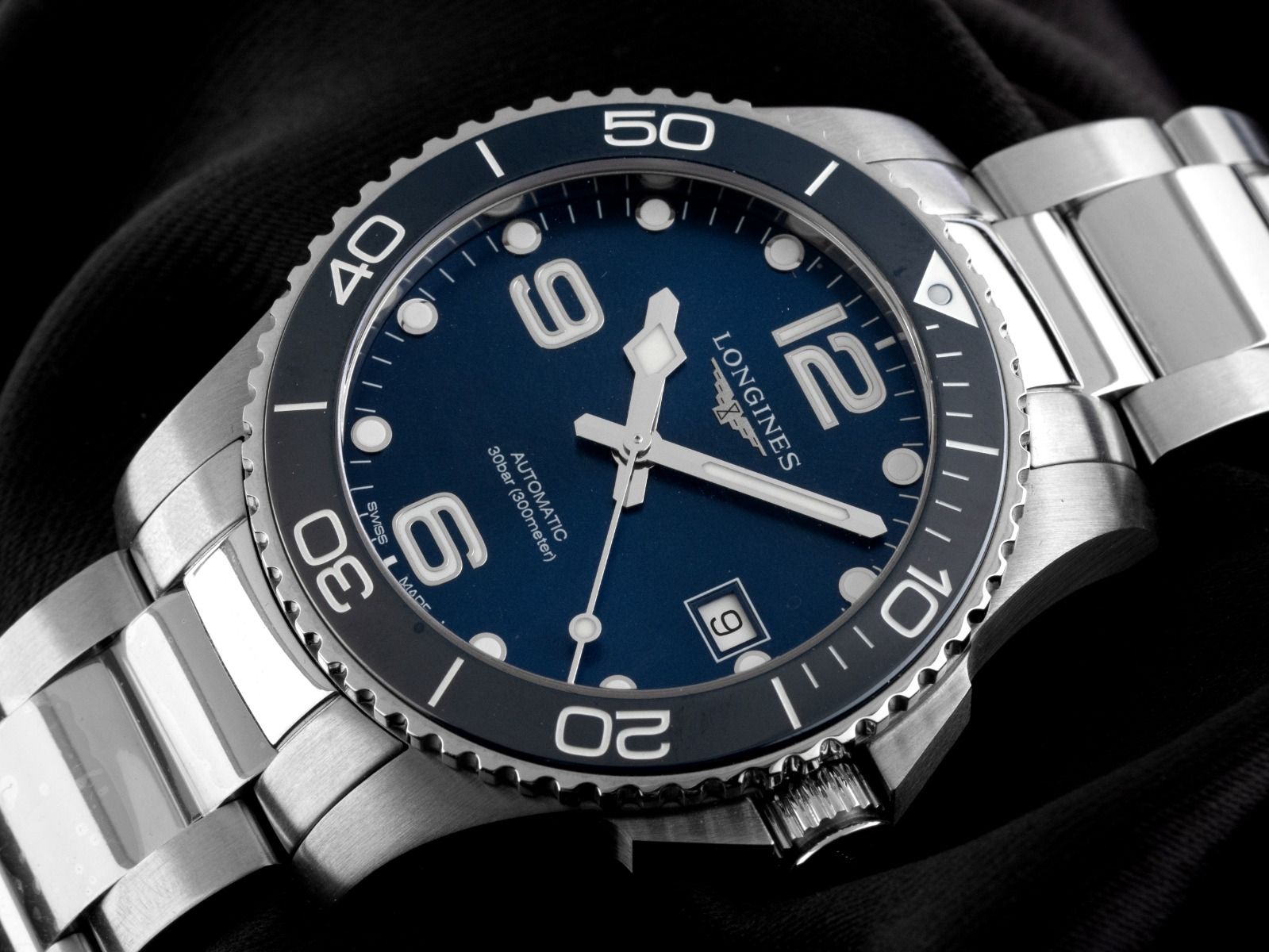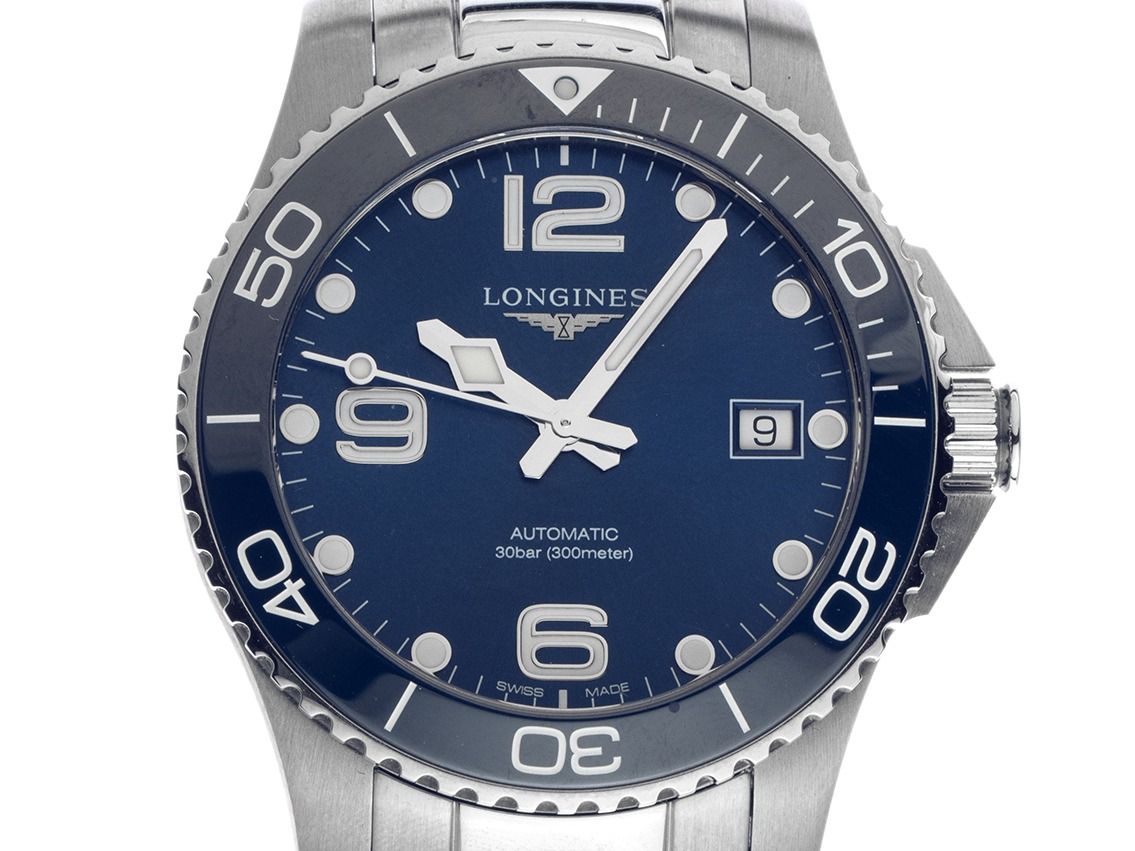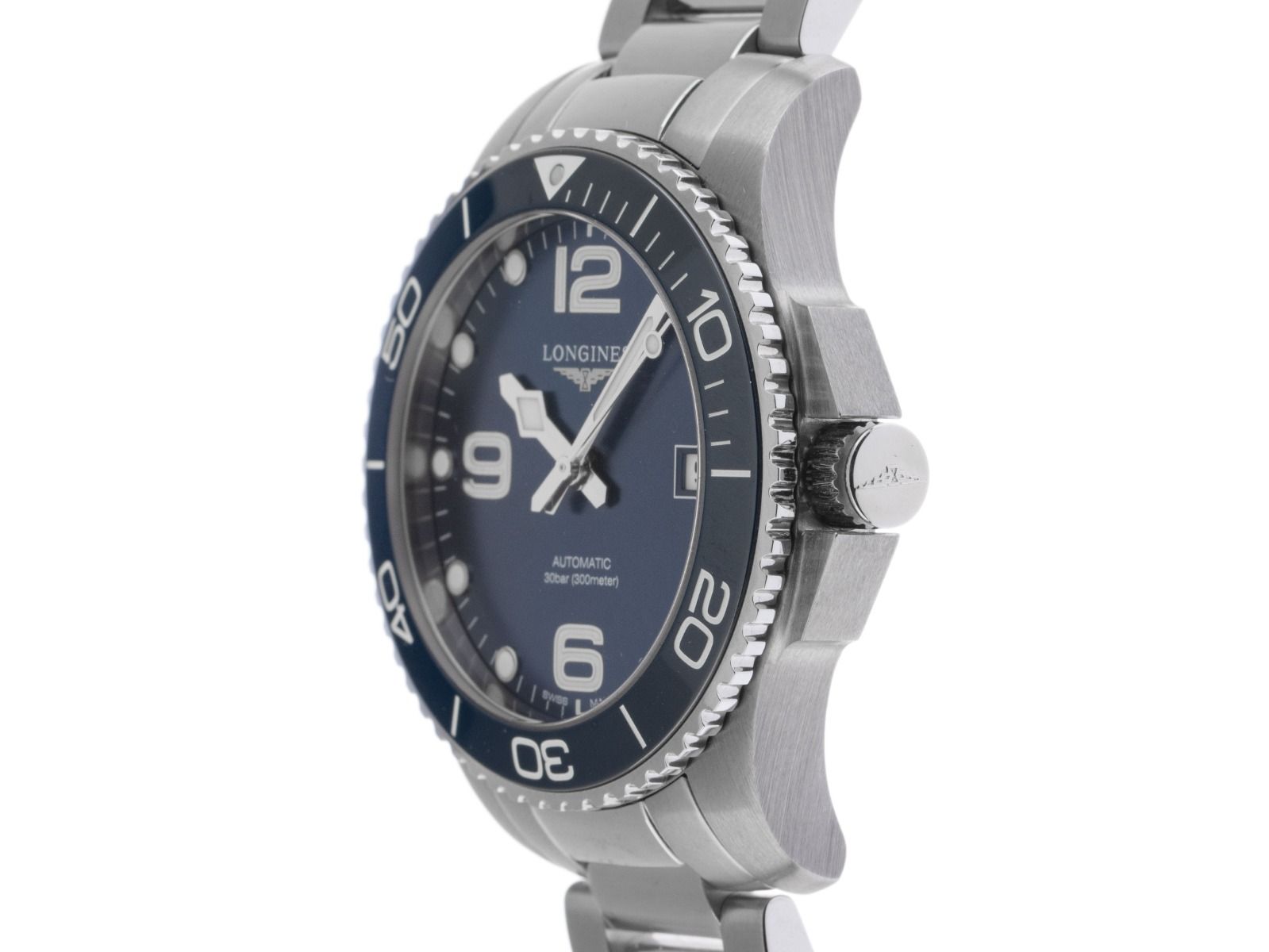 Longines Hydroconquest Stahl Keramik Automatik Armband StahlGehäuse Edelstahl poliert und satiniert, Gehäusedurchmesser ohne Krone 39mm, Gehäusehöhe 12,1mm. Lünette Edelstahl mit blauem Keramik Inlay, 60-Minuten Einteilung und Leuchtpunkt, einseitig drehbar. Armband Edelstahl poliert und satiniert, Sicherheitsfaltschließe Edelstahl mit Hersteller-Logo. Zifferblatt blau mit aufgesetzten arabischen Leuchtziffern und Leuchtpunkten sowie versilberten polierten Leuchtzeigern. Uhrwerk Automatik, Longines Kaliber L888, Gangreserve ca. 72 Stunden. Anzeige von Stunde, Minute und Sekunde über Zeiger aus der Mitte mit Sekundenstopp zur sekundengenauen Einstellung der Uhrzeit, Datumsanzeige mit Schnellverstellung bei 3 Uhr. Saphirglas kratzfest. Krone verschraubbar mit Flankenschutz und Hersteller-Logo. Boden Edelstahl verschraubt und graviert. Gewicht der Uhr inklusive Armband 166g, Länge des Armbandes inklusive Gehäuse 210mm. Wasserdicht bis 30 ATM. Referenznummer: L3.780.4.96.6, ID: ST610223401125H-1950, Artikelnummer: 10000083476. Original Longines Box mit Umkarton und Garantie Papiere von 2025 sowie Beschreibung, Full Set. Ungetragen. Lieferzeit sofort.