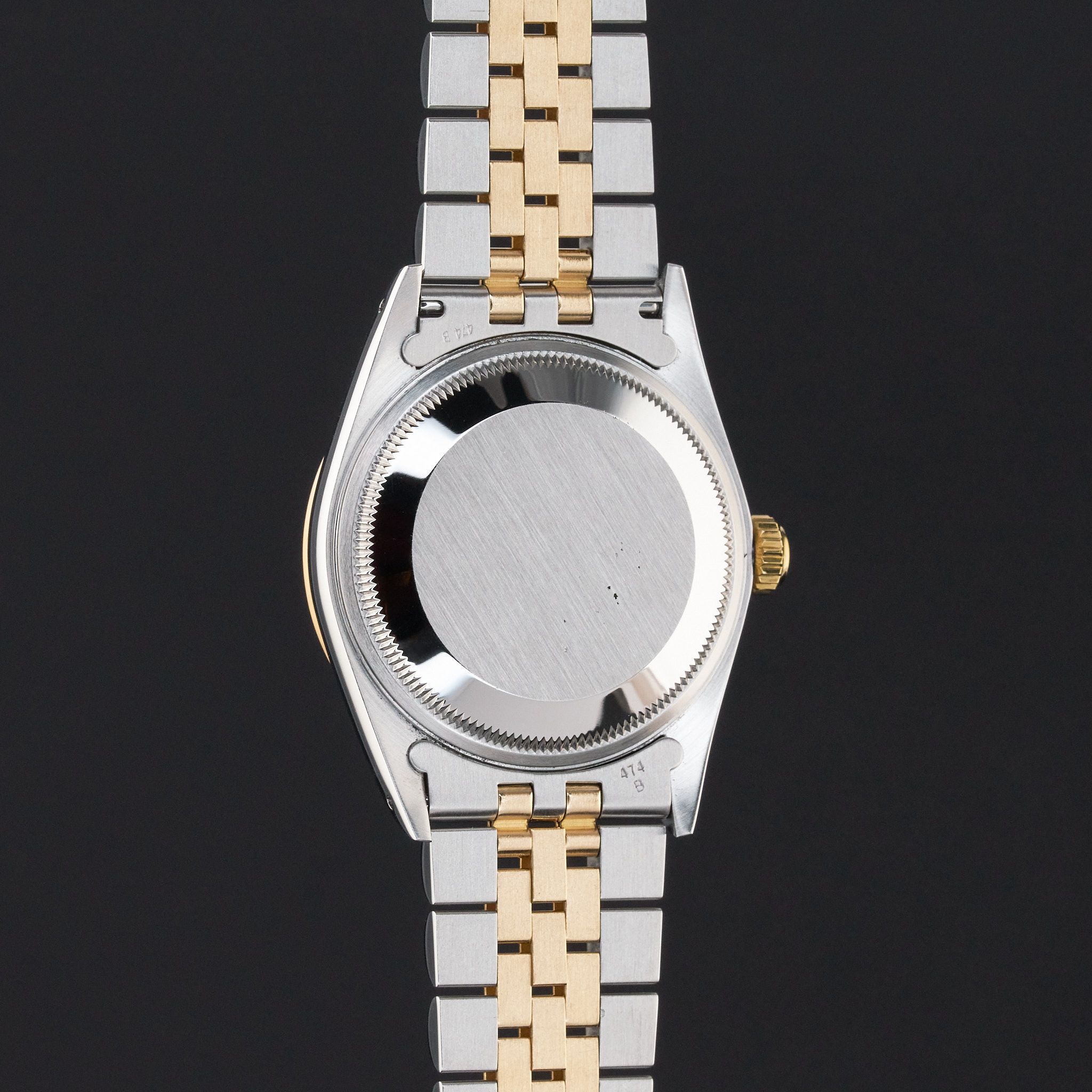 This Rolex Oyster Perpetual Date 15223 features a Black dial and is crafted from 18K yellow gold and stainless steel, with a production year of 1990.Case No: E59XXXX