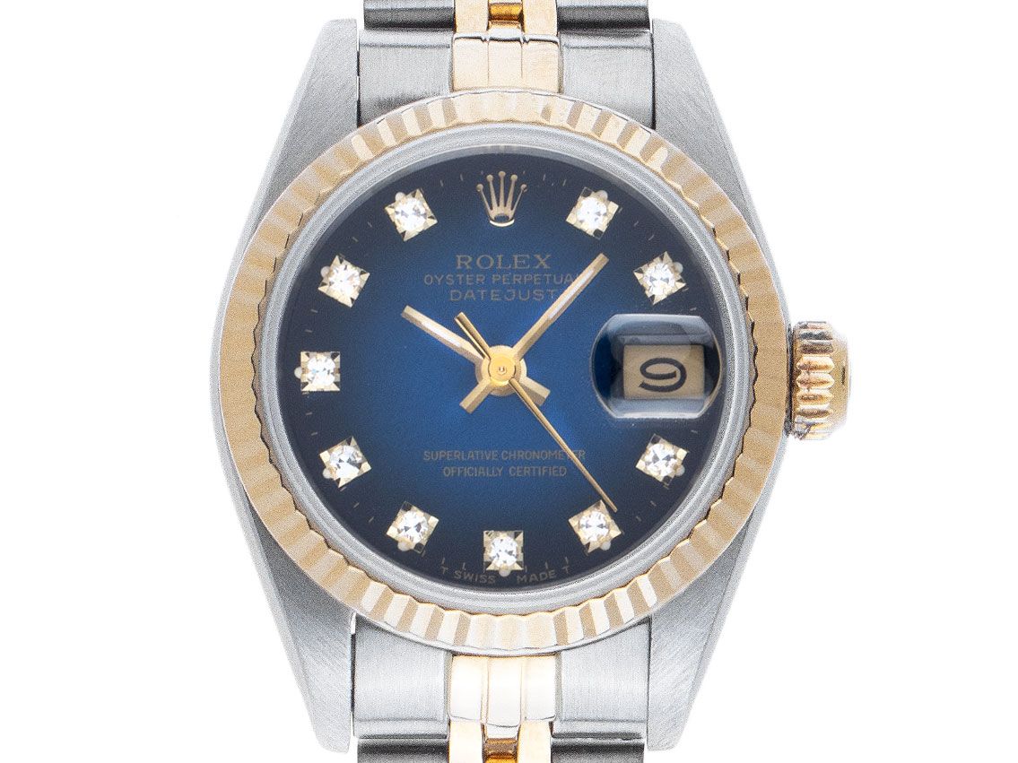 Gehuis in gepolijst en satijn afgewerkt staal, behuizingsdiameter zonder kroon 26mm, behuizingshoogte 10,5mm. Lunette van 18kt geelgoud, geribbeld en gepolijst. Armband Jubilé van gepolijst en satijn afgewerkt staal / 18kt geelgoud, vouwsluiting van staal met fabrikantlogo. Wijzerplaat blauw / zwart verloop met 10 opgezette diamantindexen en geelgouden wijzers. Uurwerk automaat, chronometer met certificaat, Rolex manufactuurkaliber 2030 met 28 edelstenen. Weergave van uur, minuut en seconde via centrale wijzers met seconde-stop voor nauwkeurige tijdinstelling, datumaanduiding met snelle instelling onder vergrootglas bij 3 uur, open 6/9 (open 6 en 9 in de datumaanduiding). Saffierglas krasbestendig. Kroon met schroefdraad en fabrikantlogo. Achterkant van staal, geschroefd. Gewicht van de klok inclusief armband 53g, lengte van de armband inclusief behuizing 150mm. Referentienummer: 69173, behuizingsnummer: S243XXX, bouwjaar: 1993, ID: P205098001225H-9100, artikelnummer: 10000083617. Met gangcontrole en volledige uiterlijke opfrissing van december 2025. Originele Rolex doos met omdoos en garantiepapieren zonder datumvermelding, evenals beschrijving, vertaalboekje, lederen etui, Rolex chronometerzegel en uittreksel van het Watch Register van december 2025, The Watch Register certificaat / zonder vermelding (Internationale database voor verloren of gestolen horloges), Full Set. Zeer zeldzaam verzamelobject, uit eerste hand. Zeer goede staat. Leveringstijd direct.