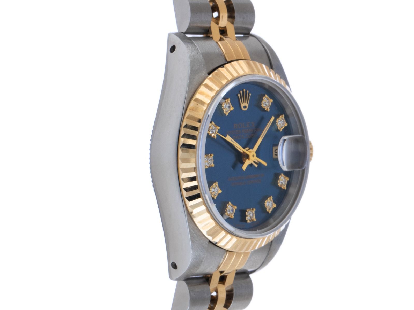 Gehuis van gepolijst en gesatineerd staal, Gehuisdiameter zonder kroon 26mm, Gehuishoogte 10,5mm. Lunette van gepolijst 18kt geelgoud. Jubileearmband van gepolijst en gesatineerd staal / 18kt geelgoud, Vouwsluiting van staal met fabrikantlogo. Wijzerplaat blauw met 10 opgezette diamantindexen en geelgouden wijzers. Uurwerk Automaat, Chronometer met certificaat, Rolex Manufakturkaliber 2135 met 29 edelstenen. Weergave van uur, minuut en seconde via centrale wijzers met seconde-stop voor nauwkeurige tijdinstelling, datumweergave met snelle instelling onder vergrootglas bij 3 uur, open 6/9 (open 6 en 9 in de datumweergave). Saffierglas krasbestendig. Kroon met schroefdraad en fabrikantlogo. Achterkant van staal met schroefdraad. Gewicht van het horloge inclusief armband 53g, Lengte van de armband inclusief kast 150mm. Referentienummer: 69173, Kastnummer: S203XXX, Bouwjaar: 1993, ID: P204998001225H-8900, Artikelnummer: 10000083616. Met gangcontrole en volledige uiterlijke opfrissing van december 2025. Originele Rolex doos met omdoos en garantiepapieren van februari 1994, LC 400 / Hong Kong, evenals beschrijving, vertaalboekje, leren etui, Rolex Chronometer-zegel en Watchregister uittreksel van december 2025, The Watch Register certificaat / zonder vermelding (Internationale database voor verloren of gestolen horloges), Full Set. Zeer zeldzaam verzamelobject, uit eerste hand. Zeer goede staat. Leveringstijd direct.