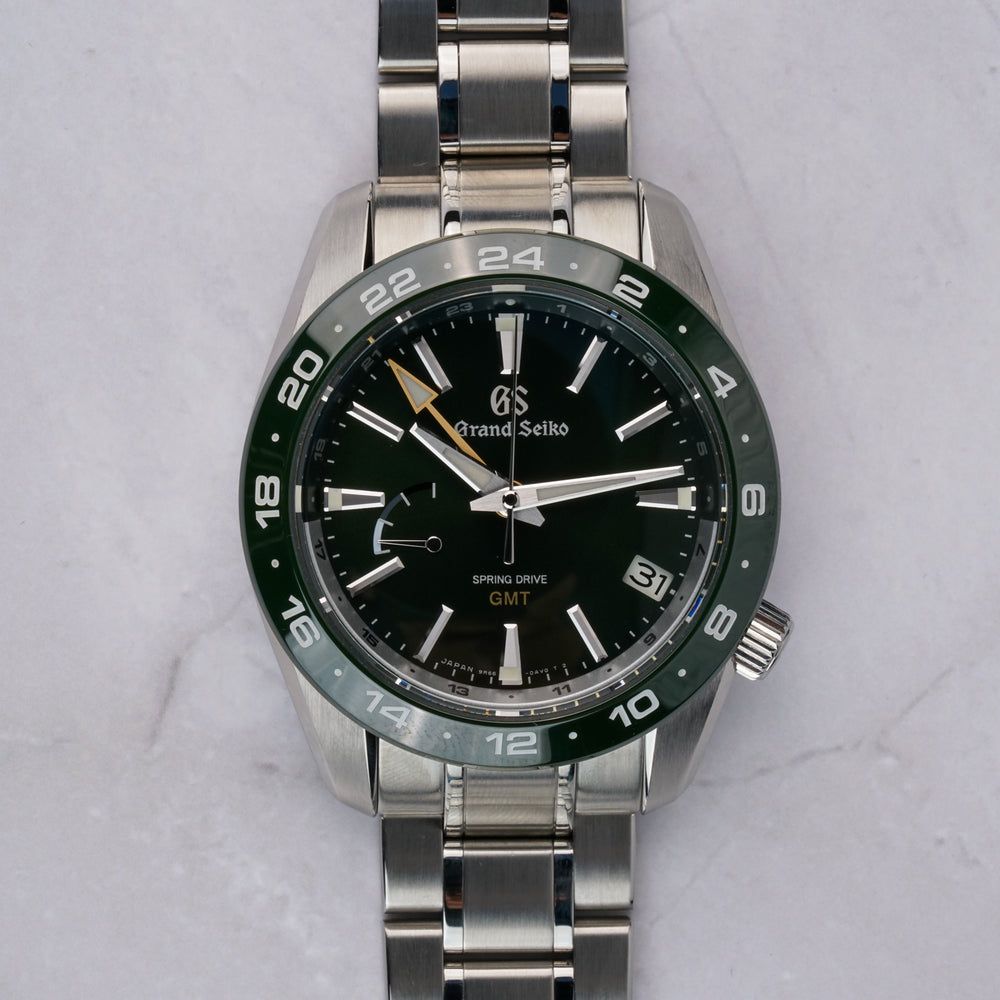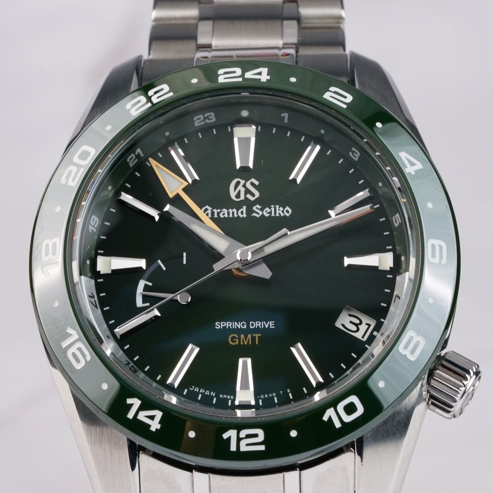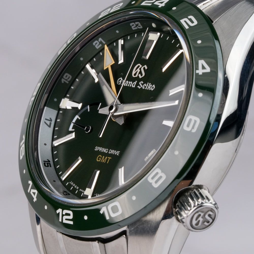 Grand Seiko SBGE257 Spring Drive GMT 40.5mmThe Grand Seiko SBGE257 combines precision engineering with sporty elegance.Its 40.5 mm stainless-steel case and matching bracelet give it a robust yet refined presence, while the deep green dial adds a distinctive and luxurious touch.Powered by the Spring Drive Caliber 9R66, this model delivers the smooth glide of the seconds hand and remarkable accuracy.
