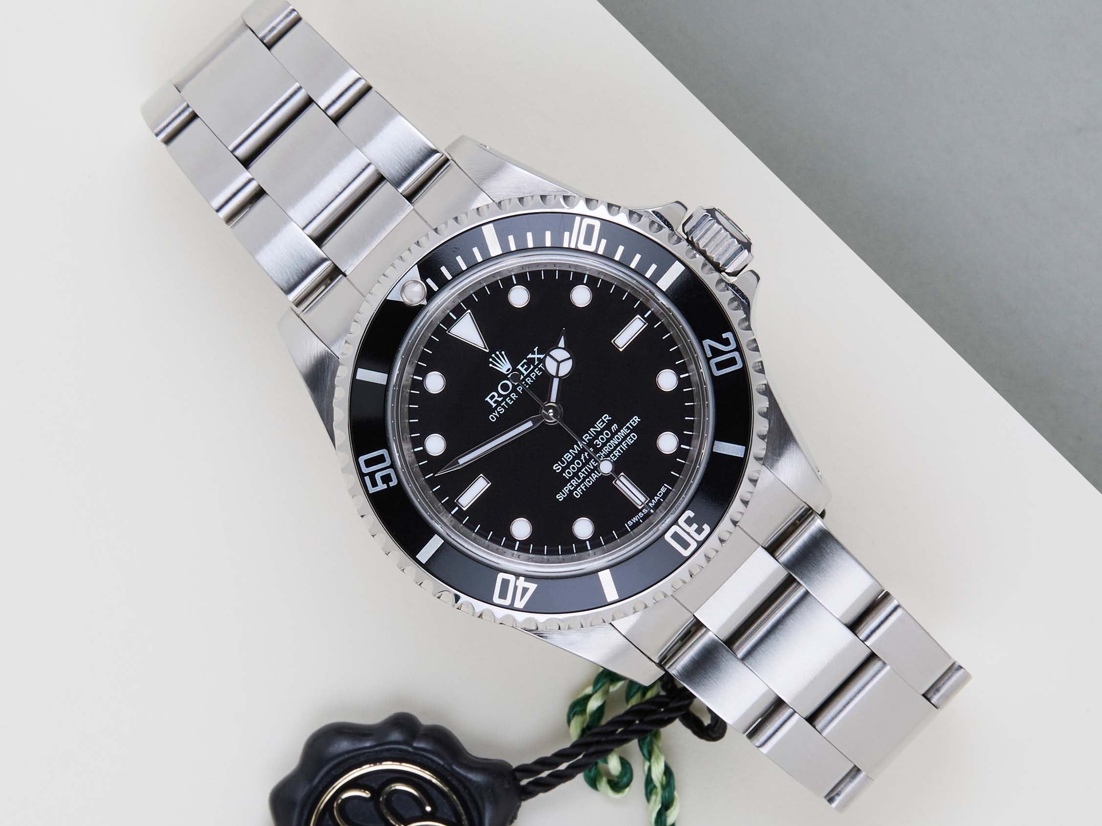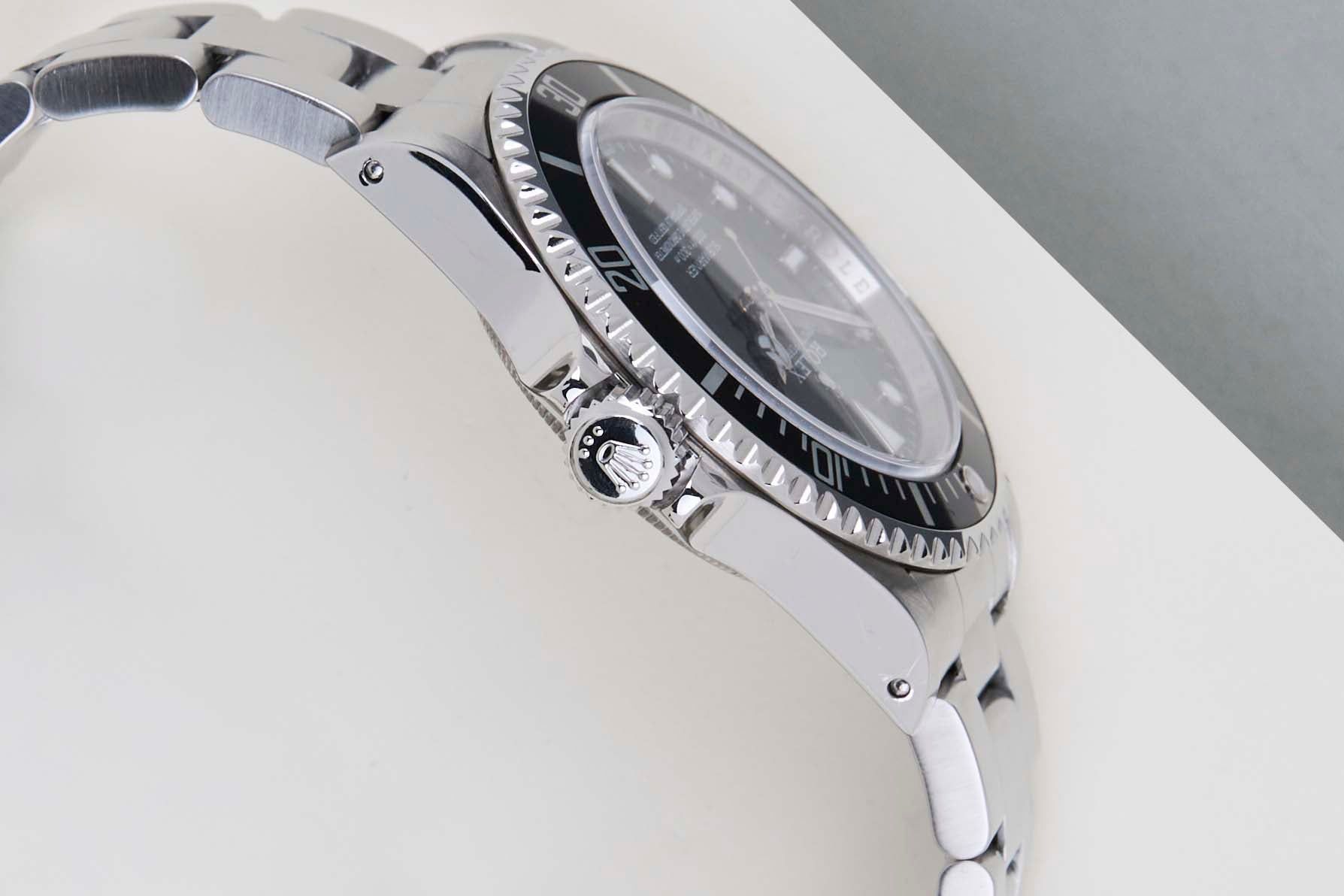 Dit Rolex Submariner No Date is in mint conditie en wordt geleverd als een volledige set met de originele Rolex Garantiekaart en originele doos. Bovendien is het horloge onderhouden door onze horlogemaker, en daarom komt het met een jaar Steiner Garantie.
