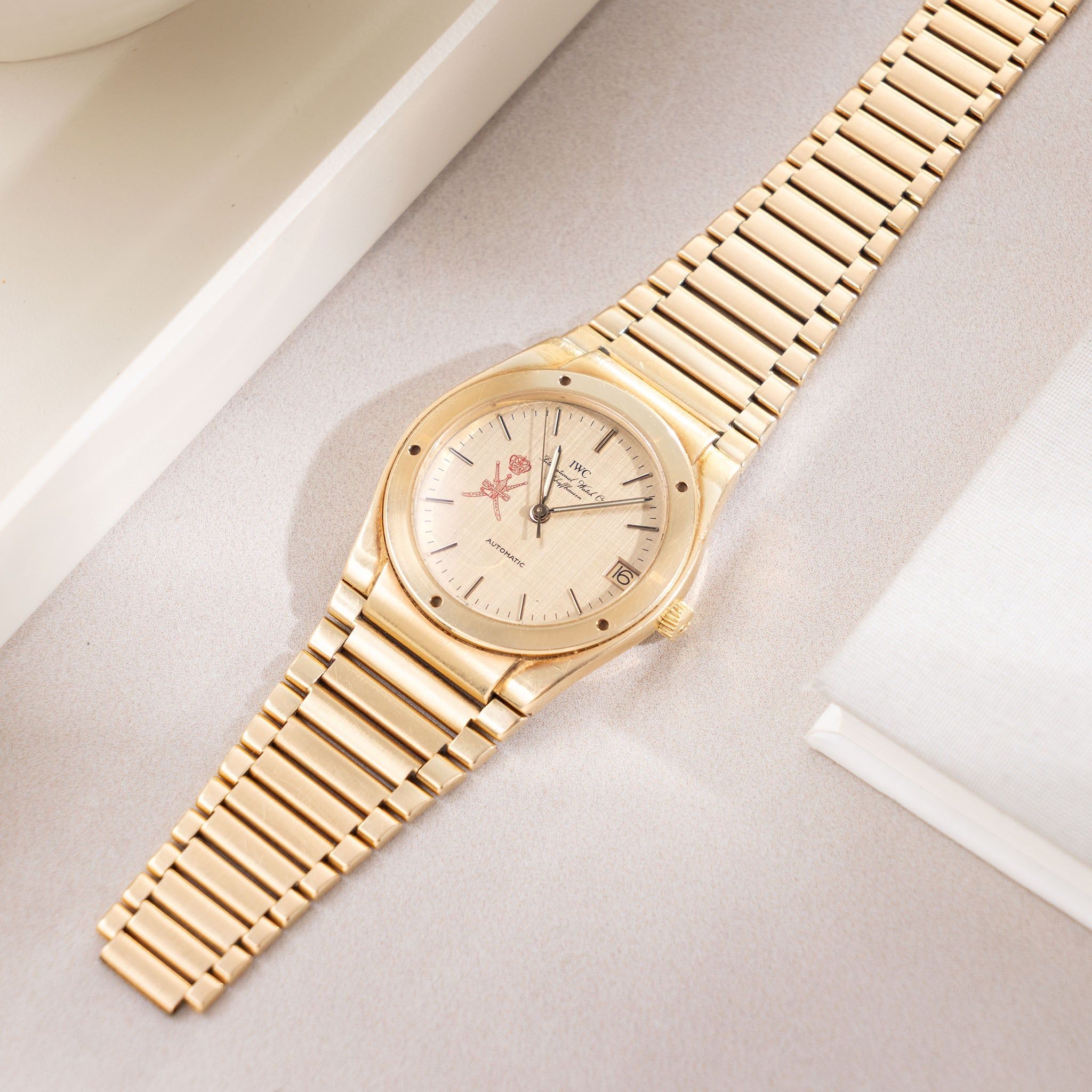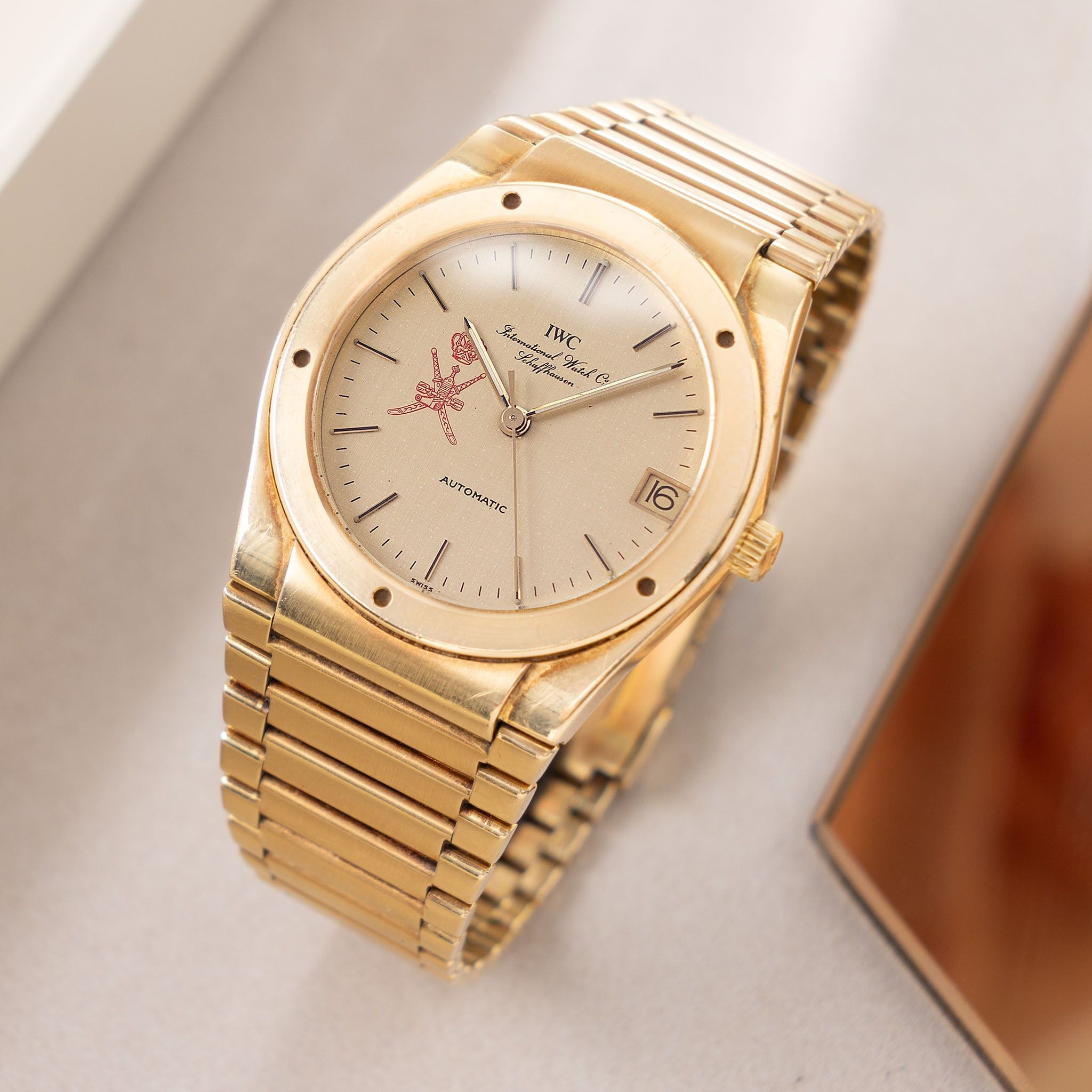Today we have a rare watch to offer you — but first, let us introduce the IWC Ingenieur. The first Ingenieur was launched in 1955 as IWC's first automatic watch with a soft-iron inner case to protect against magnetic fields. It was designed for professionals such as engineers and scientists who worked in environments with strong magnetic interference. In 1976, Gérald Genta redesigned the watch to create the Ingenieur SL (reference 1832). This version marked a significant departure from the original, featuring a more robust integrated steel case and bracelet — a design that quickly became a favourite among collectors. The “Skinny” SL models, including reference 9227, were introduced in 1983 as a smaller, more slender (35 mm) alternative to the larger SL “Jumbo” versions. These watches retained Genta’s iconic design but offered a more versatile, less bulky profile for everyday wear. And that’s exactly what we have at hand: an 18K yellow gold reference 9227. What truly sets this watch apart is the presence of the Khanjar and crossed-swords crest — the national emblem of Oman, representing the country’s heritage and traditional weaponry. This particular piece was commissioned by Sultan Qaboos bin Said, who ruled Oman from 1970 until his passing in 2020. A passionate watch enthusiast, the Sultan frequently ordered special timepieces directly from manufacturers to gift to close advisors, dignitaries, and friends. Watches bearing this royal insignia are among the rarest and most sought-after in the world of vintage collecting. We’ve explored their fascinating history in detail — you can read more about it here! This example remains in excellent condition, with the original lines fully preserved and the distinctive “fish” crown intact. The surprisingly elegant three-row gold bracelet is also in superb condition and fits wrists up to 17.5 cm. We acquired this piece directly from the granddaughter of the original owner, a Tunisian Minister, who also provided a Rolex Day-Date featuring a similar Khanjar emblem. The watch comes with a handwritten letter from the granddaughter of the Tunisian minister who was gifted the timepiece — alongside the Rolex Day-Date with a matching Khanjar emblem, which we also have in stock. The letter details how these watches entered the family and the significance they held. We even have rare photographs of the original owner, including a striking image of him shaking hands with Sultan Qaboos himself. This watch comes complete with its original IWC leather box, booklets, and the certificate-of-origin/guarantee booklet (unfilled). It is powered by the automatic caliber 375 and has been fully serviced by our watchmaker, ready for its next chapter. A watch of this pedigree doesn’t come around often — 18K gold, Genta-designed elegance, and royal Omani provenance all in one. Complete with original papers, box, and family-documented history, this Ingenieur is as rare as it is remarkable. Serious collectors, don’t let this extraordinary piece slip away! Specifications: IWC Ingenieur SL Reference 9227 Serial 231xxxx dating to the 1980s 35 mm 18 k yellow gold case with “fish “ crown Champagne Linen dial with red Khanjar emblem Integrated 18 k gold 3 row bracelet Original IWC box , booklets and the original certificate of origin/ guarantee booklet ,not filled in . Letter of provenance of grand daughter of original owner IWC calibre 375 automatic movement Fully serviced by our watchmaker One-year mechanical warranty Free worldwide Fedex Priority shipping