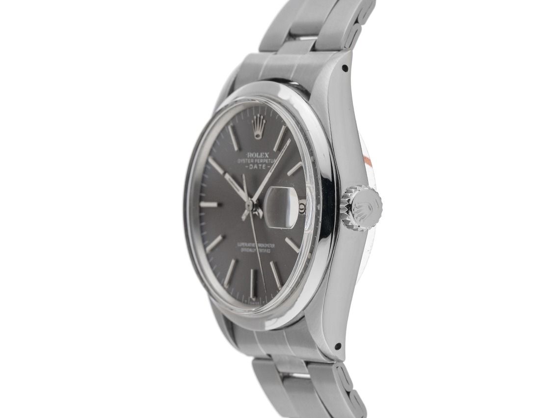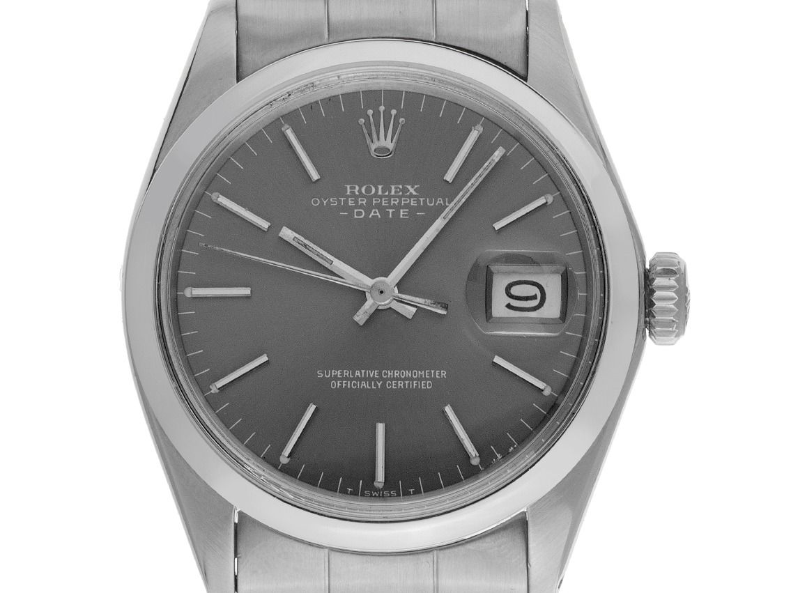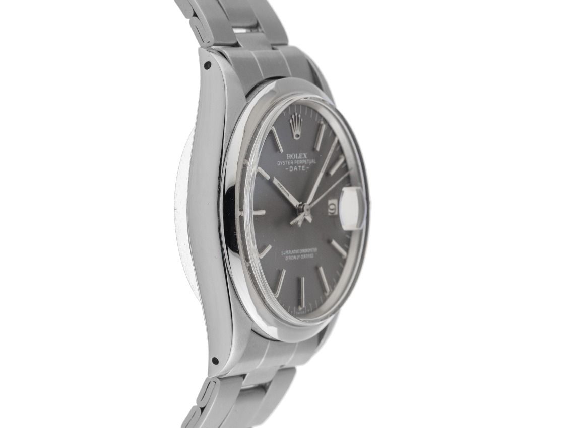 Rolex Oyster Perpetual Date Stahl Automatik Armband OysterGehäuse Edelstahl poliert und satiniert, Gehäusedurchmesser ohne Krone 34mm, Gehäusehöhe 12,7mm. Lünette Edelstahl glatt und poliert. Armband Oyster Edelstahl gefaltet und satiniert, Faltschließe Edelstahl mit Hersteller-Logo. Zifferblatt Rhodium grau mit aufgesetzten weißgoldenen Indexen und weißgoldenen Zeigern. Uhrwerk Automatik, Chronometer, Rolex Manufakturkaliber 1570 mit 26 Edelsteinen. Anzeige von Stunde, Minute und Sekunde über Zeiger aus der Mitte mit Sekundenstopp zur sekundengenauen Einstellung der Uhrzeit, Datumsanzeige mit Schnellverstellung unter Glaslupe bei 3 Uhr, open 6/9 (offene 6 und 9 in der Datumsanzeige). Plexiglas. Krone verschraubbar mit Hersteller-Logo. Boden Edelstahl verschraubt. Gewicht der Uhr inklusive Armband 71g, Länge des Armbandes inklusive Gehäuse 175mm. Referenznummer: 1500, Gehäusenummer: 2546XXX, Baujahr: 1970, ID: P201762101125H-6500, Artikelnummer: 10000083465. Mit Gangkontrolle und kompletter äußerlicher Aufarbeitung von Dezember 2025. Original Rolex Box und Ledermäppchen, Übersetzungsheft sowie Watchregister Auszug von Dezember 2025, The Watch Register Zertifikat / ohne Eintrag (Internationale Datenbank für verlorene oder gestohlene Uhren). Superschnäppchen, sehr seltenes Sammlerstück. Sehr guter Zustand. Lieferzeit sofort.