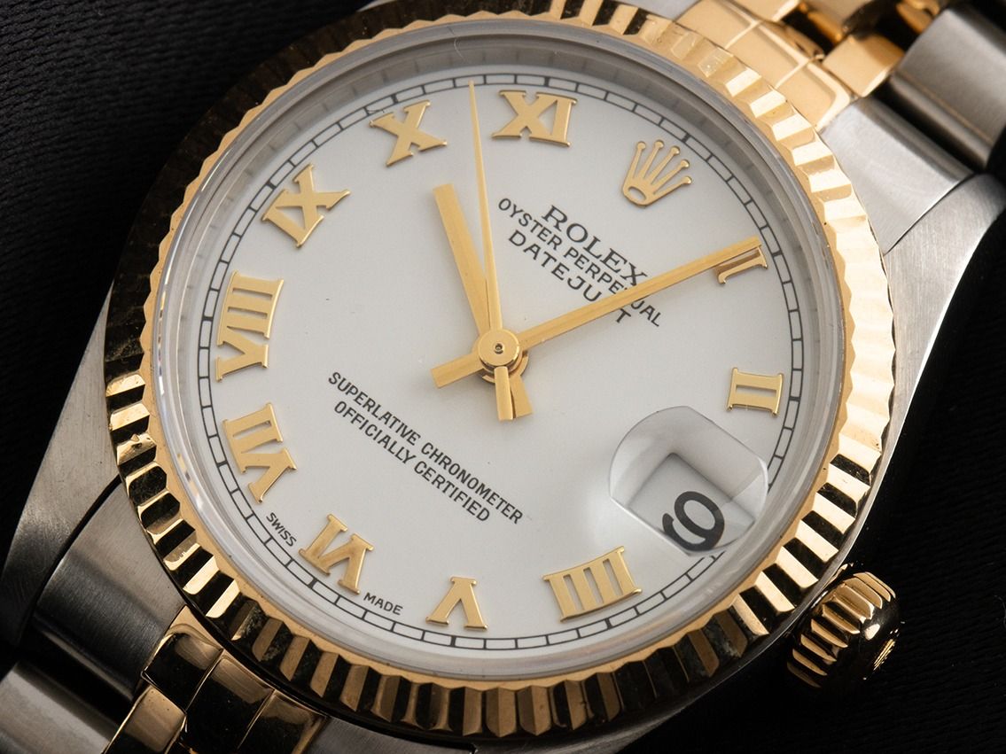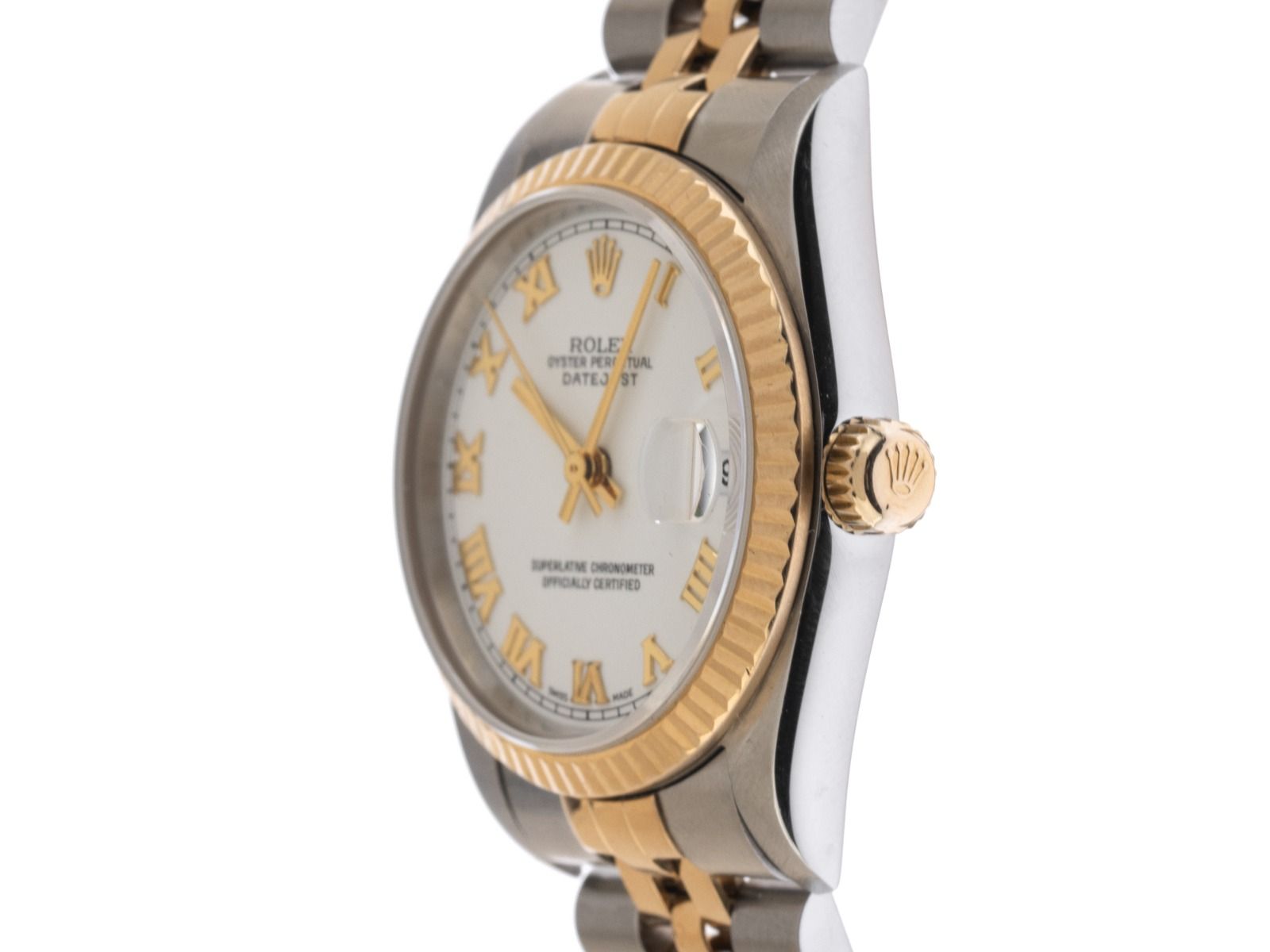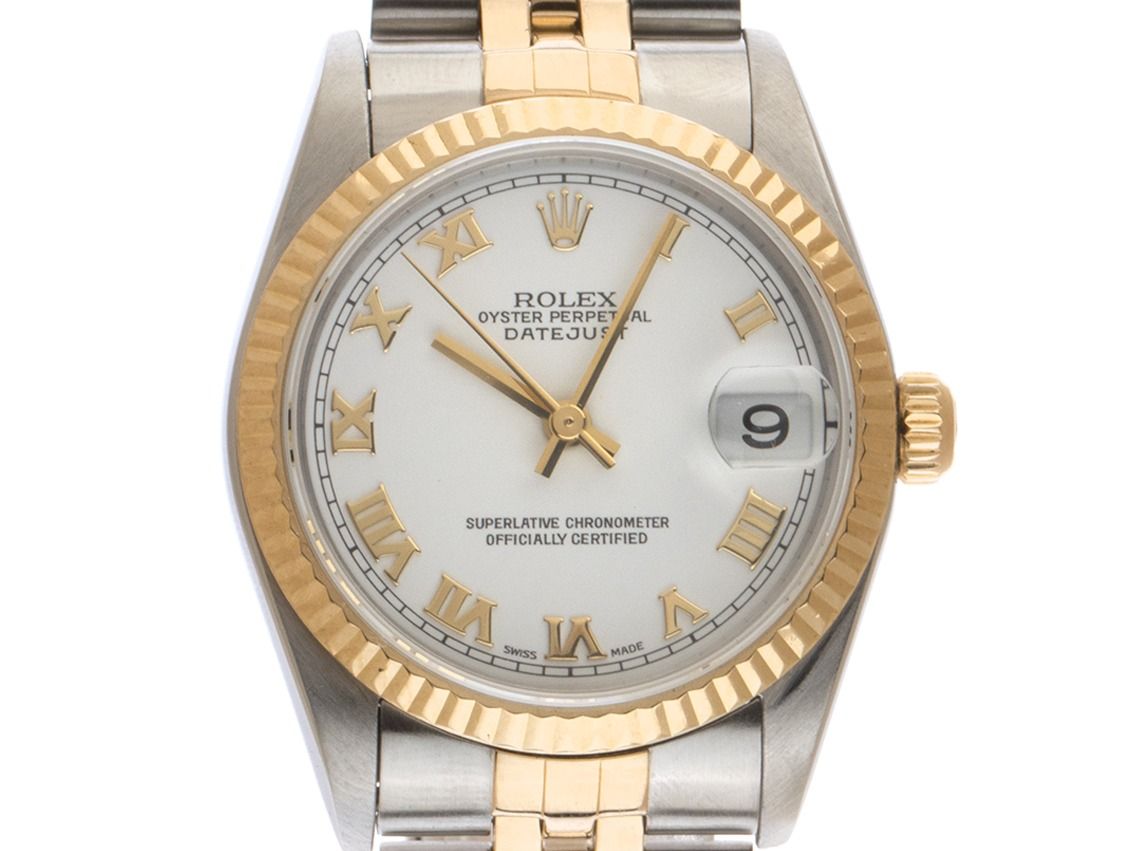 Kast van gepolijst en gesatineerd staal, kastdiameter zonder kroon 31mm, kasthoogte 10,7mm. Lunette van 18kt geelgoud, geribbeld en gepolijst. Jubileearmband van gepolijst en gesatineerd staal / 18kt geelgoud, vouwsluiting van staal met fabrikantlogo. Wijzerplaat wit met opgezette geelgouden Romeinse cijfers en geelgouden wijzers. Uurwerk automatisch, chronometer, Rolex manufactuurkaliber 2235 met 31 edelstenen. Weergave van uur, minuut en seconde via centrale wijzers met seconde-stop voor nauwkeurige tijdinstelling, datumaanduiding met snelle instelling onder vergrootglas bij 3 uur. Saffierglas krasbestendig. Kroon met schroefdraad en fabrikantlogo. Achterkant van staal, geschroefd. Gewicht van het horloge inclusief armband 72g, lengte van de armband inclusief kast 165mm. Referentienummer: 78273, kastnummer: 7489XXX, bouwjaar: 1983, ID: P1871110001125H-9900, artikelnummer: 10000083084. Met gangcontrole en volledige uiterlijke opfrissing van november 2025. Originele Rolex doos evenals beschrijving, lederen etui, Rolex chronometerzegel en uittreksel van het horlogeregister van november 2025, The Watch Register certificaat / zonder vermelding (Internationale database voor verloren of gestolen horloges). Investering met waardestijgingspotentieel. Zeer goede staat. Leveringstijd direct.