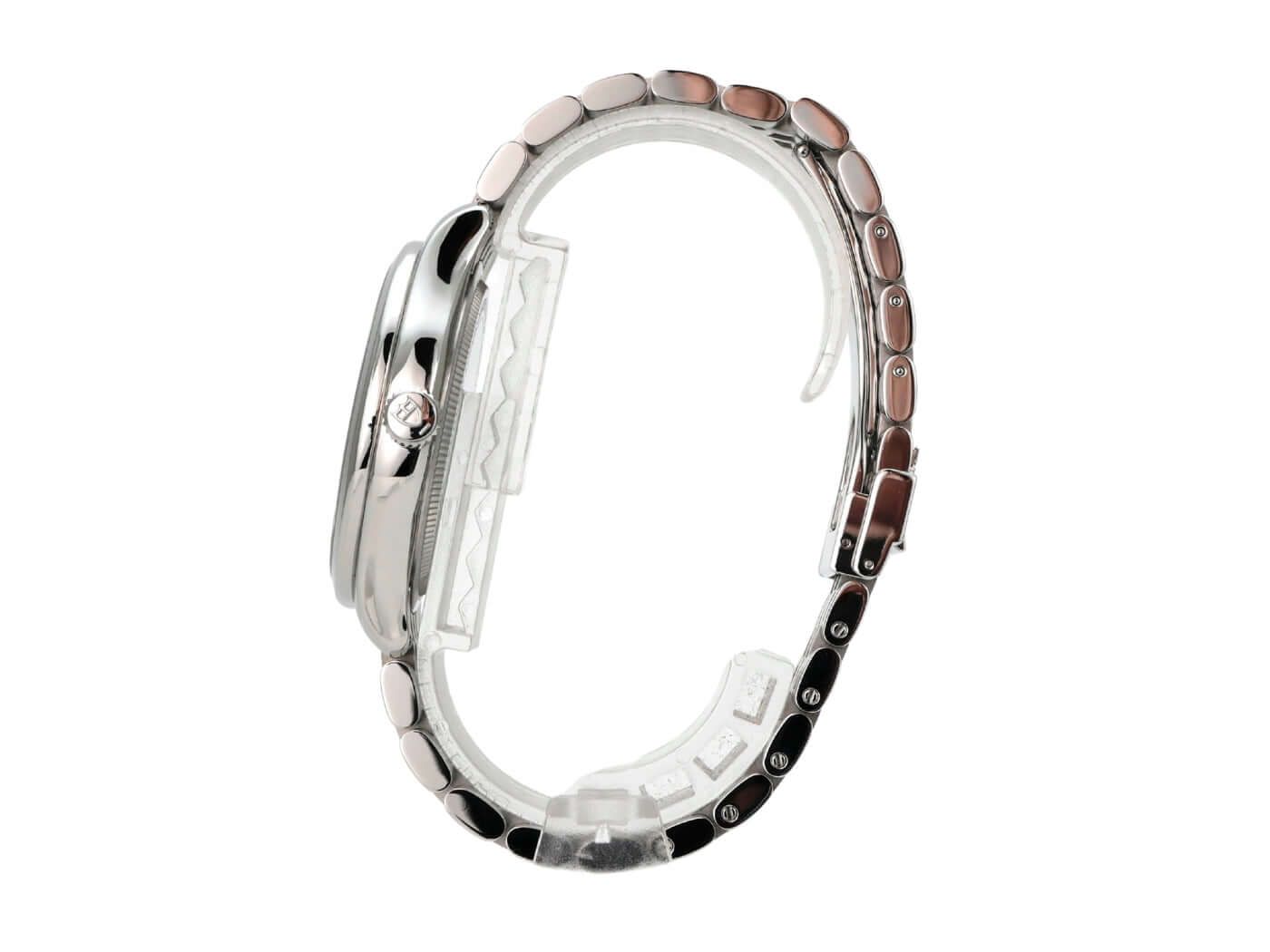 Behuizing gemaakt van gepolijst en satijn afgewerkt roestvrij staal, behuizingsdiameter 39 mm, gepolijste roestvrijstalen bezel, roestvrijstalen armband met vouwsluiting, zwarte wijzerplaat met zonnestraalafwerking en Arabische cijfers, maanfase, automatisch, Kaliber T607-9, gangreserve van 38 uur, saffierglas, geschroefde roestvrijstalen achterdeksel, waterbestendig tot 10 bar.