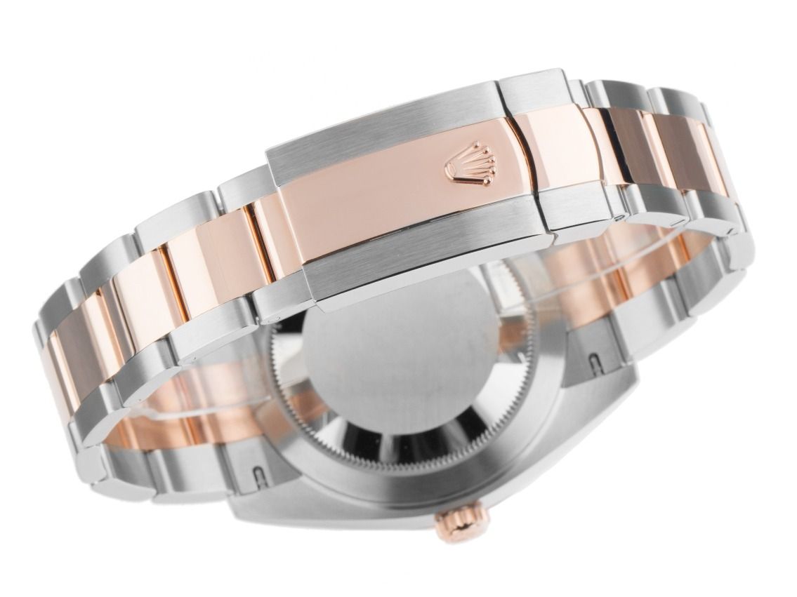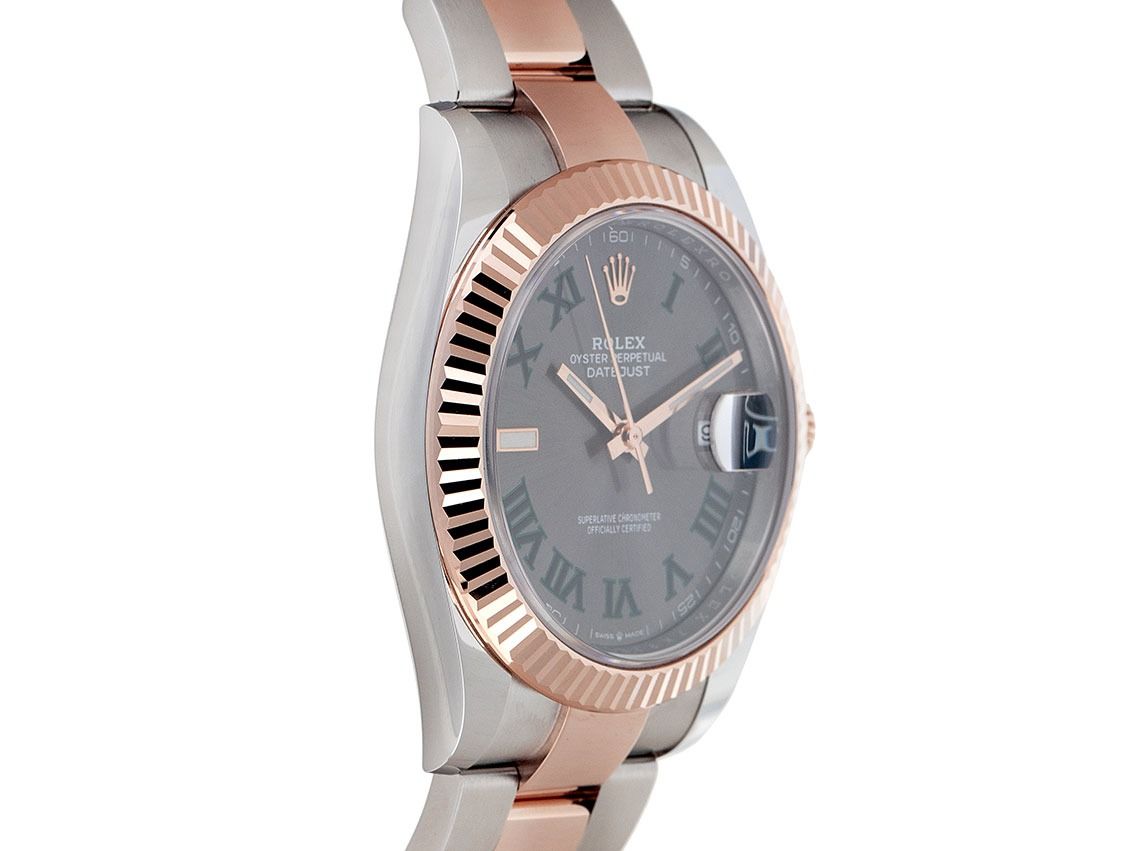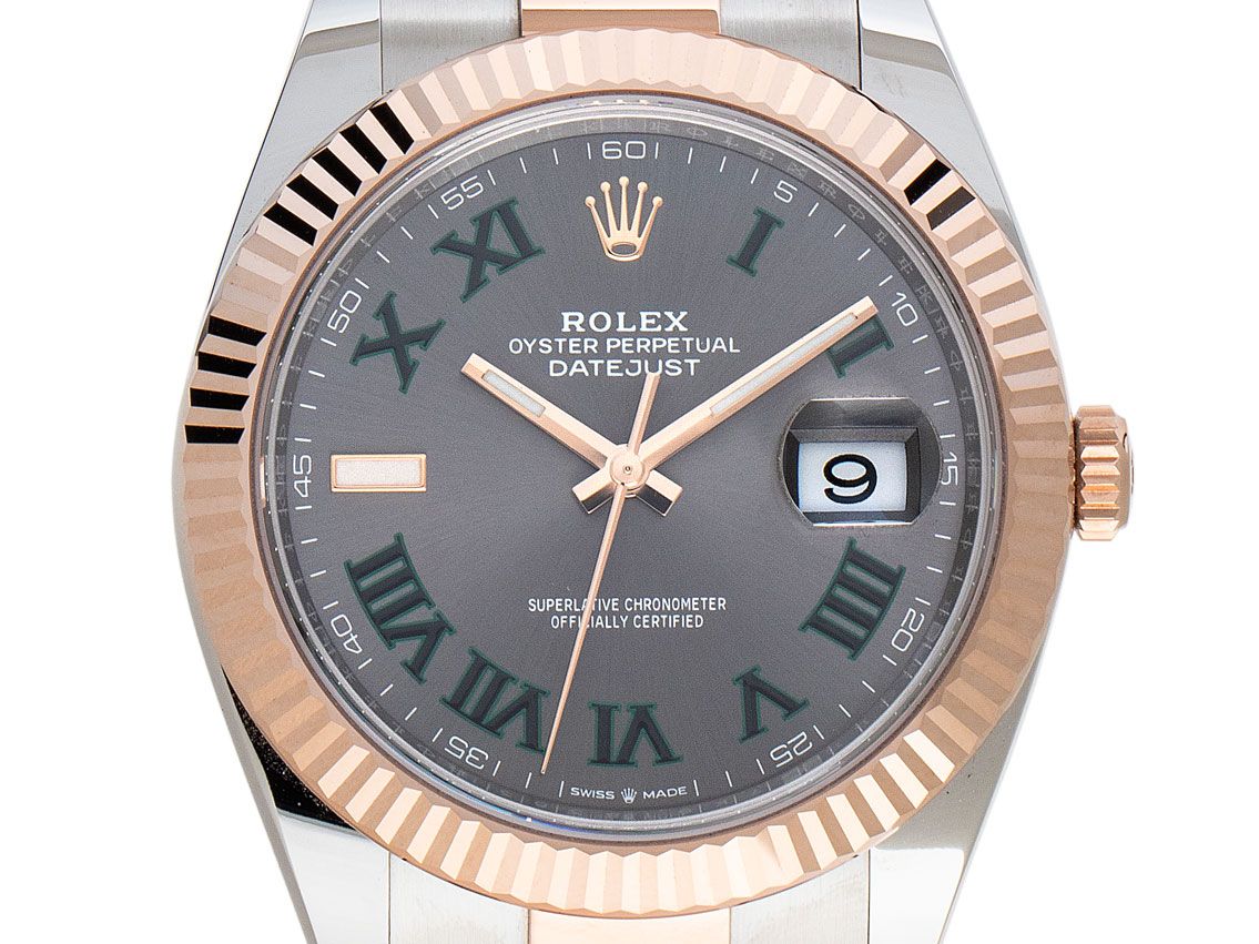 Gehäuse Edelstahl poliert und satiniert, Gehäusedurchmesser ohne Krone 41mm, Gehäusehöhe 11,8mm. Lünette 18kt Roségold Everose geriffelt und poliert. Armband Oyster Edelstahl / 18kt Roségold Everose poliert und satiniert, Rolex Faltschließe Edelstahl / 18kt Roségold Everose mit Hersteller-Logo. Zifferblatt Wimbledon schiefergrau mit roségoldenem Leuchtindex, dunkelgrünen römischen Ziffern und roségoldenen Leuchtzeigern. Uhrwerk Automatik, Chronometer mit Zeugnis, Rolex Manufakturkaliber 3235 mit 31 Edelsteinen, Gangreserve ca. 70 Stunden. Anzeige von Stunde, Minute und Sekunde über Zeiger aus der Mitte mit Sekundenstopp zur sekundengenauen Einstellung der Uhrzeit, Datumsanzeige mit Schnellverstellung unter Glaslupe bei 3 Uhr. Saphirglas kratzfest. Krone verschraubbar mit Hersteller-Logo. Boden Edelstahl verschraubt. Gewicht der Uhr inklusive Armband 146g, Länge des Armbandes inklusive Gehäuse 170mm. Wasserdicht bis 10 ATM. Referenznummer: 126331, ID: P1357250000825H-16800/15750, Artikelnummer: 10000081878. Original Rolex Box mit Umkarton und Garantie Papiere von November 2021, neue Rolex Garantie Karte ohne Ländercode sowie Beschreibung, Ledermäppchen, Rolex Chronometer-Siegel und Watchregister Auszug von August 2025, The Watch Register Zertifikat / ohne Eintrag (Internationale Datenbank für verlorene oder gestohlene Uhren), Full Set. Superschnäppchen, Kapitalanlage mit Wertsteigerungspotential, sehr seltenes Sammlerstück, fast nicht getragen. Wie Neu. Lieferzeit sofort.