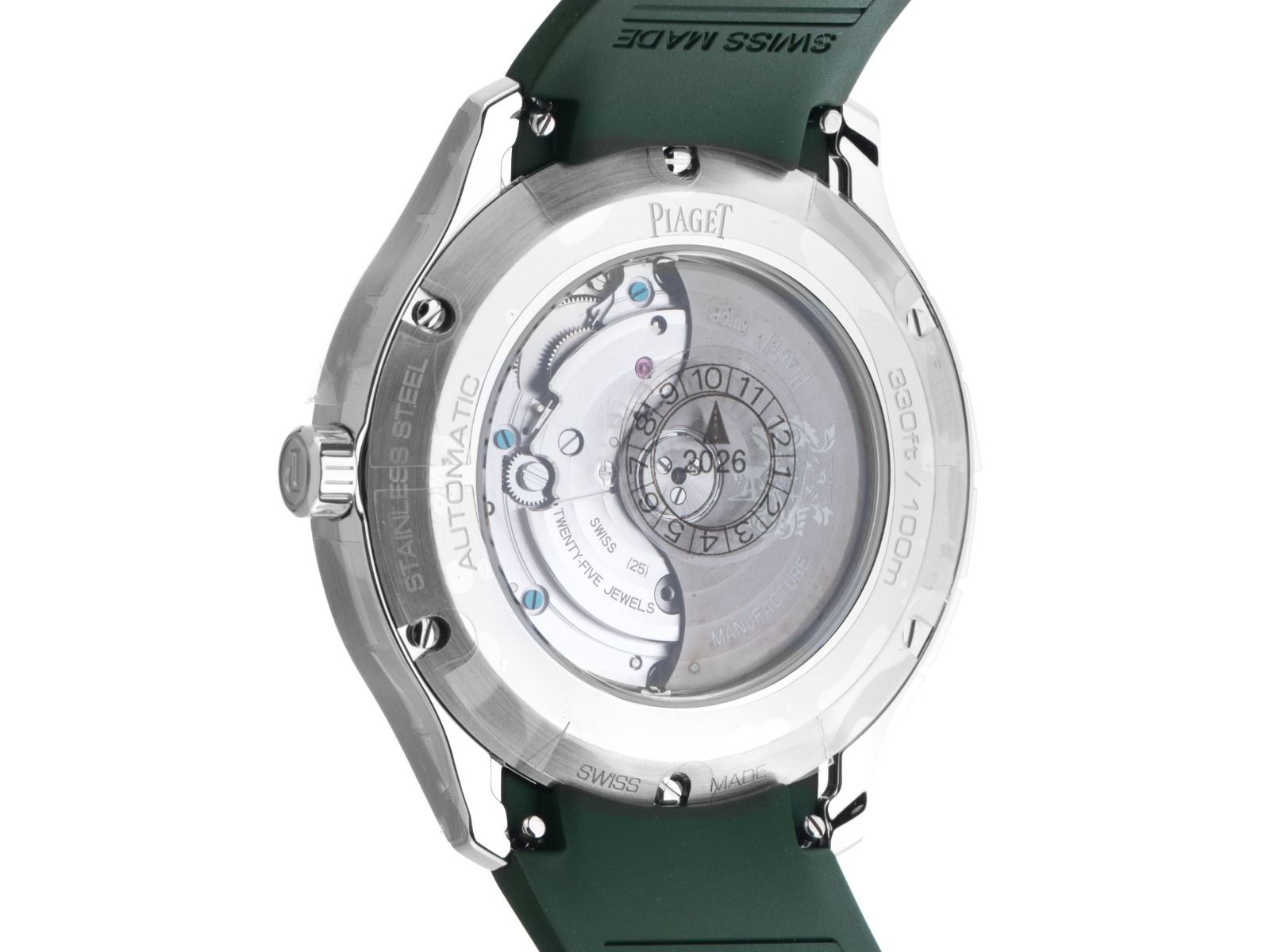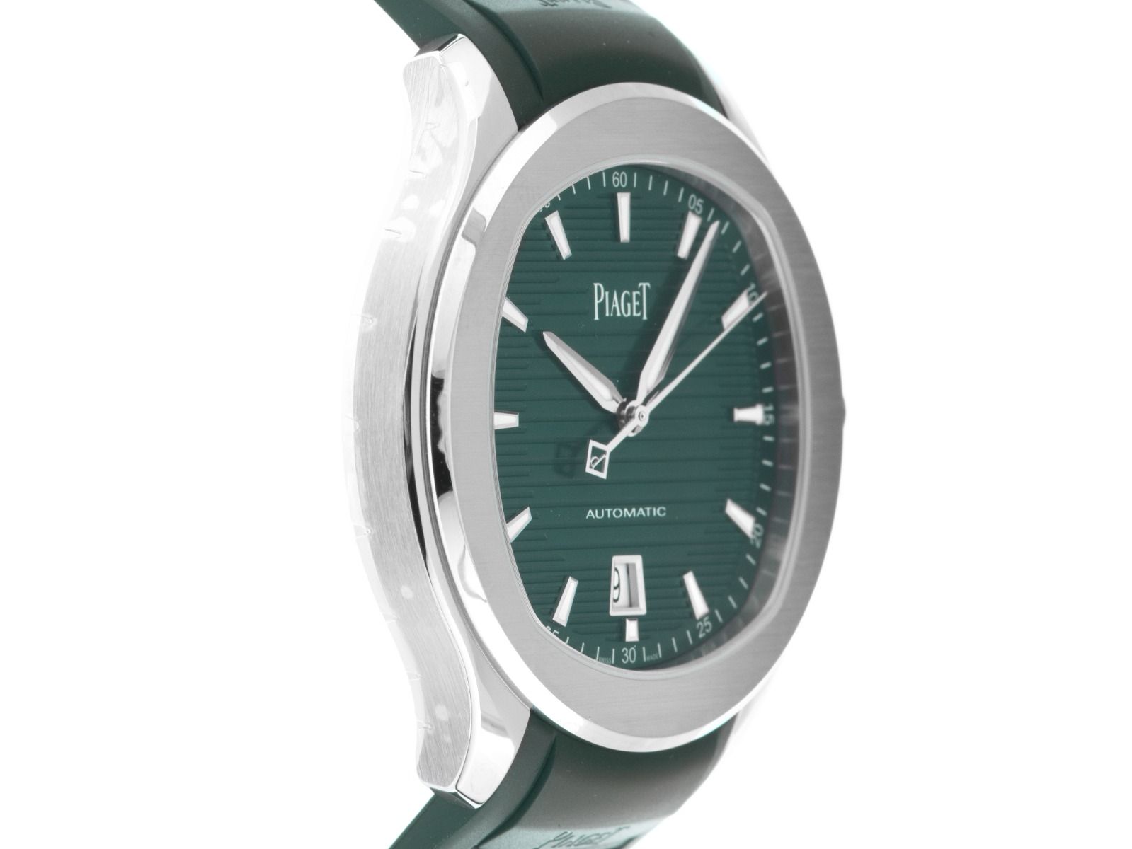 Gehäuse Edelstahl poliert und satiniert, Gehäusemaße ohne Krone 42mm, Gehäusehöhe 9,5mm. Lünette Edelstahl glatt, poliert und satiniert. Armband Kautschuk grün, Anstoßbreite 21mm, Doppelsicherheitsfaltschließe Edelstahl mit Herstellerlogo. Zifferblatt grün guillochiert mit aufgesetzten Leuchtindexen und Leuchtzeigern. Uhrwerk Automatik, Chronometer mit Zeugnis, Kaliber Piaget 111OP mit 25 Edelsteinen, Gangreserve ca. 50 Stunden. Anzeige von Stunde, Minute und Sekunde über Zeiger aus der Mitte mit Sekundenstopp zur sekundengenauen Einstellung der Uhrzeit, Datumsanzeige mit Schnellverstellung bei 6 Uhr. Saphirglas kratzfest. Krone verschraubbar mit Hersteller-Logo. Boden Edelstahl 6-fach verschraubt und graviert mit Saphirglas Sichtfenster. Gewicht der Uhr inklusive Armband 107g. Wasserdicht bis 10 ATM. Referenznummer: G0A48022, ID: ST5806178020825H-13300, Artikelnummer: 10000082112. Original Piaget Box mit Umkarton und Garantie Papiere von 2025, Full Set. Ungetragen. Lieferzeit sofort.