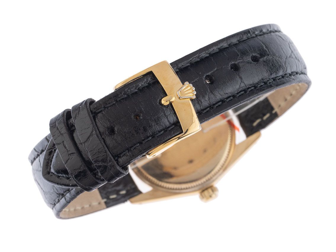 Gehäuse 18kt Gelbgold poliert, Gehäusedurchmesser ohne Krone 34mm, Gehäusehöhe 11,9mm. Lünette 18kt Gelbgold geriffelt und poliert. Armband Krokoleder schwarz mit Ziernaht, Anstoßbreite 18mm, Rolex Stiftschließe Gelbgold vergoldet mit Hersteller-Logo. Zifferblatt weiß mit aufgesetzten gelbgoldenen Indexen, schwarzen römischen Ziffern und gelbgoldenen Zeigern. Uhrwerk Automatik, Chronometer, Rolex Manufakturkaliber 2030 mit 28 Edelsteinen. Anzeige von Stunde, Minute und Sekunde über Zeiger aus der Mitte mit Sekundenstopp zur sekundengenauen Einstellung der Uhrzeit. Plexiglas gewölbt. Krone mit Hersteller-Logo. Boden 18kt Gelbgold verschraubt. Gewicht der Uhr inklusive Armband 43g. Referenznummer: 6751, Gehäusenummer: 6026XXX, Baujahr: 1980, ID: P154960100925H-6200, Artikelnummer: 10000082355. Mit Gangkontrolle und kompletter äußerlicher Aufarbeitung von September 2025. Original Rolex Box mit Umkarton und Beschreibung, Ledermäppchen, Übersetzungsheft, Rolex Chronometer-Siegel und Tag sowie Watchregister Auszug von September 2025, The Watch Register Zertifikat / ohne Eintrag (Internationale Datenbank für verlorene oder gestohlene Uhren). Superschnäppchen, Kapitalanlage mit Wertsteigerungspotential, extrem seltenes Sammlerstück. Sehr guter Zustand. Lieferzeit sofort.