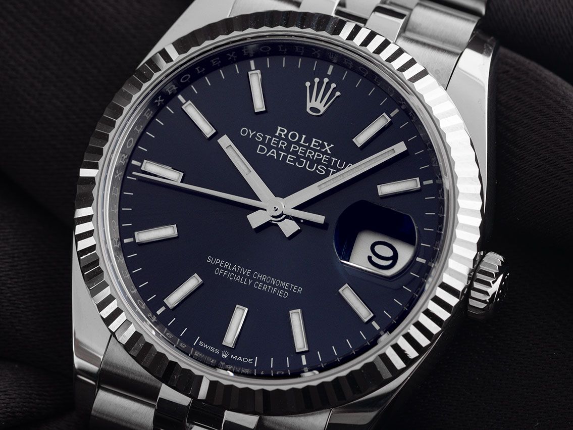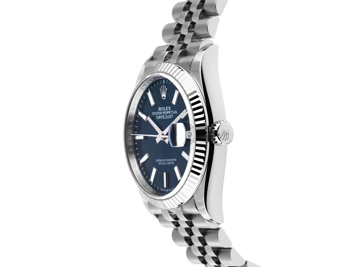 Gehäuse Edelstahl poliert und satiniert, Gehäusedurchmesser ohne Krone 36mm, Gehäusehöhe 11,5mm. Lünette 18kt Weißgold geriffelt und poliert. Armband Jubilé Edelstahl poliert und satiniert, Faltschließe Edelstahl mit Hersteller-Logo. Zifferblatt blau mit Sonnenschliff und weißgoldenen Leuchtindexen sowie weißgoldenen Leuchtzeigern. Uhrwerk Automatik, Chronometer mit Zeugnis, Rolex Manufakturkaliber 3235 mit 31 Edelsteinen, Gangreserve ca. 70 Stunden. Anzeige von Stunde, Minute und Sekunde über Zeiger aus der Mitte mit Sekundenstopp zur sekundengenauen Einstellung der Uhrzeit, Datumsanzeige mit Schnellverstellung unter Glaslupe bei 3 Uhr. Saphirglas kratzfest. Krone verschraubbar mit Hersteller-Logo. Boden Edelstahl verschraubt. Gewicht der Uhr inklusive Armband 114g, Länge des Armbandes inklusive Gehäuse 180mm. Referenznummer: 126234, ID: KV1647230001025H-15800/9450, Artikelnummer: 10000082787. Original Rolex Box mit Umkarton und Garantie Papiere von Oktober 2025, neue Rolex Garantie Karte ohne Ländercode sowie Beschreibung, Ledermäppchen, Rolex Chronometer-Siegel und Watchregister Auszug von Oktober 2025, The Watch Register Zertifikat / ohne Eintrag (Internationale Datenbank für verlorene oder gestohlene Uhren), Full Set. Kapitalanlage mit Wertsteigerungspotenzial. Ungetragen. Lieferzeit sofort.