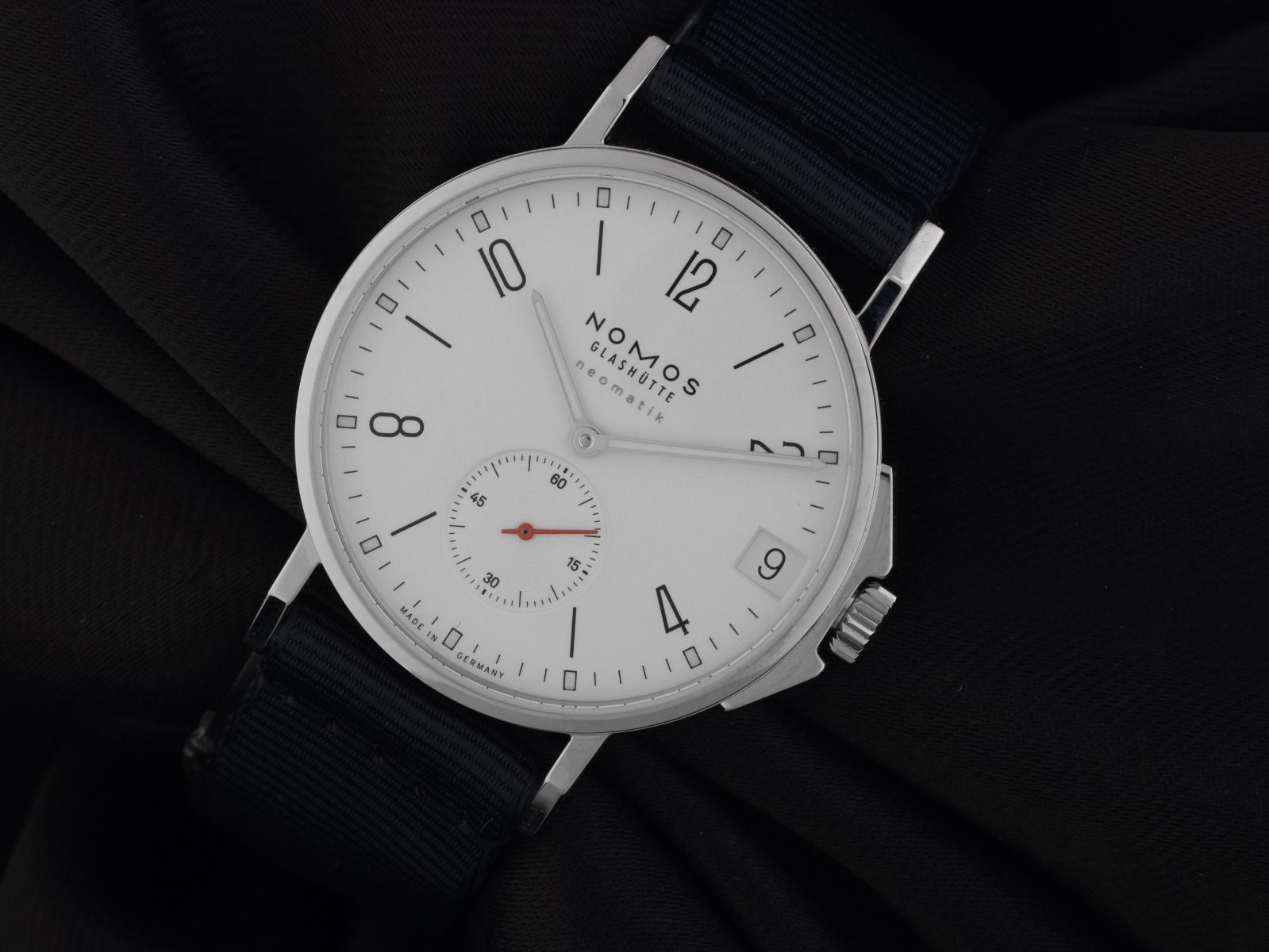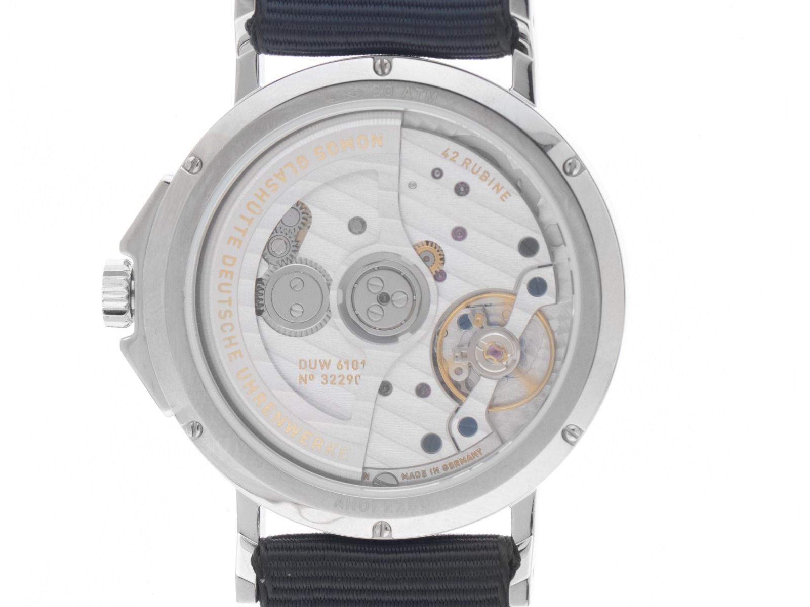 Behuizing van roestvrij staal, tweedelig, gepolijst, behuizingsdiameter zonder kroon 38,5 mm, behuizingshoogte 9,9 mm. Textiel armband in blauwzwart, aanzetbreedte 20 mm, pin-buckle van roestvrij staal met fabrikantlogo. Wijzerplaat, wit verzilverd, gegalvaniseerd met zwarte Arabische cijfers, indexen en roestvrijstalen luminescerende wijzers, evenals een rode secondewijzer. Uurwerk automatisch, manufactuurkaliber Nomos DUW6101 met 42 edelstenen, gangreserve van ongeveer 42 uur. Weergave van uur en minuut via centrale wijzers, kleine seconde met seconde-stop voor nauwkeurige tijdinstelling bij 6 uur. Saffierglas, krasbestendig. Kroon met schroefdraad en flankbescherming, voorzien van fabrikantlogo. Achterkant van roestvrij staal, 6-voudig geschroefd en gegraveerd met saffierglas kijkvenster. Gewicht van het horloge inclusief armband 58 g. Waterdicht tot 20 ATM. Referentienummer: 525, ID: ST116055501125H-4020, artikelnummer: 10000083226. Originele Nomos doos met omdoos en garantiepapieren van november 2025, Full Set. Nieuw. Leveringstijd direct.