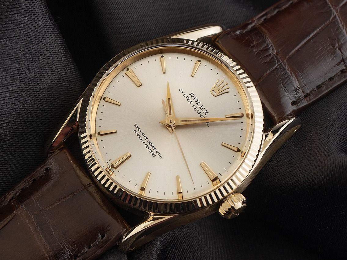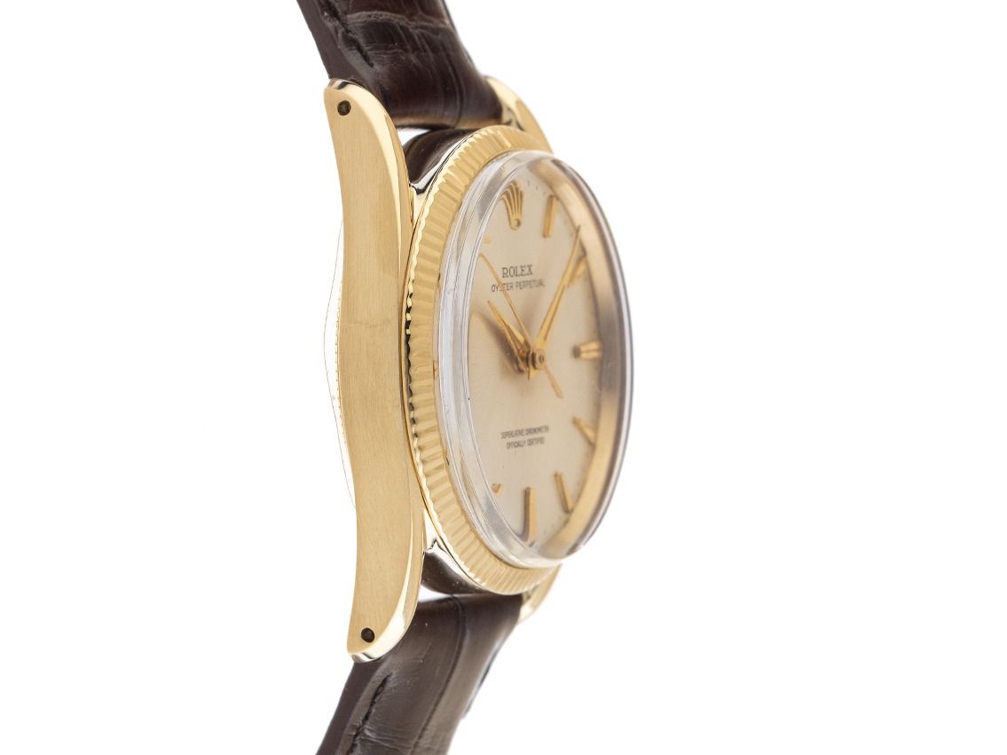 Gehäuse 18kt Gelbgold poliert und satiniert, Gehäusedurchmesser ohne Krone 33mm, Gehäusehöhe 11,5mm. Lünette 18kt Gelbgold geriffelt und poliert. Rolex Armband Krokoleder braun mit Ziernaht, Anstoßbreite 20mm, Rolex Stiftschließe Gelbgold vergoldet mit Hersteller-Logo. Zifferblatt silberfarben mit aufgesetzten gelbgoldenen Indexen und gelbgoldenen Zeigern. Uhrwerk Automatik, Chronometer, Rolex Manufakturkaliber 1560 mit 26 Edelsteinen. Anzeige von Stunde, Minute und Sekunde über Zeiger aus der Mitte. Plexiglas. Krone verschraubbar mit Hersteller-Logo. Boden 18kt Gelbgold verschraubt. Gewicht der Uhr inklusive Armband 51g. Referenznummer: 1011, Gehäusenummer: 1171XXX, Baujahr: 1965, ID: P201864521125H-7800, Artikelnummer: 10000083468. Mit Gangkontrolle und kompletter äußerlicher Aufarbeitung von Dezember 2025. Original Rolex Box und Ledermäppchen, Übersetzungsheft und sowie Watchregister Auszug von Dezember 2025, The Watch Register Zertifikat / ohne Eintrag (Internationale Datenbank für verlorene oder gestohlene Uhren). Kapitalanlage mit Wertsteigerungspotential, extrem seltenes Sammlerstück. Sehr guter Zustand. Lieferzeit sofort.