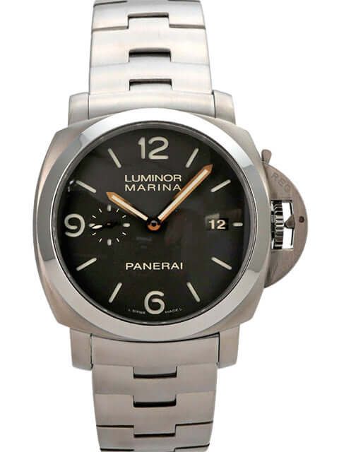 Panerai Luminor Marina 1950 3 Days Automatic Titanium Ref. PAM00352Case made of satin-finished titanium, diameter 44 mm, bezel made of polished titanium, strap made of satin-finished titanium, brown dial with fluorescent Arabic numerals and luminous indices, date display at 3 o'clock, seconds display at 9 o'clock, automatic movement, caliber Officine Panerai P.9000, fully manufactured by Officine Panerai, 28 jewels, 28,800 A/h, power reserve 72 hours, anti-reflective sapphire crystal made of corundum, 2.6 mm thick, small seconds display, titanium case back with transparent sapphire crystal, crown protection bridge made of satin-finished titanium, water-resistant up to 30 bar.