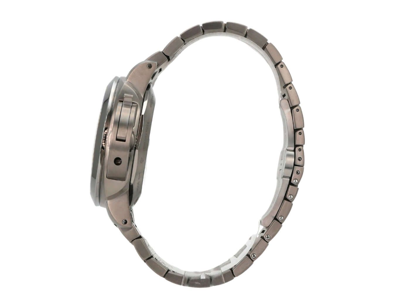 Behuizing gemaakt van satijn afgewerkt titanium, diameter 44 mm, bezel gemaakt van gepolijst titanium, band gemaakt van satijn afgewerkt titanium, bruine wijzerplaat met fluorescerende Arabische cijfers en luminescente indexen, datumaanduiding op 3 uur, secondenweergave op 9 uur, automatische beweging, kaliber Officine Panerai P.9000, volledig vervaardigd door Officine Panerai, 28 juwelen, 28.800 A/h, gangreserve van 72 uur, antireflecterend saffierglas van korund, 2,6 mm dik, kleine secondenweergave, titanium achterdeksel met transparant saffierglas, kroonbeschermingsbrug van satijn afgewerkt titanium, waterbestendig tot 30 bar.