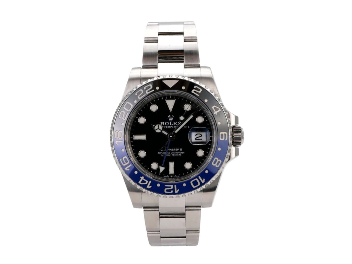 Rolex GMT-Master II stainless steel 126710BLNR Oyster bracelet 2022Case made of polished and satin-finished stainless steel, case diameter 40 mm, case height 12 mm, stainless steel bezel fluted with black/blue ceramic insert, 24-hour scale rotatable in both directions, Oyster stainless steel bracelet polished and satin-finished with safety folding clasp, black dial with applied luminous indices and luminous dots, luminous hands, automatic movement, Rolex manufacture caliber 3285 with 31 jewels, frequency 28,800 A/h, 70-hour power reserve, date display, GMT / second time zone, chronometer, sapphire crystal, screw-down crown with flank protection, screw-down stainless steel case back, water-resistant up to 10 bar.