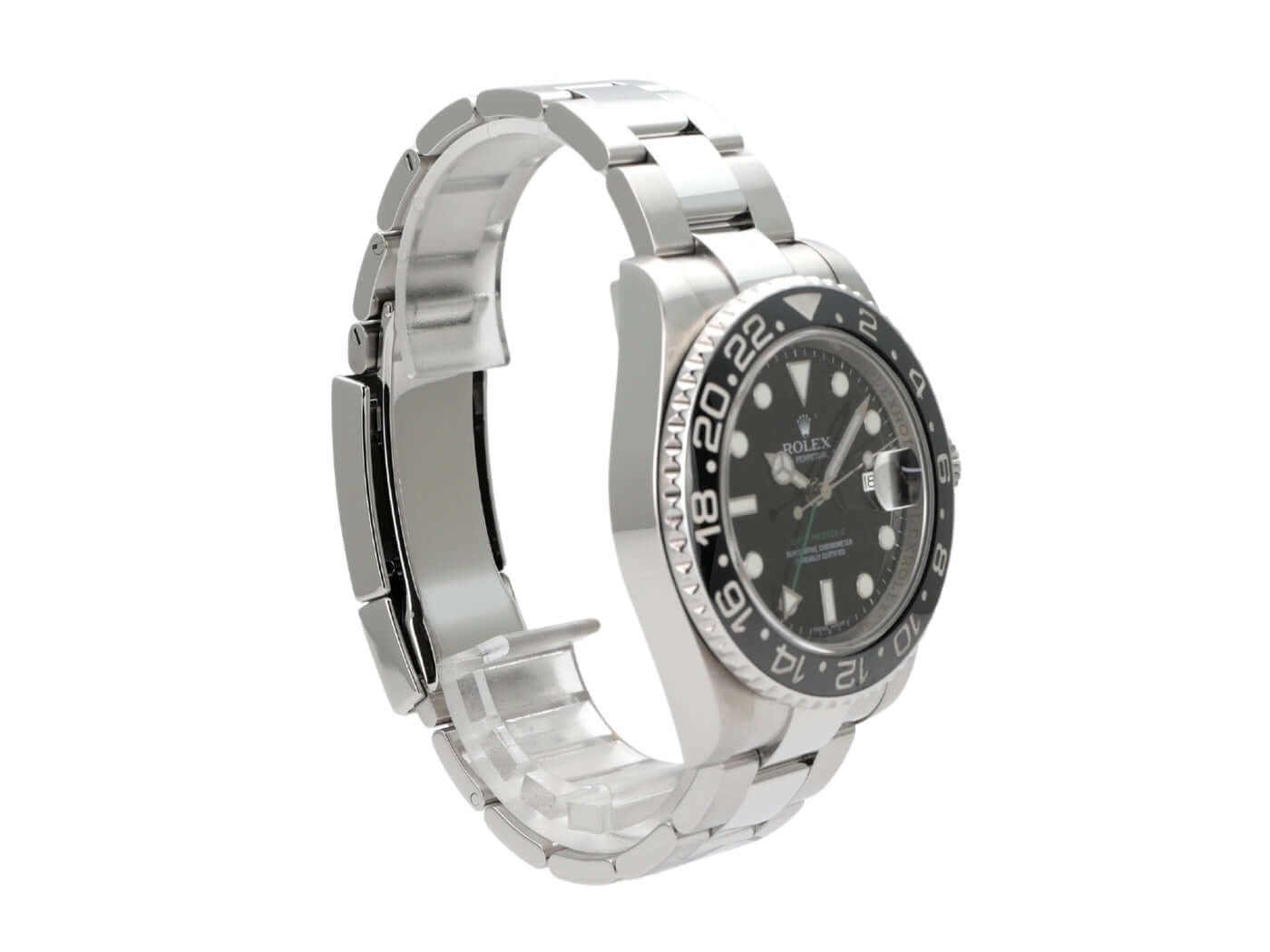 Rolex GMT-Master II Stainless Steel Ref. 116710LN LC100 from 2008 M-SeriesCase made of polished and satin-finished stainless steel, case diameter 40 mm, case height 12 mm, stainless steel bezel with ridges and black ceramic insert with 24-hour scale, rotatable, Oyster stainless steel bracelet polished and satin-finished with safety folding clasp, black dial with applied luminous indices and luminous dots, luminous hands, automatic movement, Rolex manufacture caliber 3186 with 31 jewels, 28,800 A/h, date display with magnifying glass, second time zone, chronometer, sapphire crystal, screw-down crown with crown guards, screw-down stainless steel case back, water-resistant up to 10 bar.