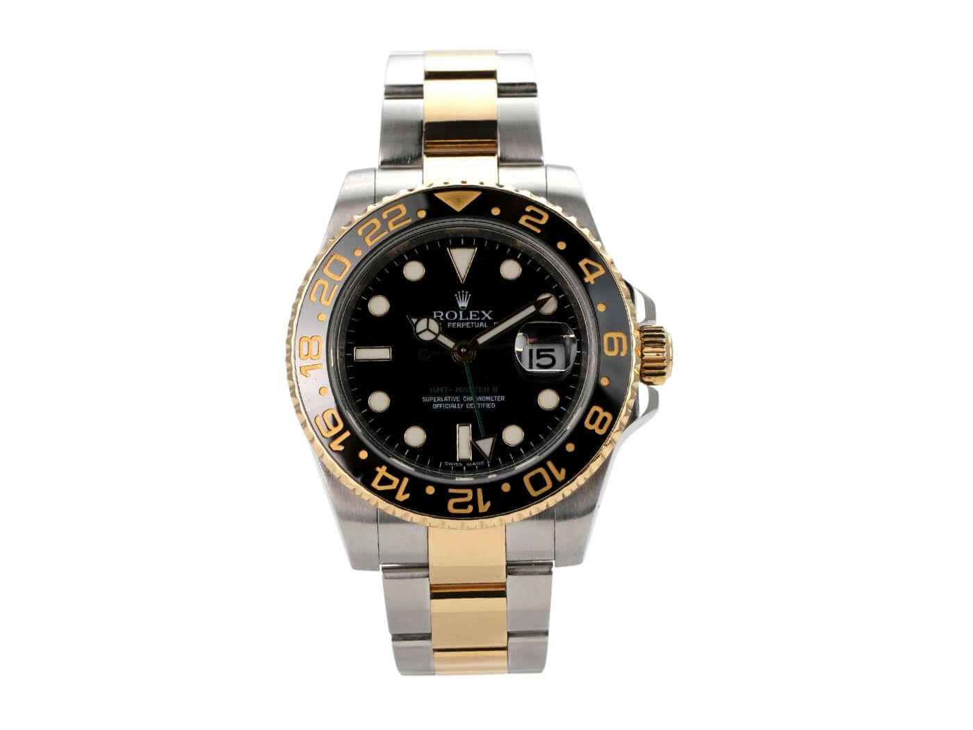Rolex GMT-Master II Ref. 116713LN from 2008Case made of polished and satin-finished stainless steel, case diameter 40 mm, case height 12.1 mm, 18 kt yellow gold fluted bezel with black ceramic insert and 24-hour scale, bidirectional rotating, Oyster stainless steel / 18 kt yellow gold bracelet polished and satin-finished with safety folding clasp, black dial with applied luminous indices and luminous dots, luminous hands, automatic movement, Rolex manufacture caliber 3186 with 31 jewels, frequency 28,800 A/h, date display, second time zone, chronometer, scratch-resistant sapphire crystal, screw-down yellow gold crown with crown guards, screwed stainless steel case back, water-resistant up to 10 bar.