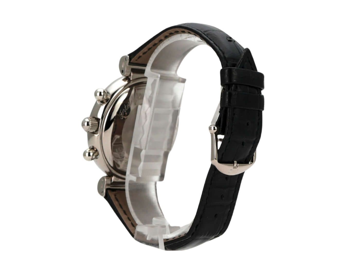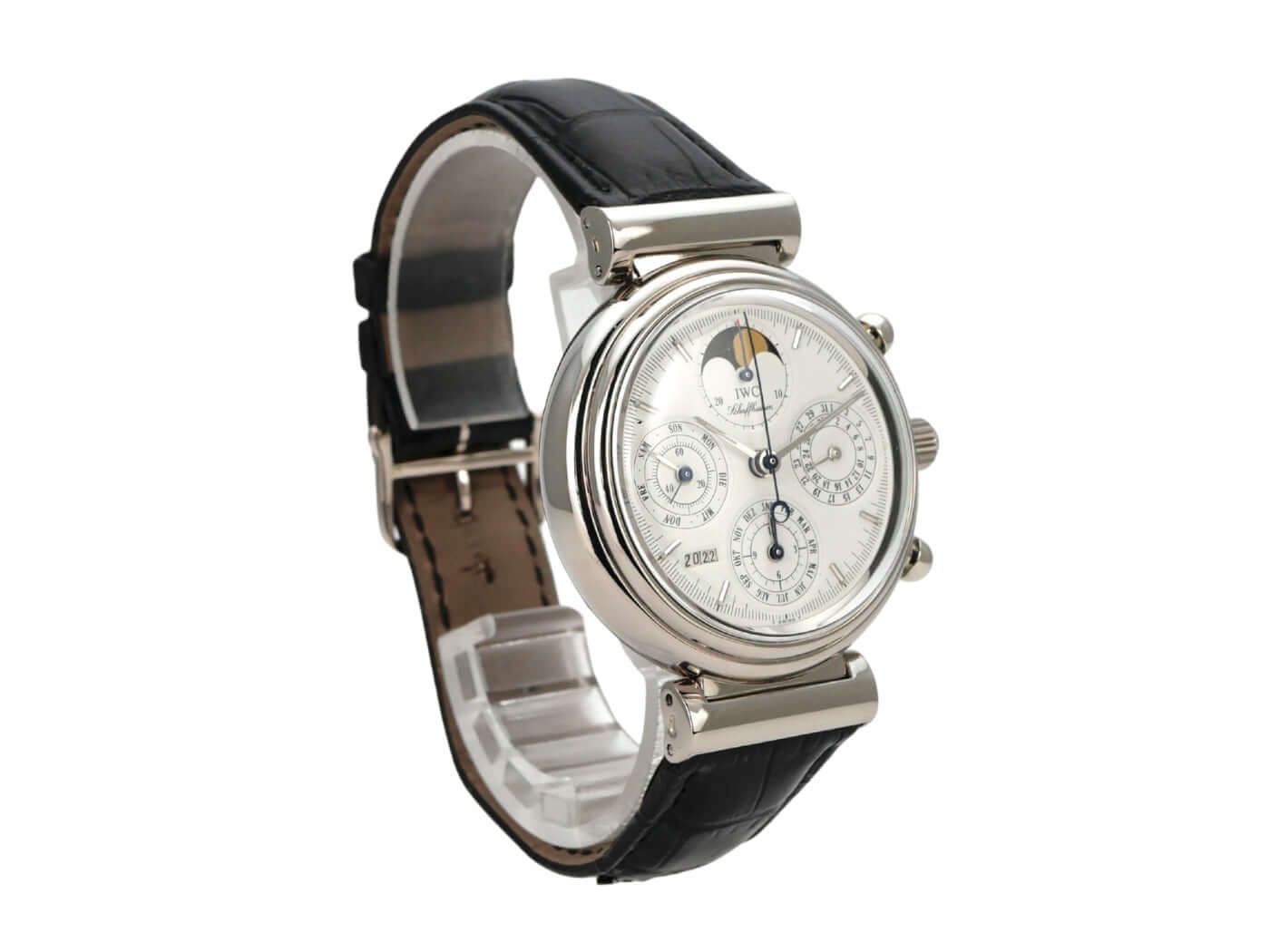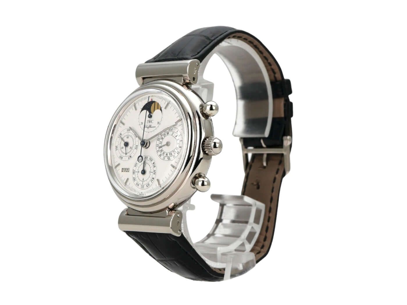 IWC Da Vinci Perpetual Calendar Ref. IW3750Case made of polished and satin-finished stainless steel, case diameter 39 mm, black leather strap with pin buckle, white dial, automatic movement, date display, day of the week display, annual calendar, moon phase, 44-hour power reserve, sapphire crystal, water-resistant up to 3 bar.Used watch, very good condition, with box and archive extract from IWC, delivered in 1990.