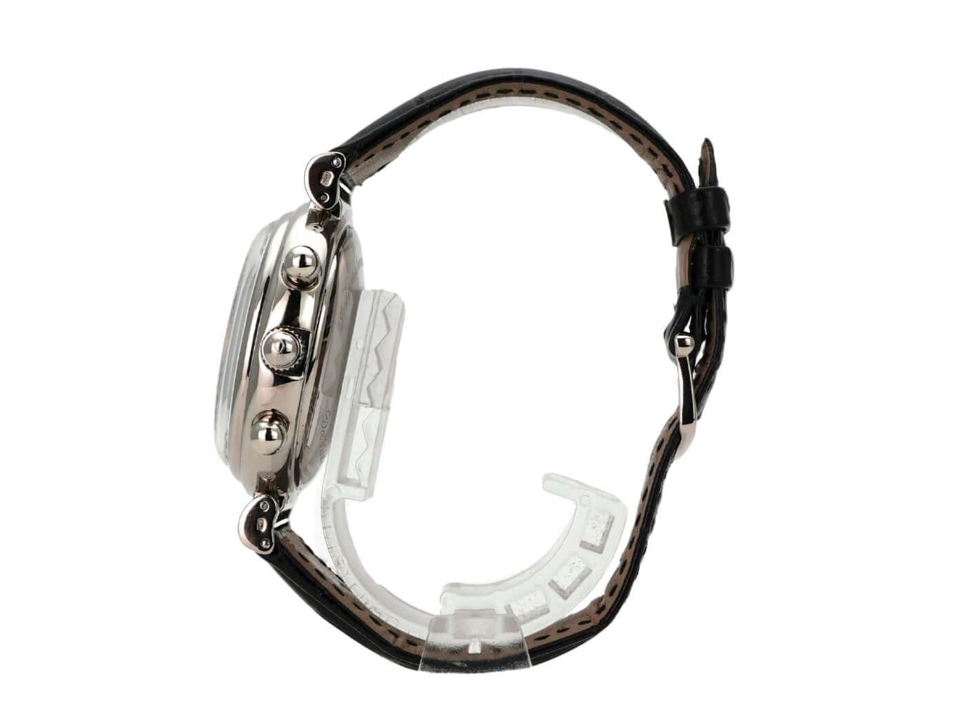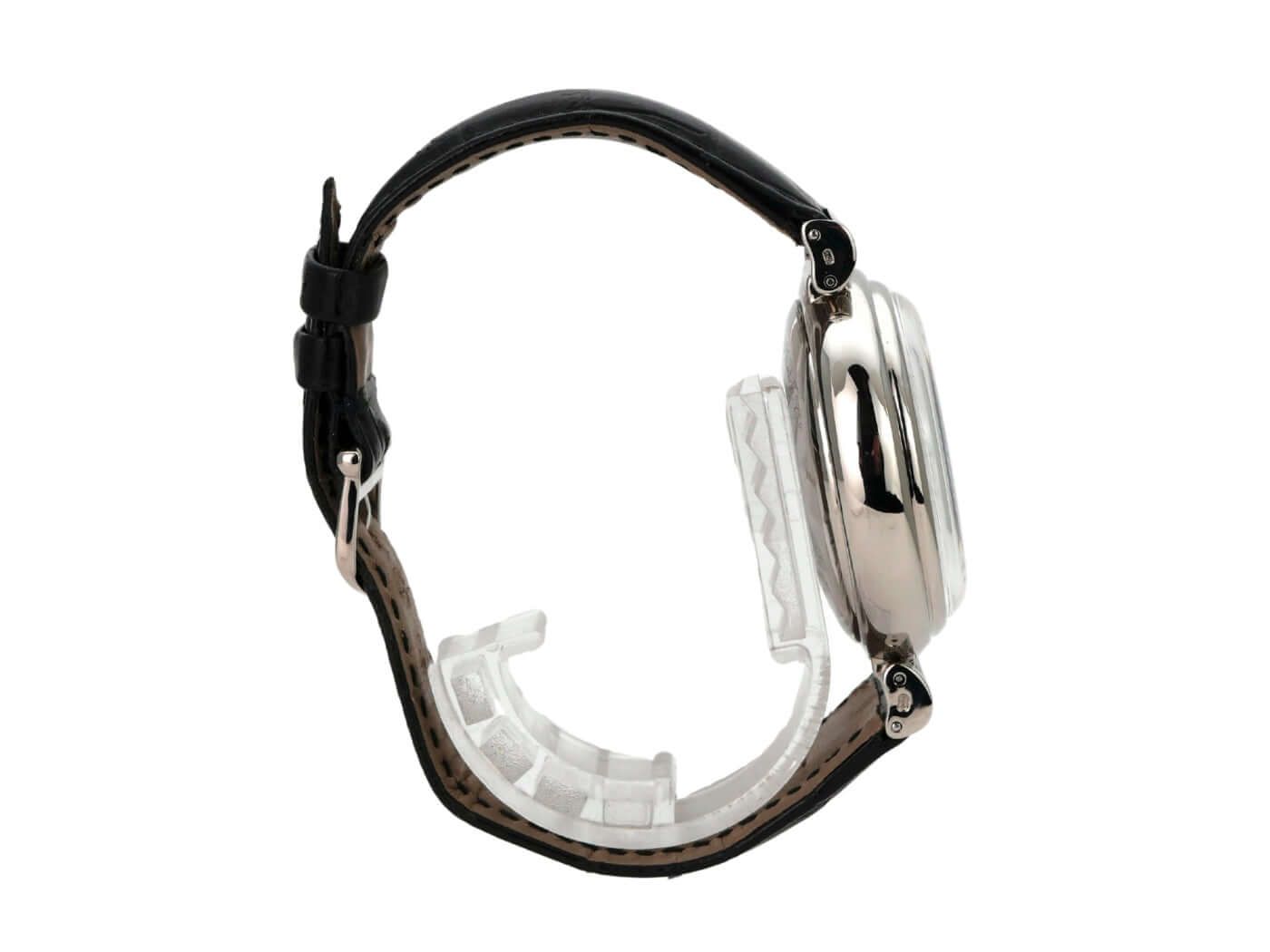 Kast gemaakt van gepolijst en satijn afgewerkt roestvrij staal, kastdiameter 39 mm, zwarte leren band met gesp, witte wijzerplaat, automatische beweging, datumaanduiding, weekdagweergave, jaarlijkse kalender, maanfase, 44 uur gangreserve, saffierglas, waterbestendig tot 3 bar.