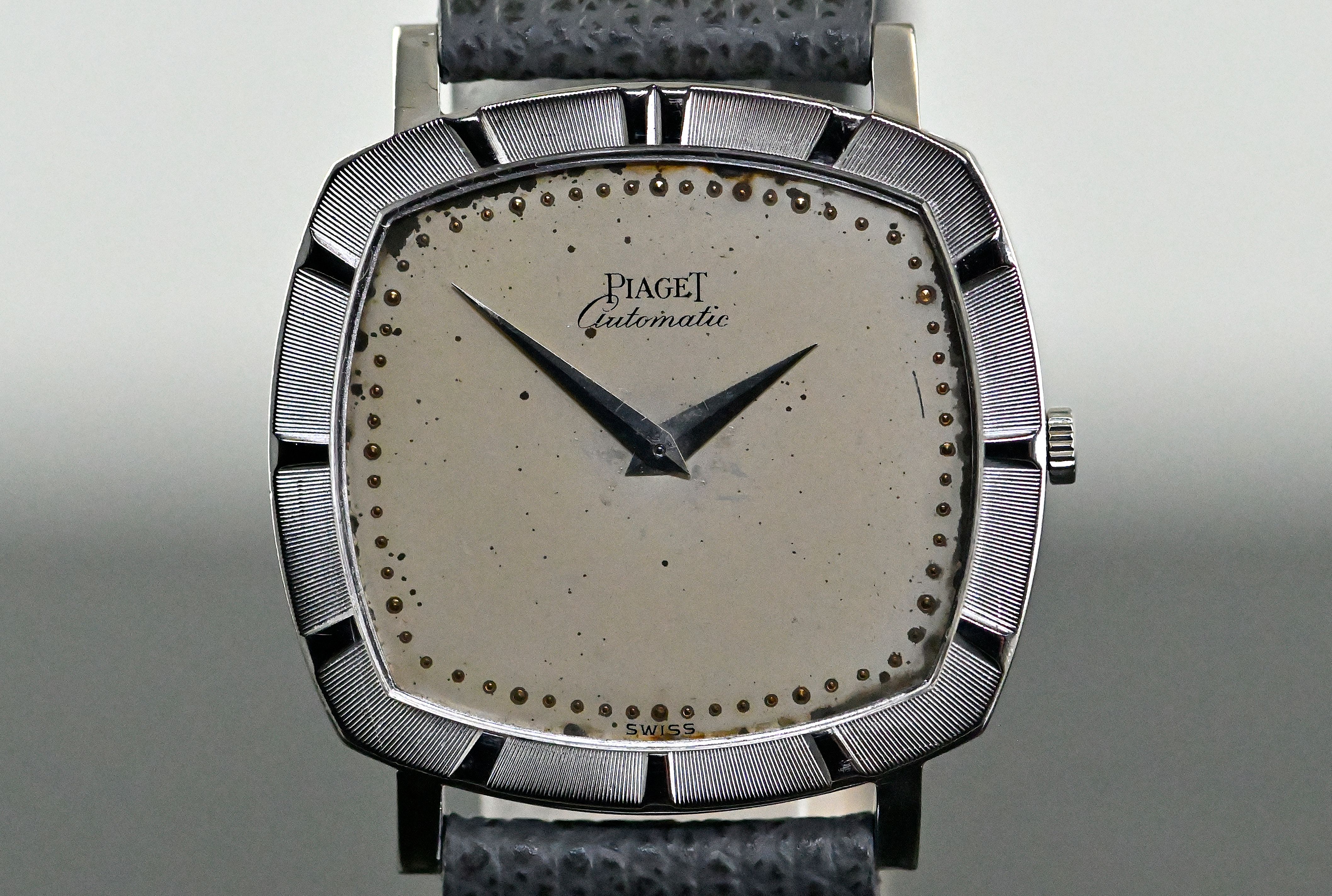 Vintage Piaget Dress Watch TV Screen | reference 12423 | in 18k white gold | Piaget automatic caliber 12P with micro-rotor was completely serviced in May 2025 – invoice for 470 € enclosed | gray leather strap with a neutral steel buckle | left side of the case is a gold hallmark | rarely been polished | good condition with normal signs of wear for its age, but without any major dents or scratches | dimensions 32 × 30 mm (without crown) | total weight is approx. 38.0 grams.