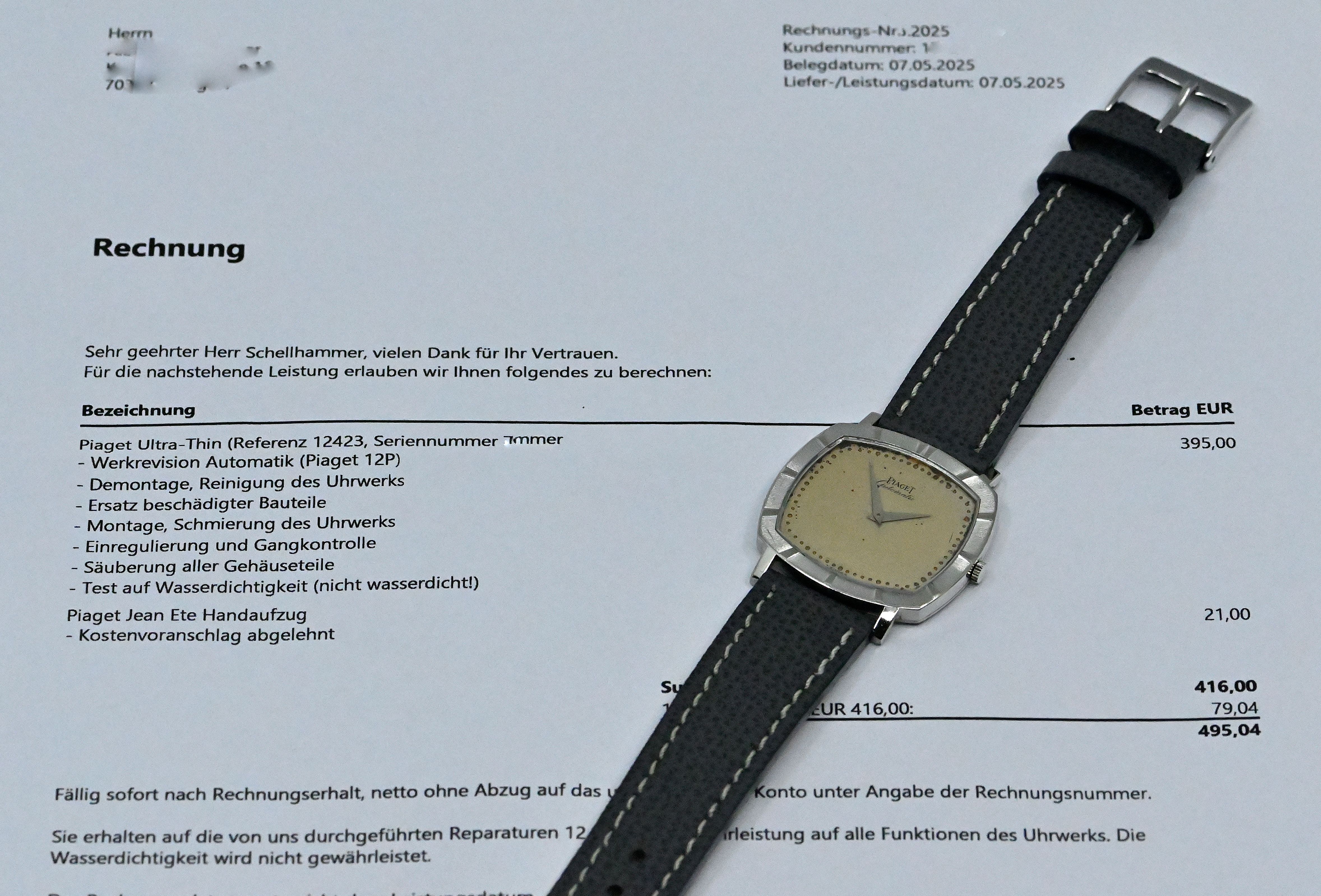 Vintage Piaget Dress Watch TV Screen | referentie 12423 | in 18k witgoud | Piaget automatische kaliber 12P met micro-rotor is volledig onderhouden in mei 2025 – factuur van 470 € bijgevoegd | grijze leren band met een neutrale stalen gesp | aan de linkerkant van de kast staat een gouden keurmerk | zelden gepolijst | goede staat met normale gebruikssporen voor zijn leeftijd, maar zonder grote deuken of krassen | afmetingen 32 × 30 mm (zonder kroon) | totaalgewicht is ongeveer 38,0 gram.