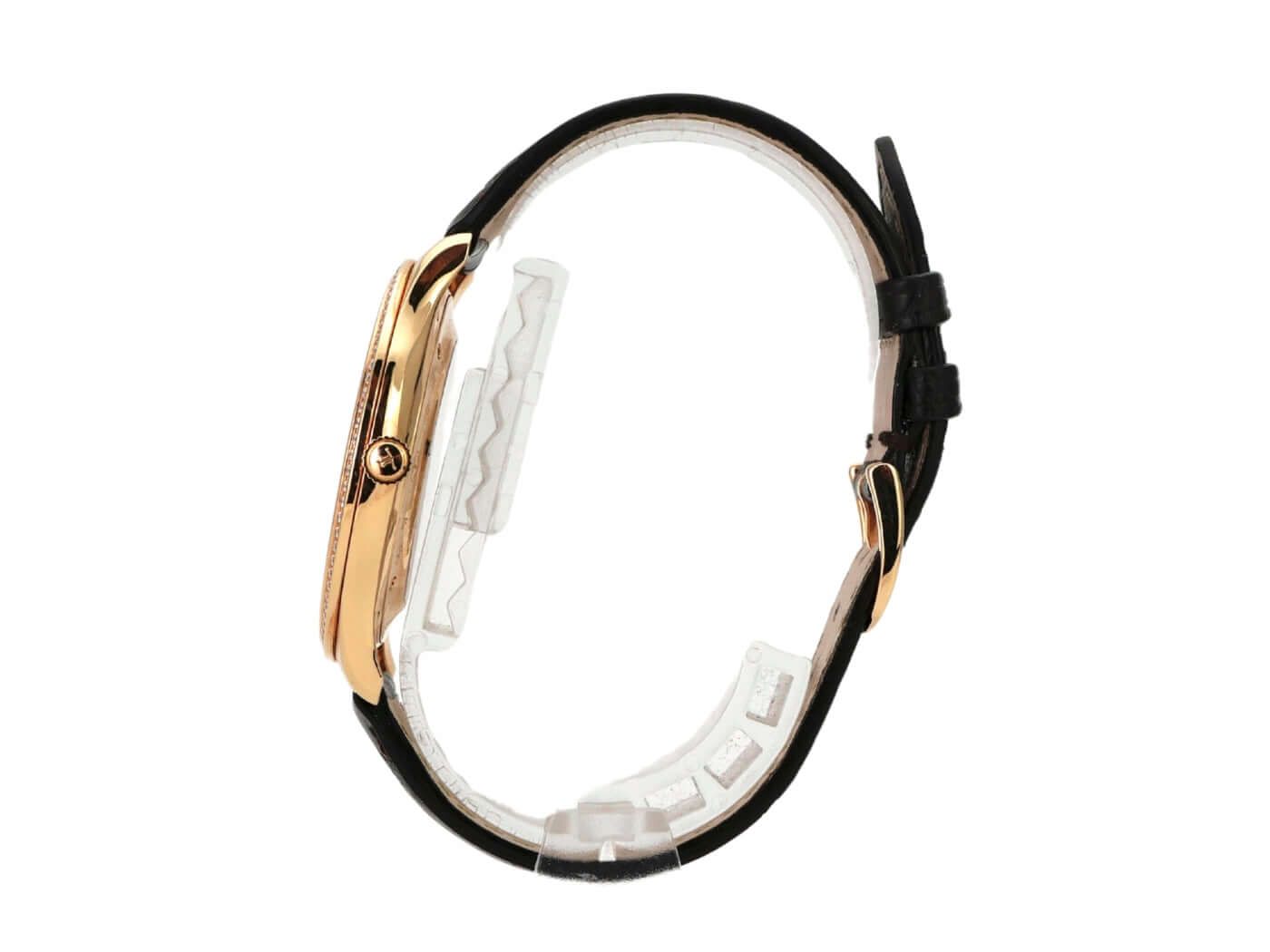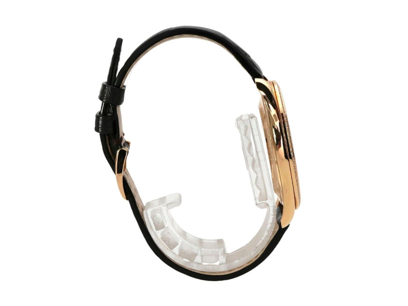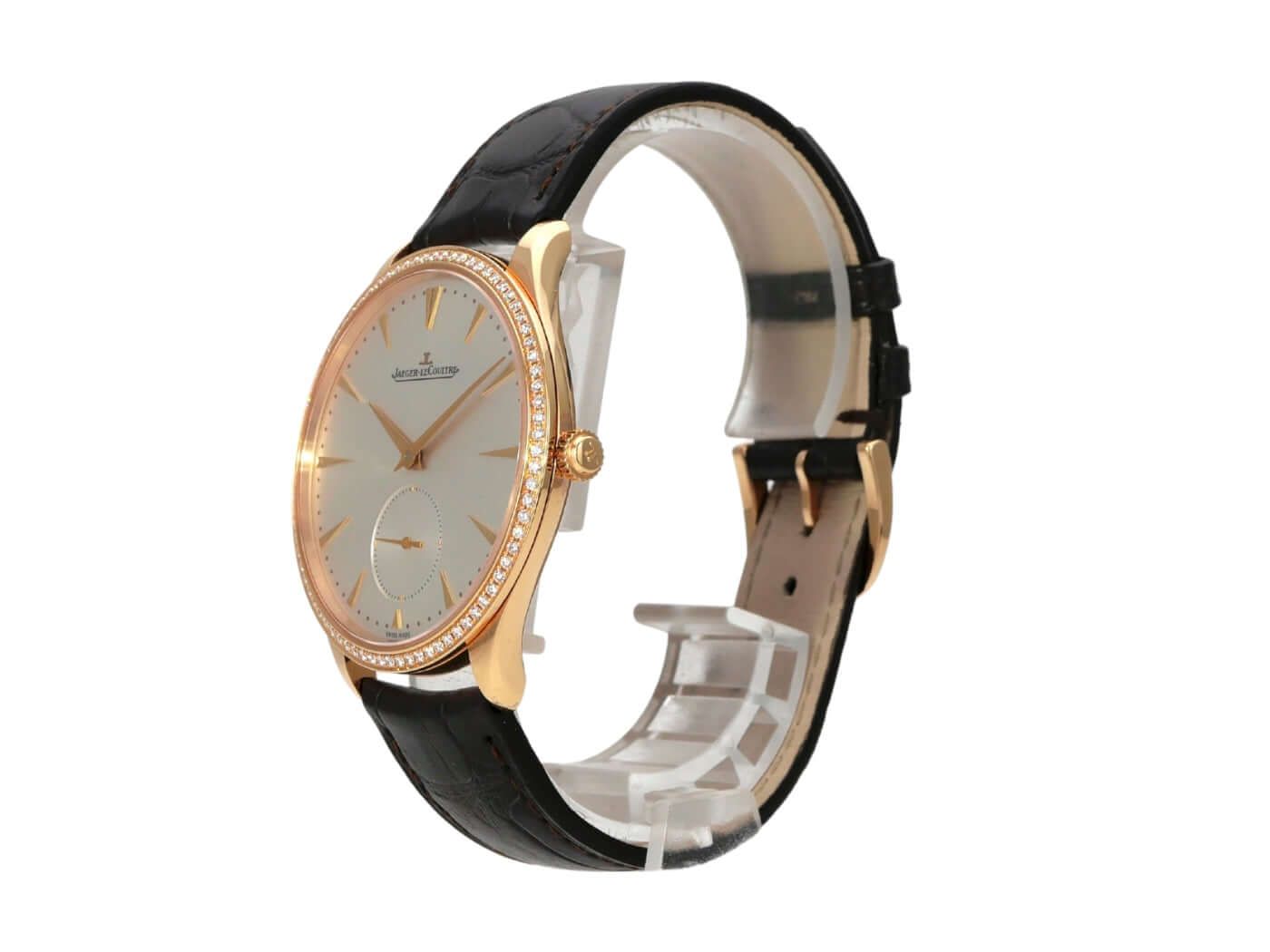 Jaeger-LeCoultre Master Grande Ultra Thin Ref. Q1272501Case made of polished 18 kt rose gold, case diameter 39 mm, case height 7.6 mm, polished rose gold bezel with diamonds, brown alligator leather strap with pin buckle, silver dial, automatic, Jaeger-LeCoultre caliber 896/1, 28,800 A/h, power reserve approx. 43 hours, central seconds, date, sapphire crystal, sapphire crystal display back, water-resistant up to 5 bar.