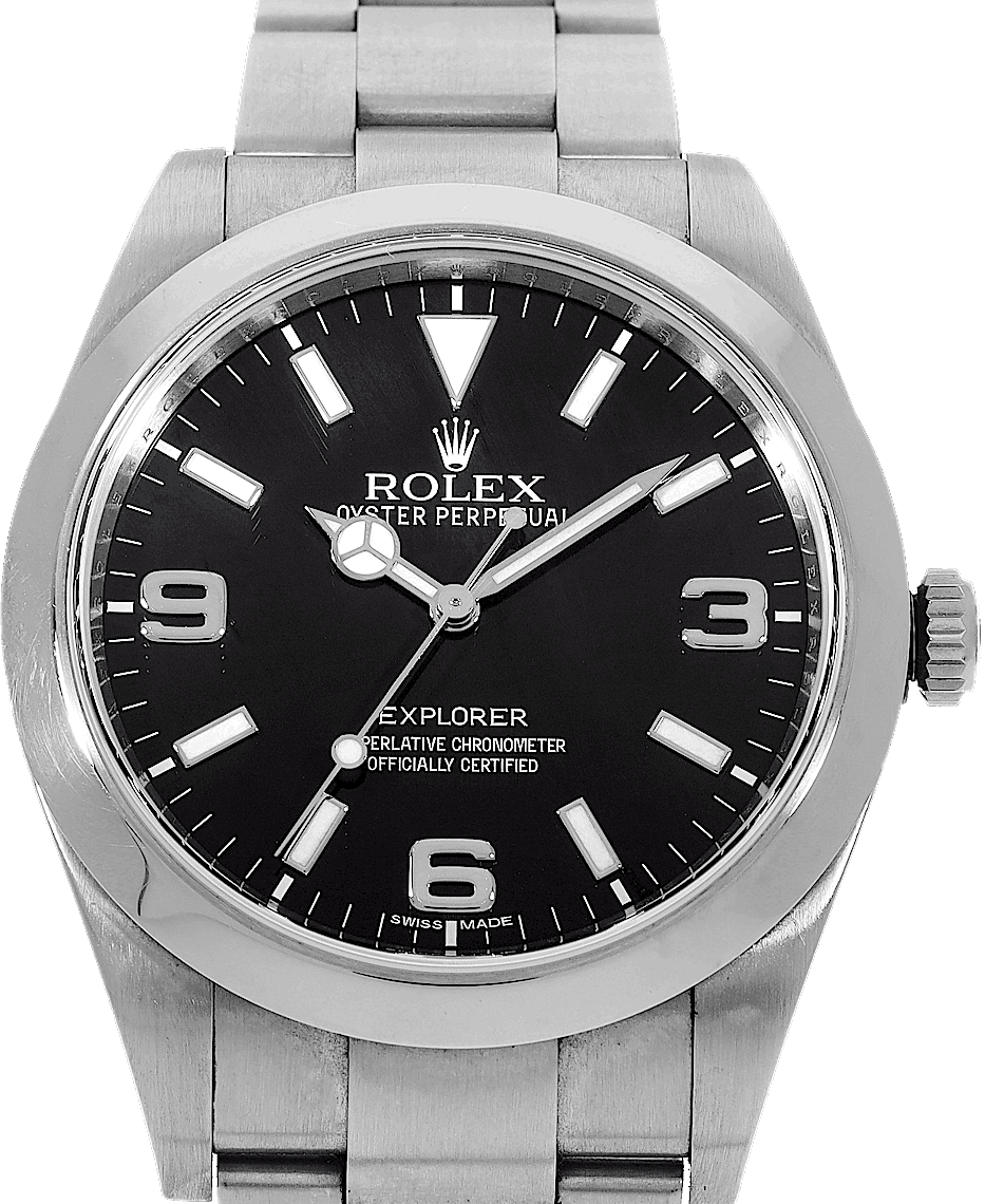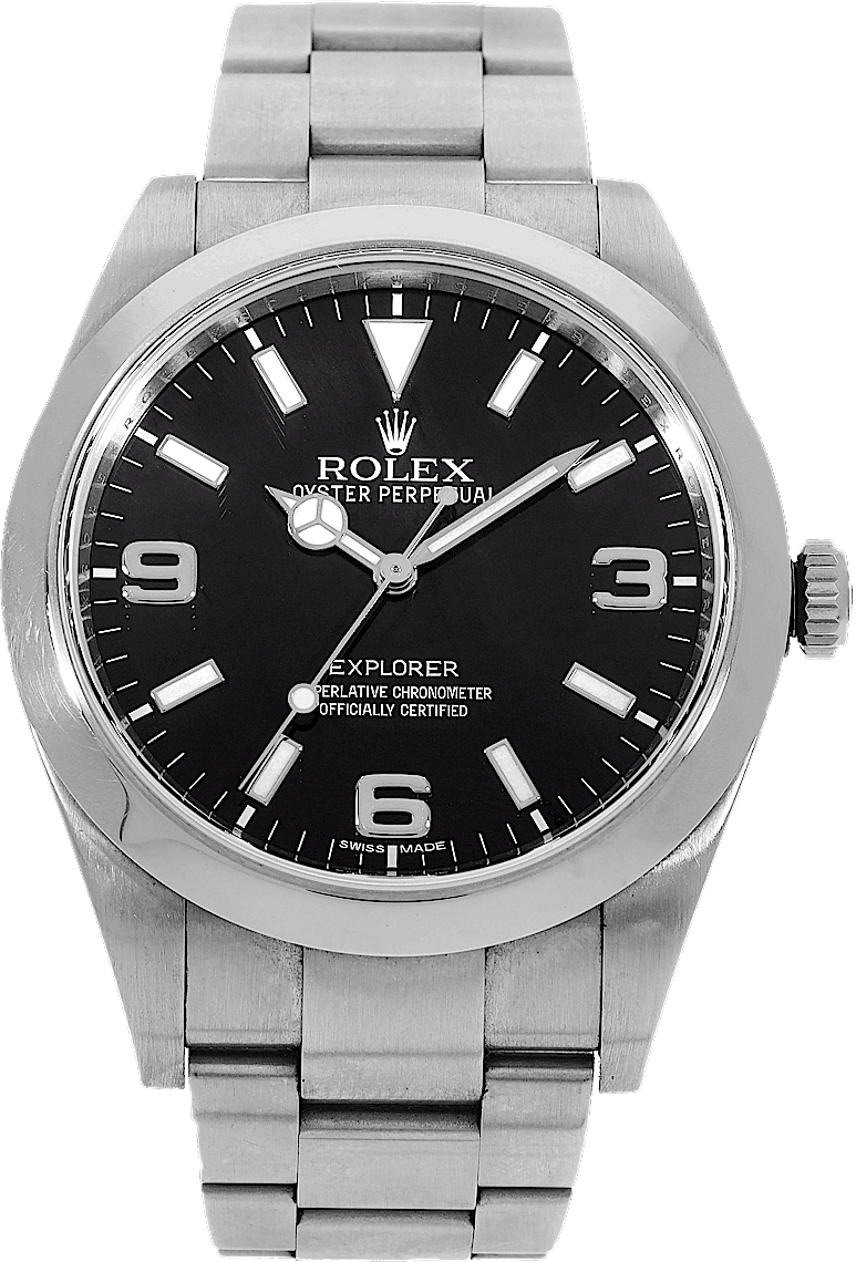 Rolex Explorer I, Reference: 214270, Gender: Male, Size: 39mm, Dial color: Black, Strap material: Stainless Steel, Movement: Automatic, Condition: Previously worn with some signs of usage. The movement is flawless and the case has been cleaned. watch tested to ensure full functionality. An inspection by our certified watchmakers guarantees its authenticity., Documents: Original papers, CHRONEXT Certificate