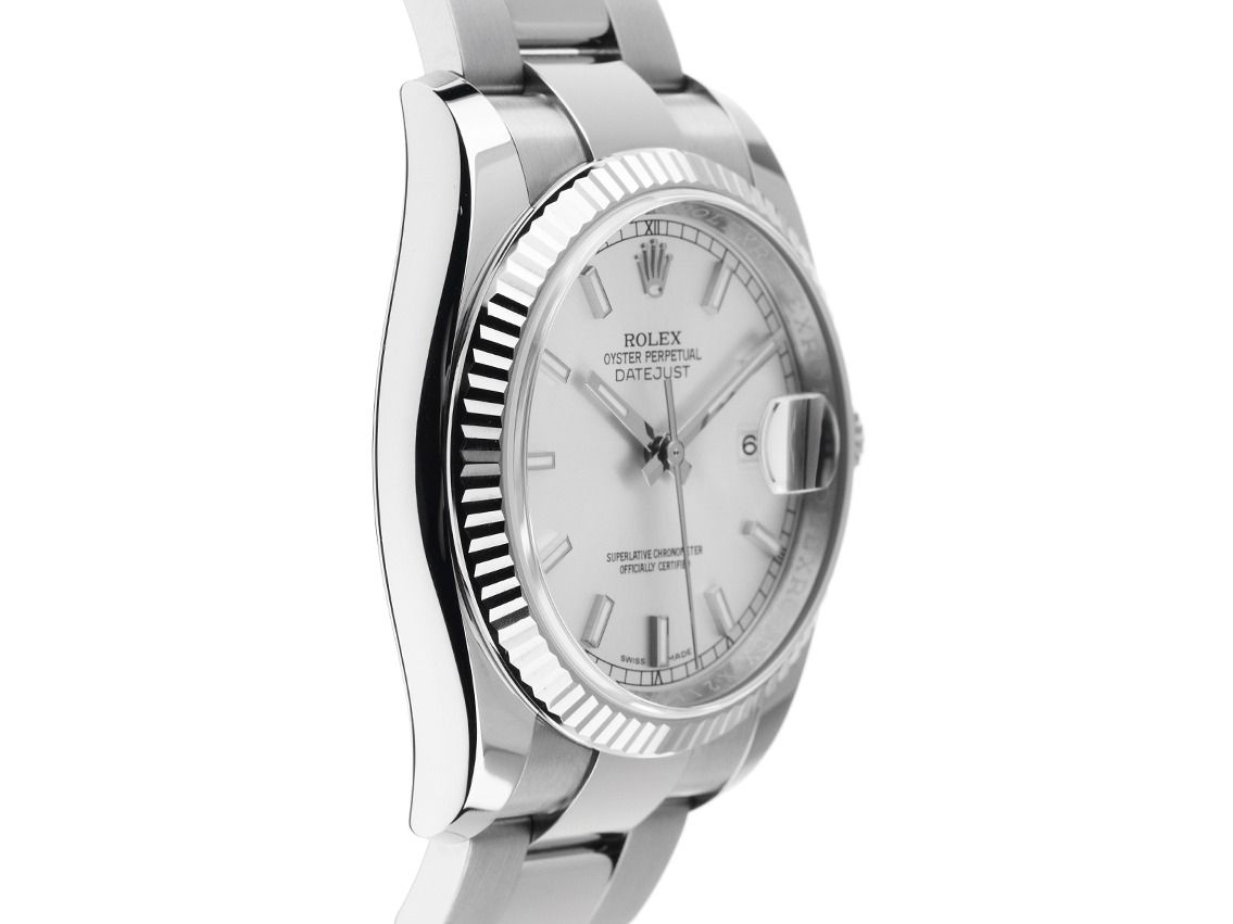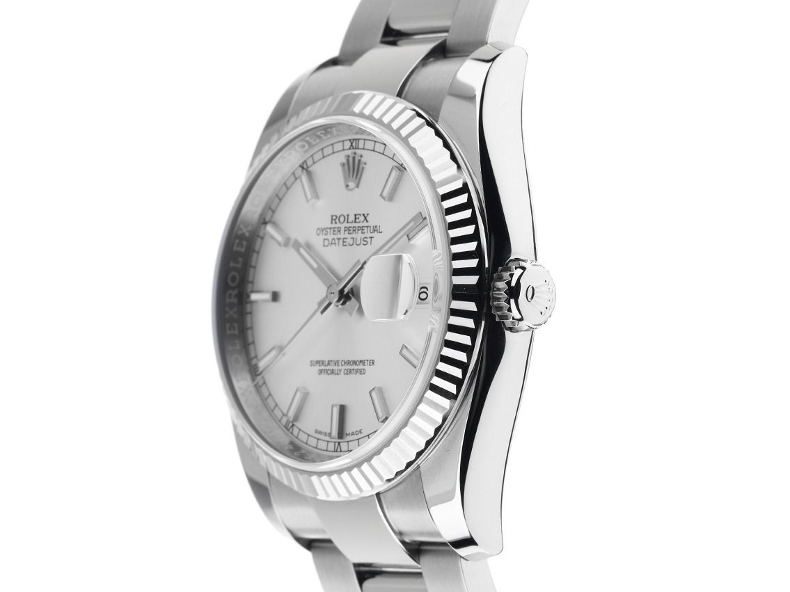 Gehuis van gepolijst en satijn afgewerkt roestvrij staal, behuizingsdiameter zonder kroon 36mm, behuizingshoogte 11,8mm. Lunette van 18kt witgoud, geribbeld en gepolijst. Oyster armband van gepolijst en satijn afgewerkt roestvrij staal, vouwsluiting van roestvrij staal met fabrikantlogo. Wijzerplaat zilverkleurig met opgezette witgouden indexen en witgouden wijzers. Uurwerk automatisch, chronometer met certificaat, Rolex manufactuurkaliber 3135 met 31 edelstenen. Weergave van uur, minuut en seconde via centrale wijzers met seconde-stop voor nauwkeurige tijdinstelling, datumweergave met snelle instelling onder vergrootglas op 3 uur. Saffierglas krasbestendig. Kroon met schroefdraad en fabrikantlogo. Achterkant van roestvrij staal, geschroefd. Gewicht van het horloge inclusief armband 127g. Lengte van de armband inclusief behuizing 185mm. Referentienummer: 116234, behuizingsnummer: 70R30XXX, ID: P2104102001225H-9900, artikelnummer: 10000083835. Met gangcontrole en volledige uiterlijke opfrissing van december 2025. Originele Rolex doos met omdoos en garantiepapieren van maart 2011, LC 100 / Duitsland EU, evenals beschrijving, lederen etui, Wempe kaart, Rolex chronometerzegel en datum, en uittreksel van het horregister van december 2025, The Watch Register certificaat / zonder vermelding (Internationale database voor verloren of gestolen horloges), Full Set. Superscherpe aanbieding, investering met waardevermeerderingspotentieel, zeer zeldzaam verzamelobject. Als nieuw. Leveringstijd direct.
