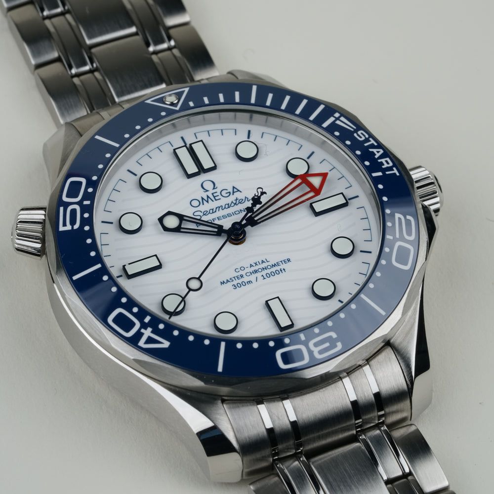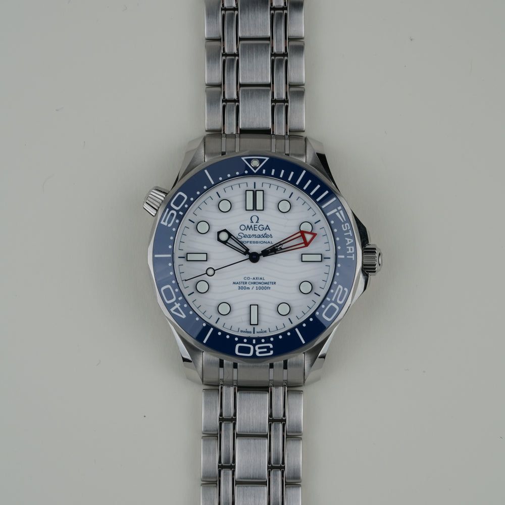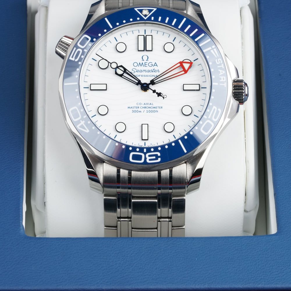 Omega Seamaster Diver 300m 210.30.42.20.04.002. 37th America’s Cup Barcelona reference 210.30.42.20.04.002 including Full Set. The Omega Seamaster Diver 300m 210.30.42.20.04.002 measures a 42 mm stainless steel case, a smooth bezel and stainless steel bracelet with deployment clasp. The Seamaster Diver 300m 210.30.42.20.04.002 features a white dial with index hour markers and blue red hands with a sapphire crystal on top. The seconds marker has the trophy on the end of the marker. This Omega Seamaster 37th America’s Cup Barcelona features an automatic movement caliber 8806.