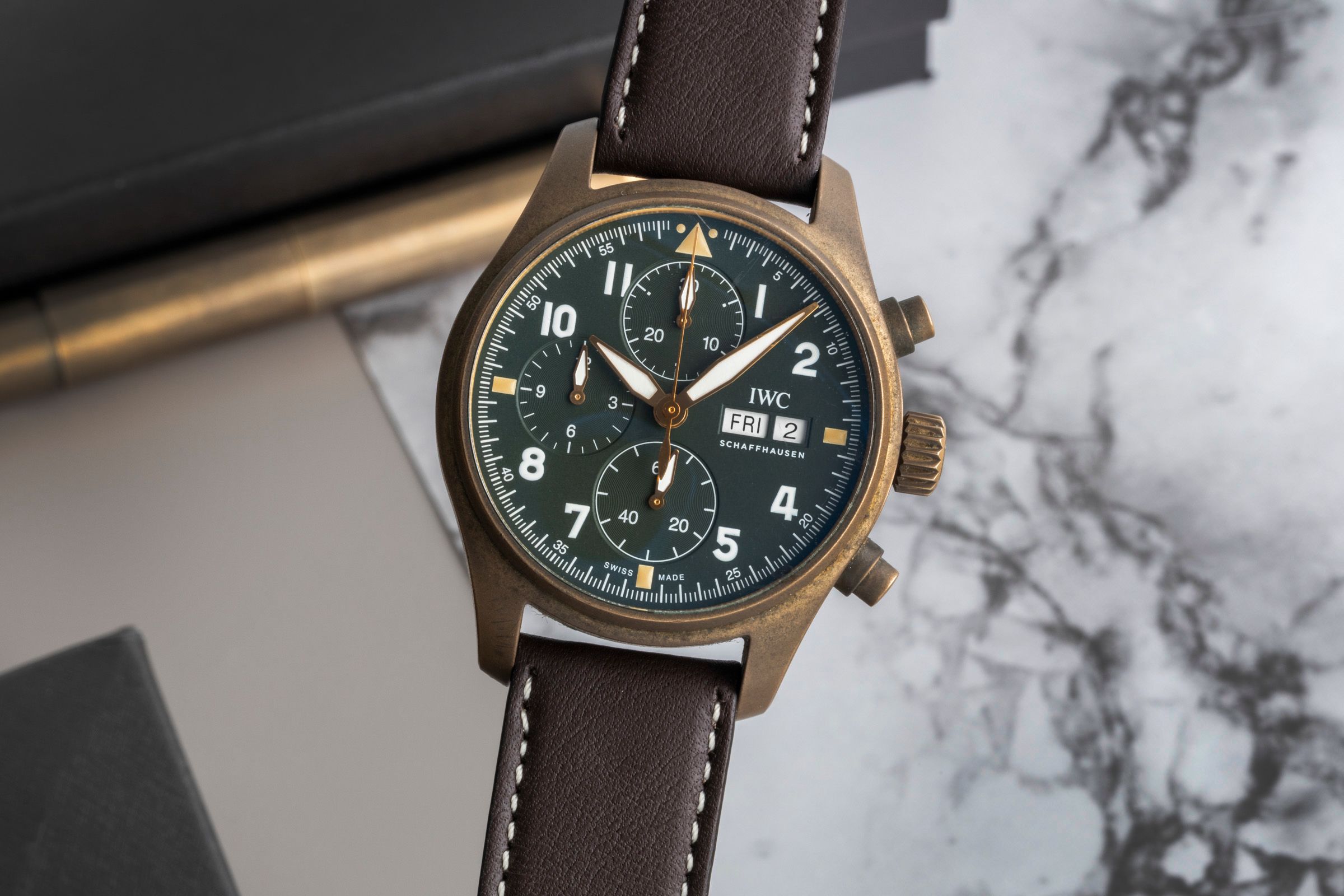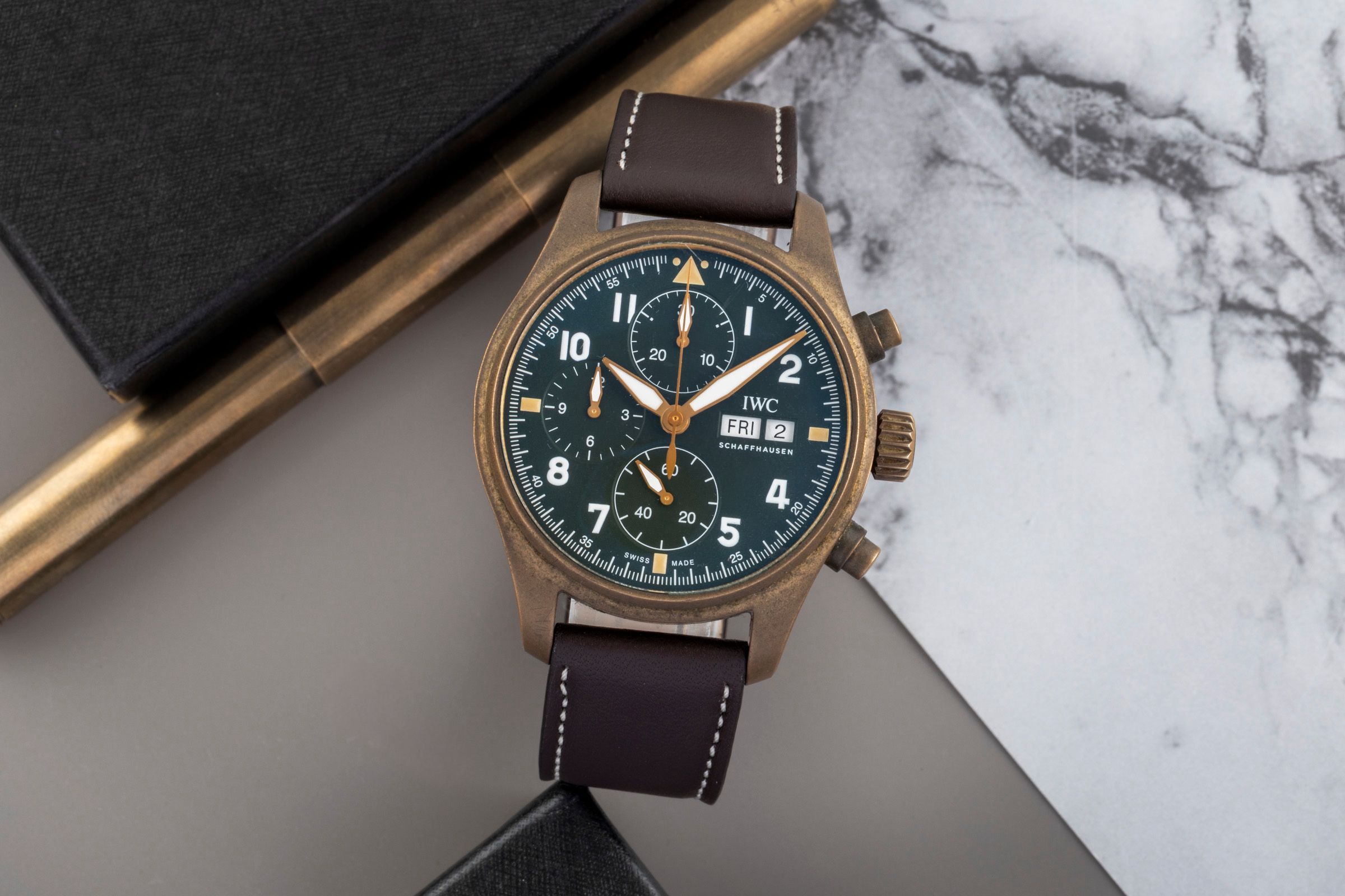 Alternative title: IWC IW387902 Pilot's Watch Spitfire Chronograph - - Spitfire Bronze / Green; IWC Fliegerchronograph Spitfire Chronograph Bronze Ref. IW387902 B&P NP: 7800 € [2507018]