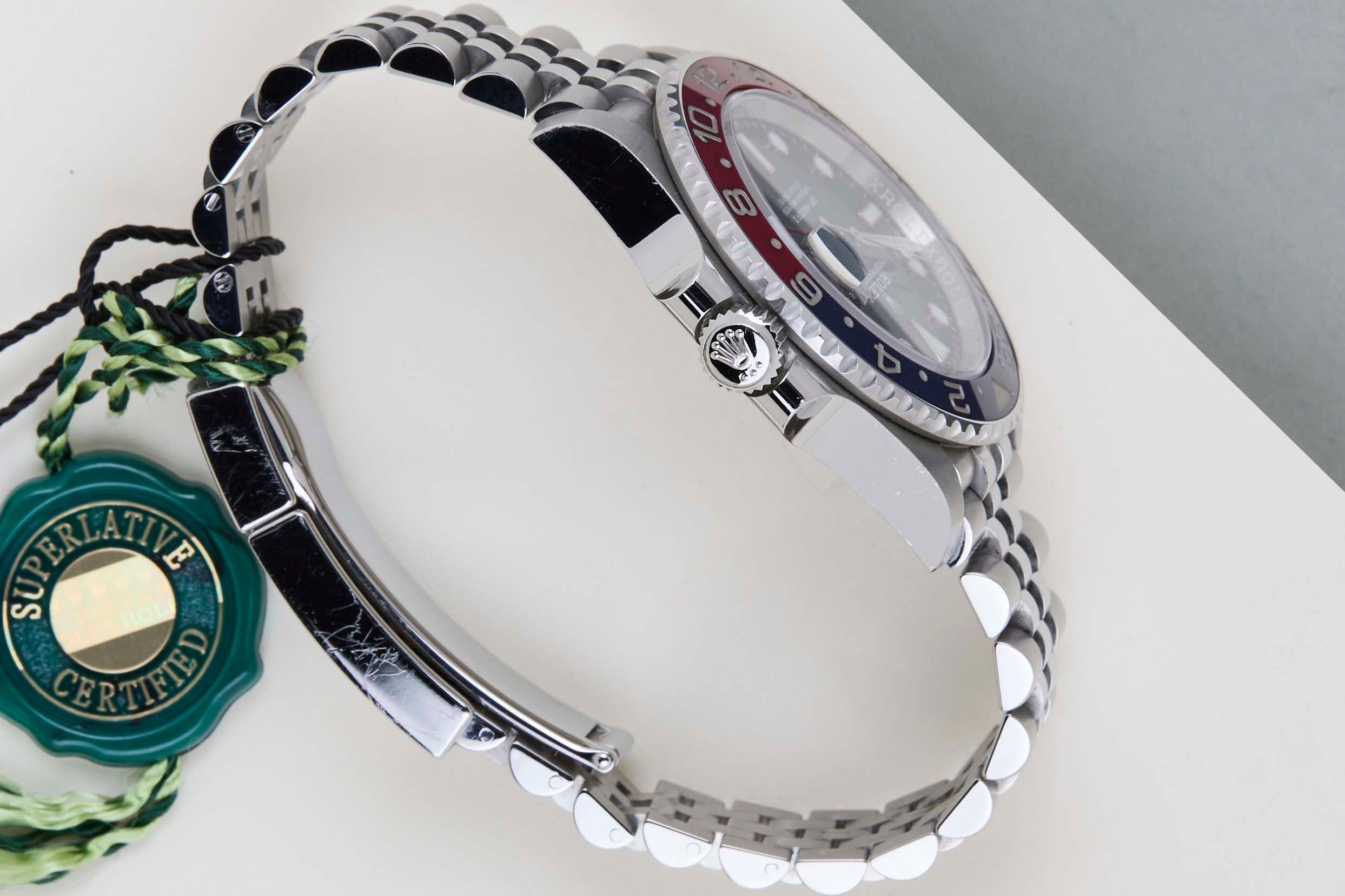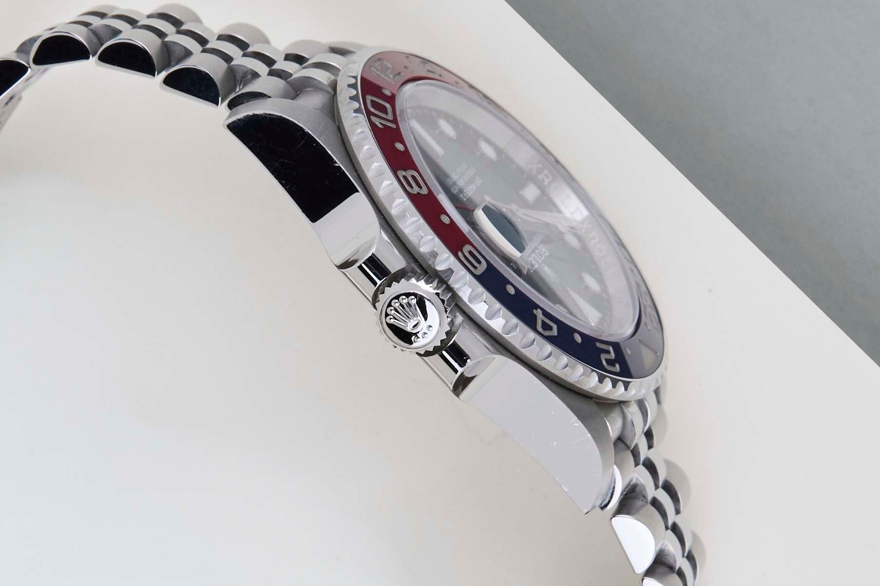 Full Set | Unpolished Condition The Rolex GMT was originally designed in collaboration with Pan American Airways and issued to their crews on long-haul flights. The dual time zone can track local and home time, which is a useful tool for pilots and those who are traveling a lot across different time zones.The reference 126710 is the second generation of the GMT-Master II with a Ceramic Bezel. The material to make this bezel is called 'Cerachrom', which was developed completely in-house by Rolex to be highly scratch-resistant.This GMT is equipped with the Red and Blue Bezel, which can be derived from the reference 126710BLRO, Lunette Blue Rouge.This Rolex GMT-Master II 'Pepsi - Jubilee' was sold for the first time in November 2020.This GMT-Master is made of stainless steel and is fitted with a Jubilee bracelet, which is equipped with the Easylink. This extension, allows the wearer to either extend or shorten the bracelet by 5 millimeters, improving the wearability and usability of the watch.This Rolex GMT-Master II is in Unpolished condition and comes with the original Rolex Warranty Card and Box. Furthermore, the watch has been serviced by our watchmaker, and therefore it comes with one year of Steiner warranty.