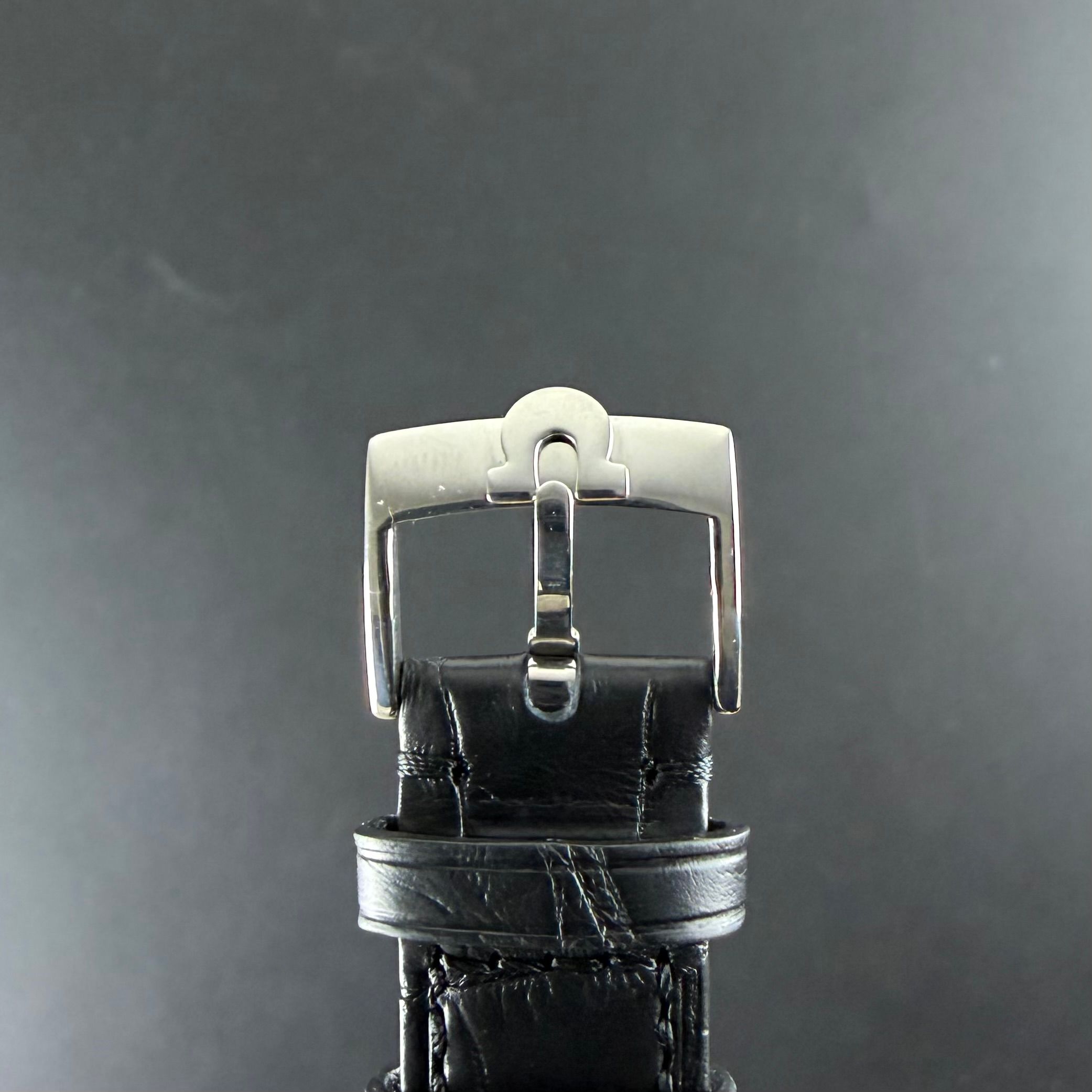 This vintage Omega Constellation, produced for the Japanese market, features the iconic “Pie Pan” dial with sloping edges and “Dog Leg” lugs, giving it a distinct searched for look.The 34mm stainless steel case houses the caliber 1011 automatic movement, seen on this specific reference, in contrast to the 500-series movements in European and American models. The watch comes on a black calf leather strap with a alligator grain, perfectly complementing its vintage aesthetic.