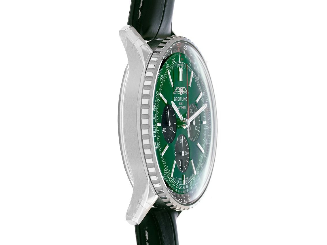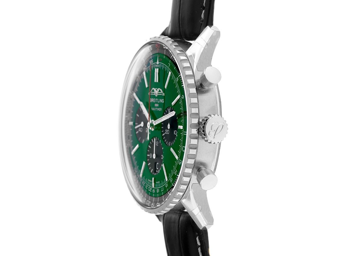 Behuizing gepolijst staal, behuizingsdiameter zonder kroon 46mm, behuizingshoogte 13,9mm. Lunette van geribbelde staal met onderglas rekenliniaal, aan beide zijden draaibaar. Armband van zwart krokoleder met lichte siernaad, aanzetbreedte 24mm, Breitling veiligheidsvouwsluiting van staal met fabrikantlogo. Wijzerplaat groen met opgezette stalen luminescerende indexen en stalen luminescerende wijzers. Uurwerk automatisch, chronograaf, chronometer met certificaat, Breitling manufactuurkaliber B01 met 47 edelstenen, gangreserve van ongeveer 70 uur. Weergave van uur en minuut via centrale wijzers, kleine seconde met seconde-stop voor nauwkeurige tijdinstelling bij 9 uur, datumaanduiding met snelle instelling bij 6 uur. Saffierglas krasbestendig, dubbelzijdig antireflecterend en gebombardeerd. Kroon met fabrikantlogo. Achterkant van staal, geschroefd en gegraveerd met saffierglas kijkvenster. Gewicht van het horloge inclusief armband 113g. Waterdicht tot 3 ATM. Referentienummer: AB0137241L1P1, ID: ST1160128361225H-9500, Artikelnummer: 10000083959. Originele Breitling doos en garantiepapieren van 2025, Full Set. Ongedragen. Levertijd onmiddellijk.