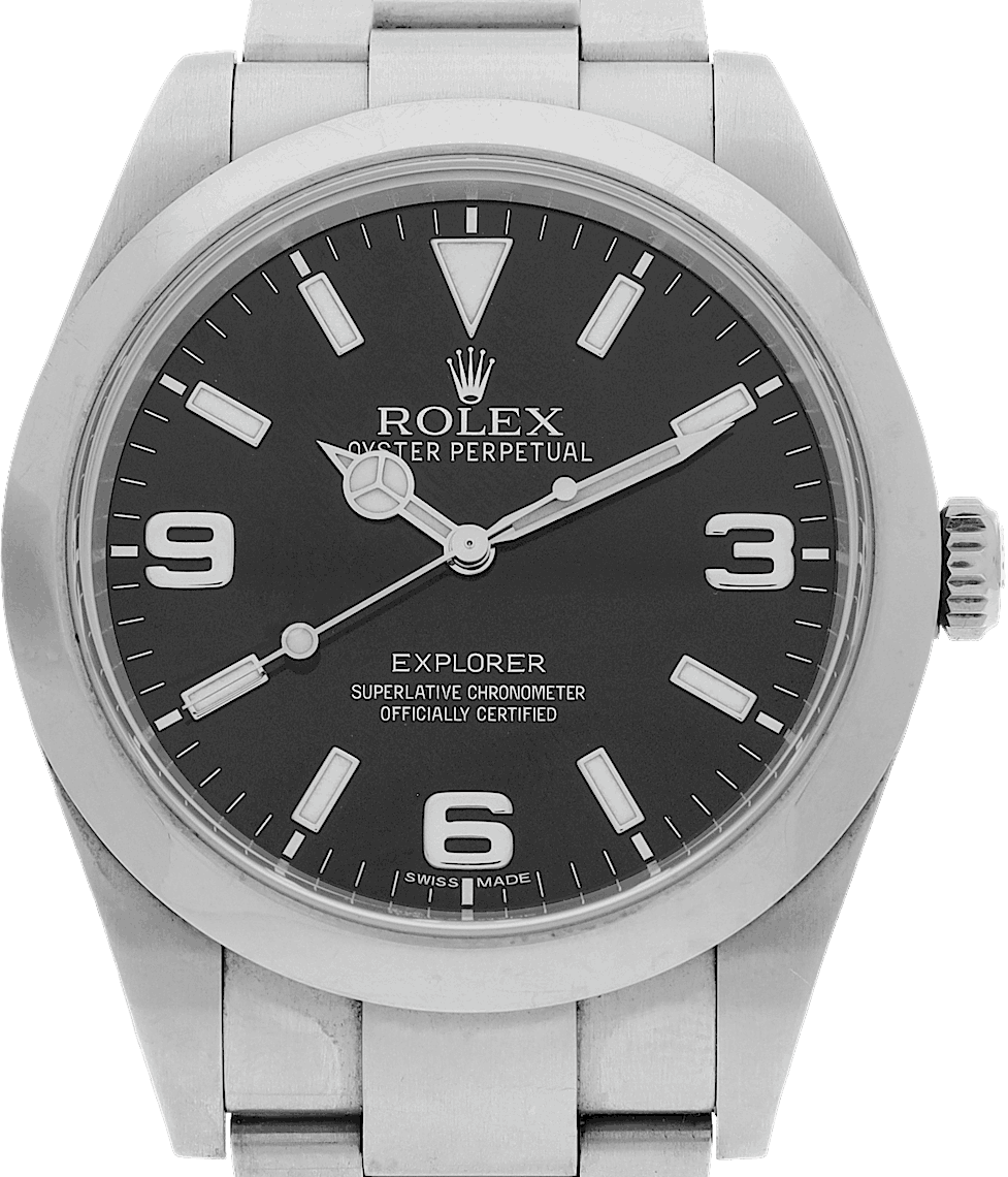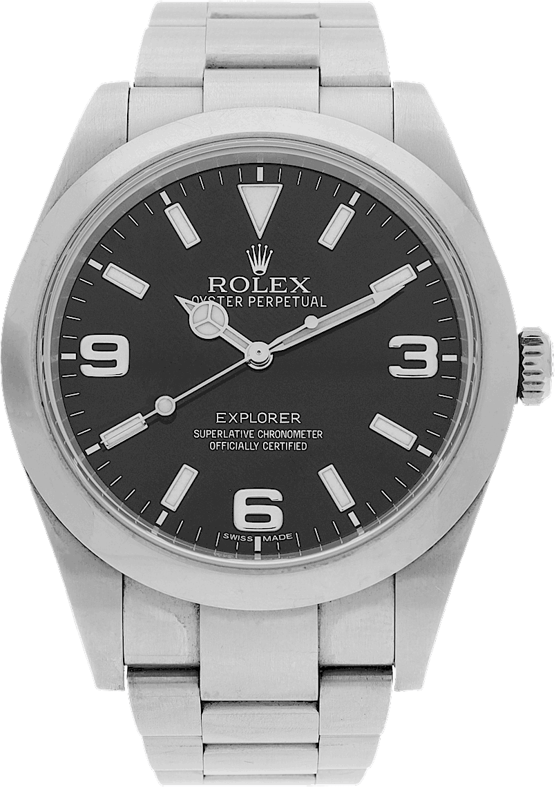 Rolex Explorer I, Reference: 214270, Gender: Male, Size: 39mm, Dial color: Black, Strap material: Stainless Steel, Movement: Automatic, Year: 2015, Condition: Previously worn with some signs of usage. The movement is flawless and the case has been cleaned. watch tested to ensure full functionality. An inspection by our certified watchmakers guarantees its authenticity., Documents: Original papers, CHRONEXT Certificate