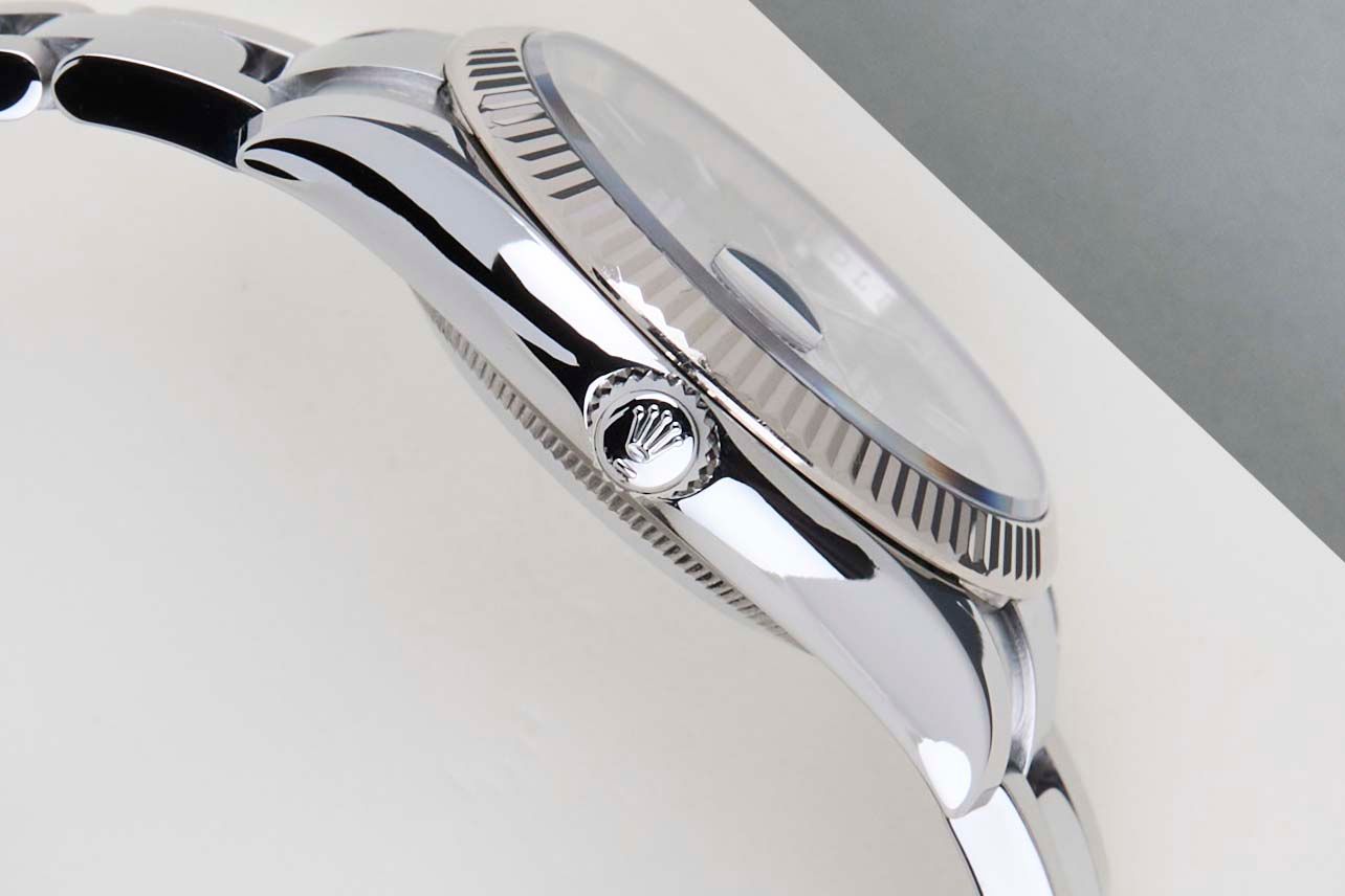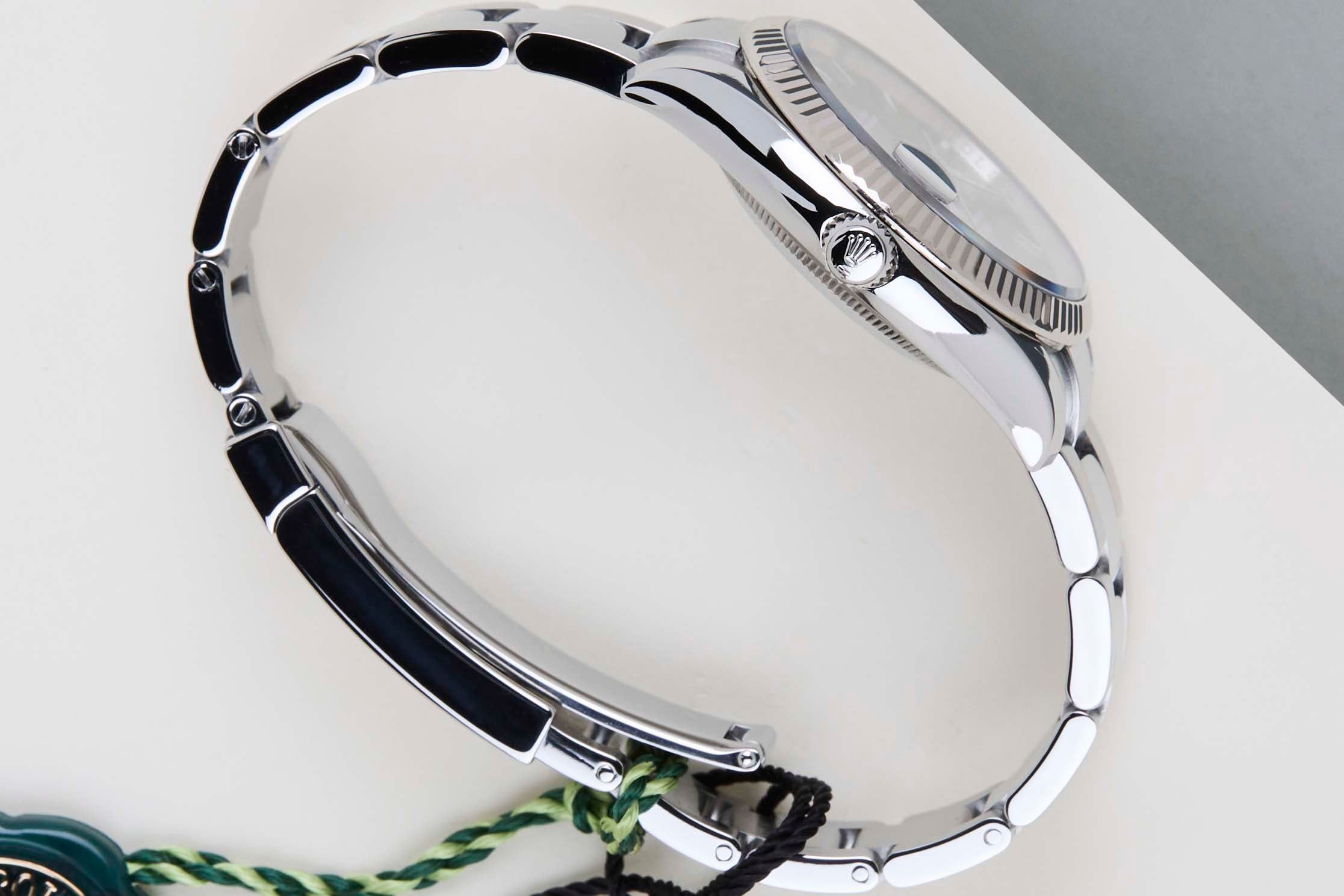 Deze Rolex Date 34 is in mint conditie en wordt geleverd met de originele Rolex Garantiekaart en doos. Bovendien is het horloge gecontroleerd door onze horlogemaker, en daarom komt het met een jaar garantie.