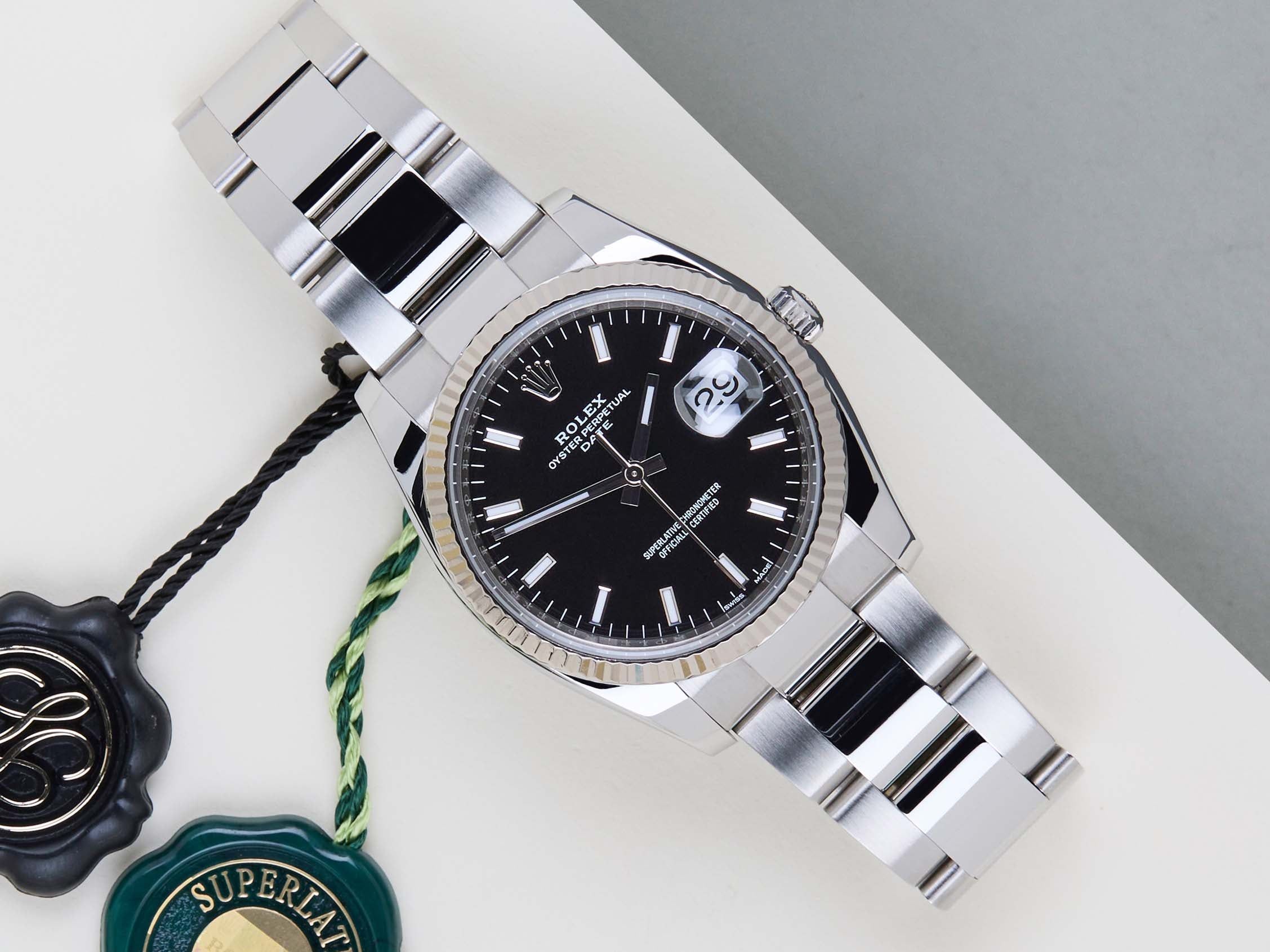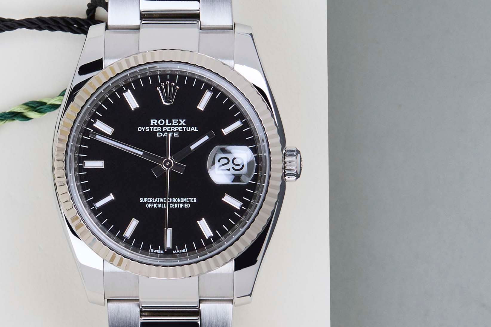 Deze Rolex Oyster Perpetual Date 'Zwarte Wijzerplaat' werd voor het eerst verkocht in augustus 2021. Het horloge is volledig gemaakt van roestvrij staal en witgoud. Rolex gebruikt 904L in zijn stalen horloges, wat een extreem resistente en hoogglanzende superlegering is. Het horloge is uitgerust met een klassieke 'Zwarte Wijzerplaat'.