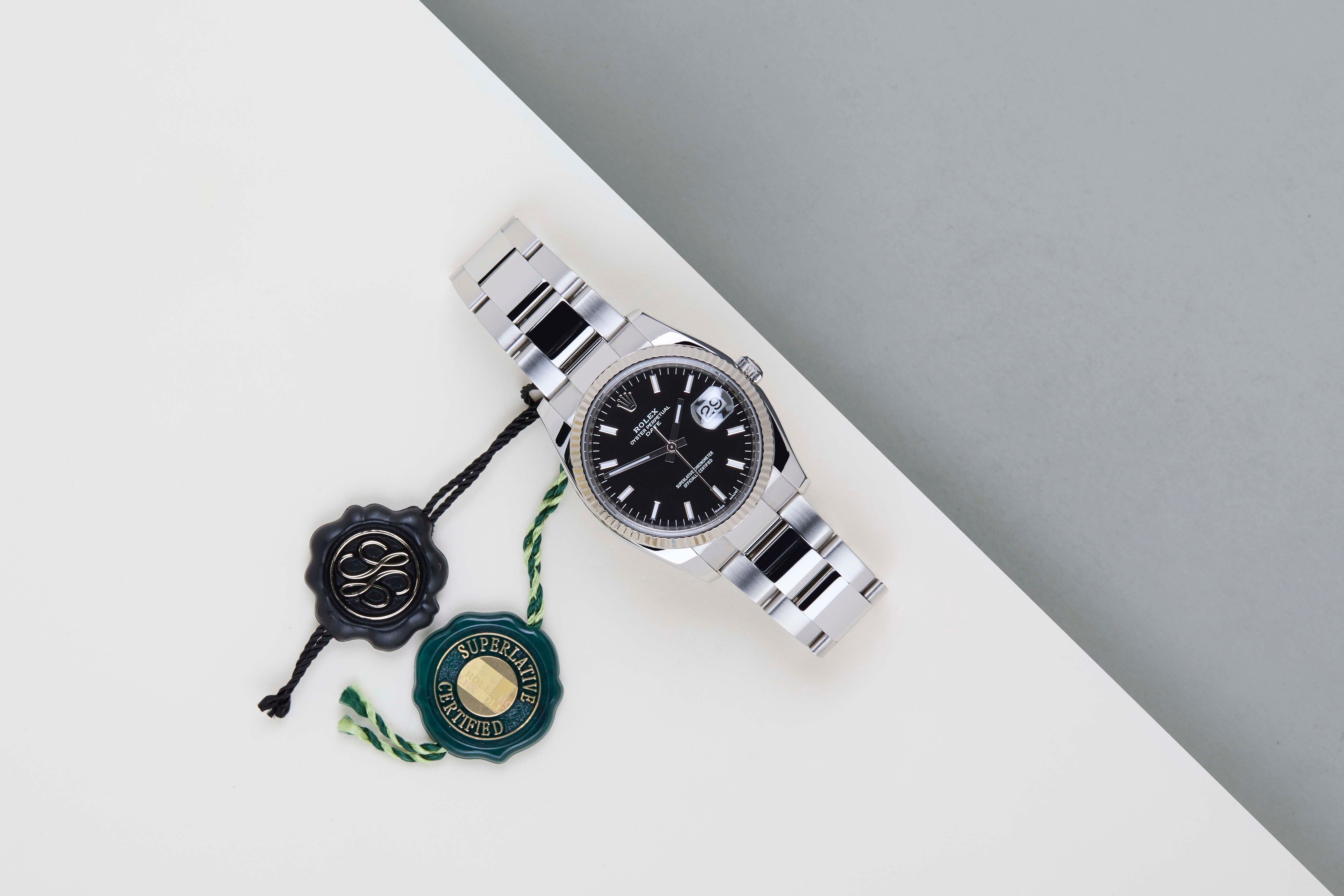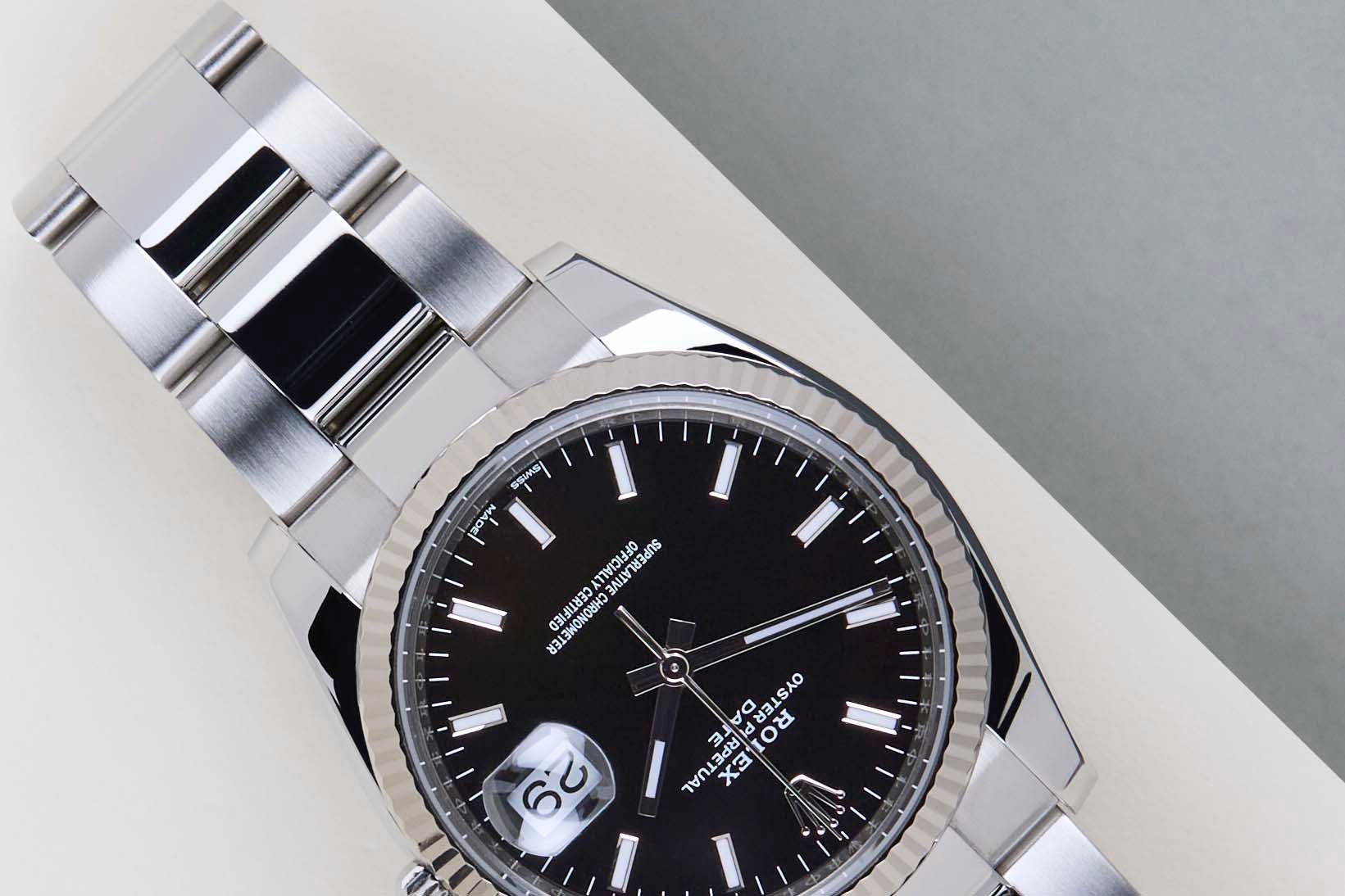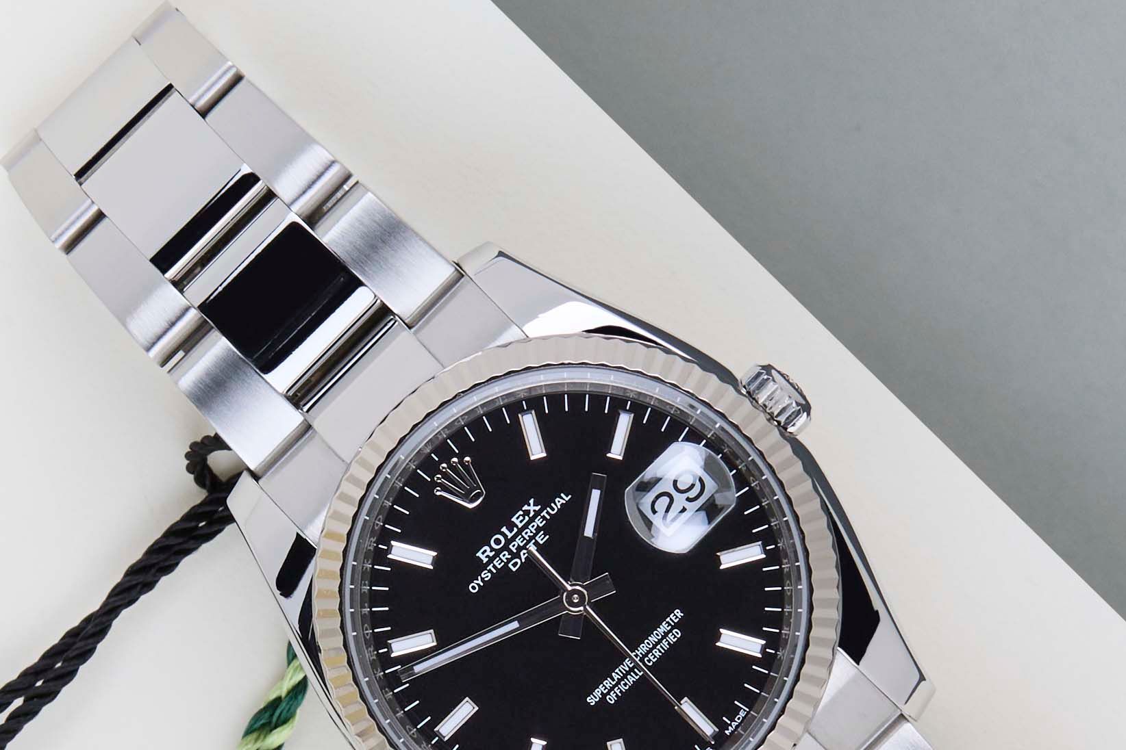 Full Set | International Rolex Warranty Until August 2026The Rolex Oyster Perpetual was first introduced by Rolex in the 1930s. It is characterized by its water-resistant Oyster case and self-winding Perpetual movement. The Rolex Oyster Perpetual a simple, yet elegant timepiece that is suitable for both casual and formal wear.This Rolex Oyster Perpetual Date 'Black Dial' was sold for the first time in August 2021.The watch is fully made out of stainless steel and White Gold. Rolex uses 904L in it’s steel watches, which is an extremely resistant and highly polishable superalloy. The watch is equipped with a classic 'Black Dial'.This Rolex Date 34 is in Mint Condition and comes with the original Rolex Warranty Card and box. Furthermore, the watch has been checked by our watchmaker, and therefore it comes with one year of warranty.